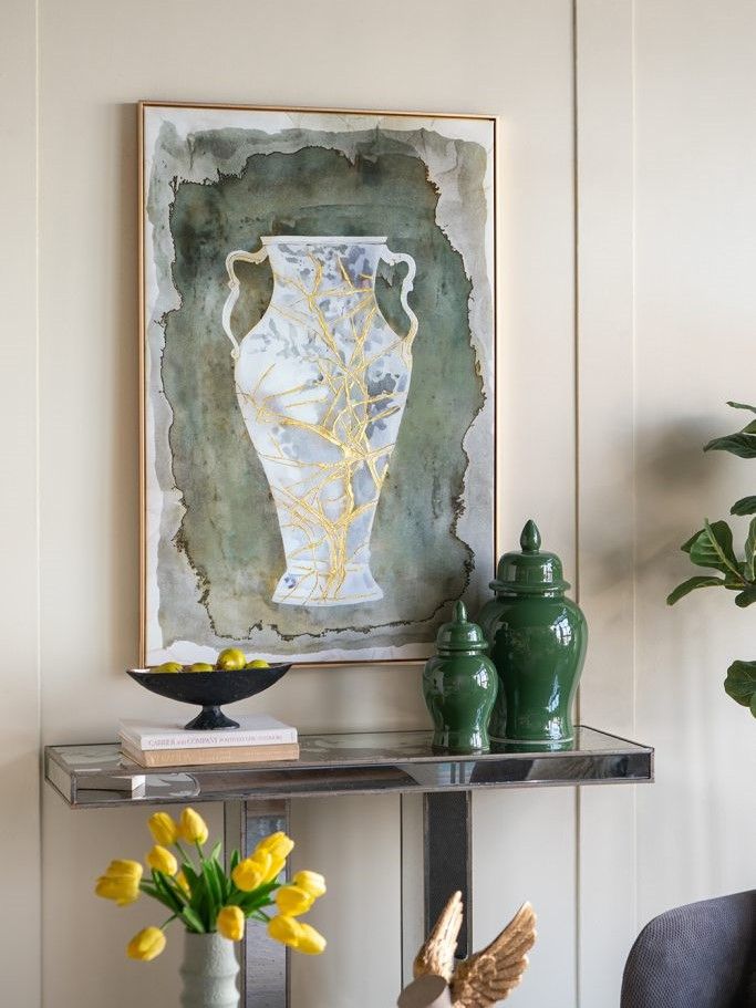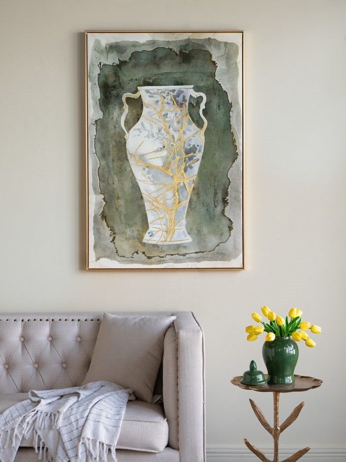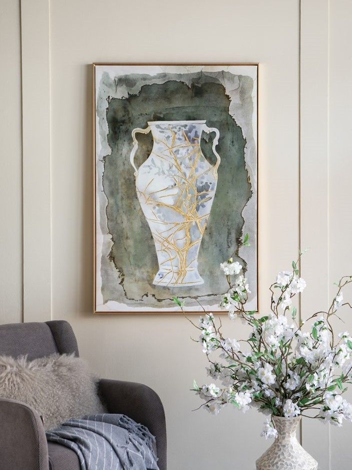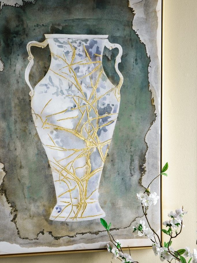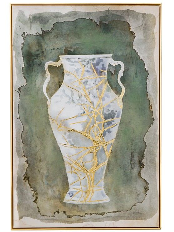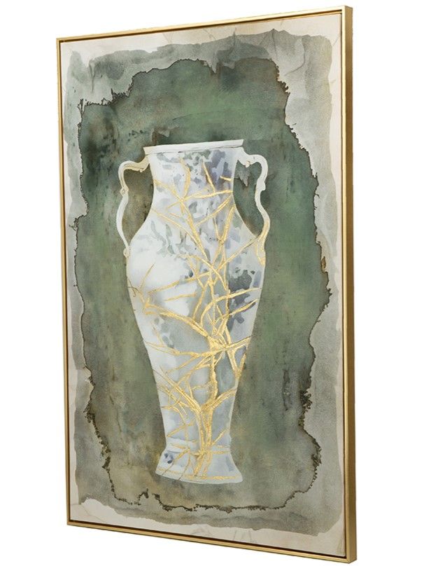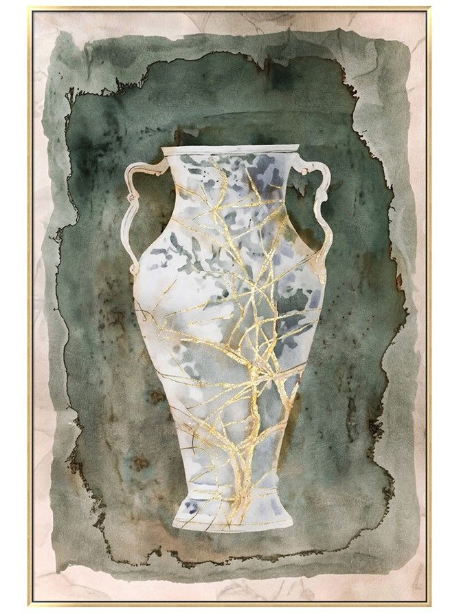 Настенное произведение искусства, созданное вручную и отдающее дань вечной красоте Древней Греции, изображает изящные изгибы классической амфоры в синих и золотых тонах на землистом фоне.