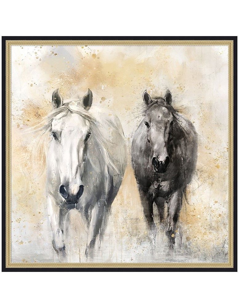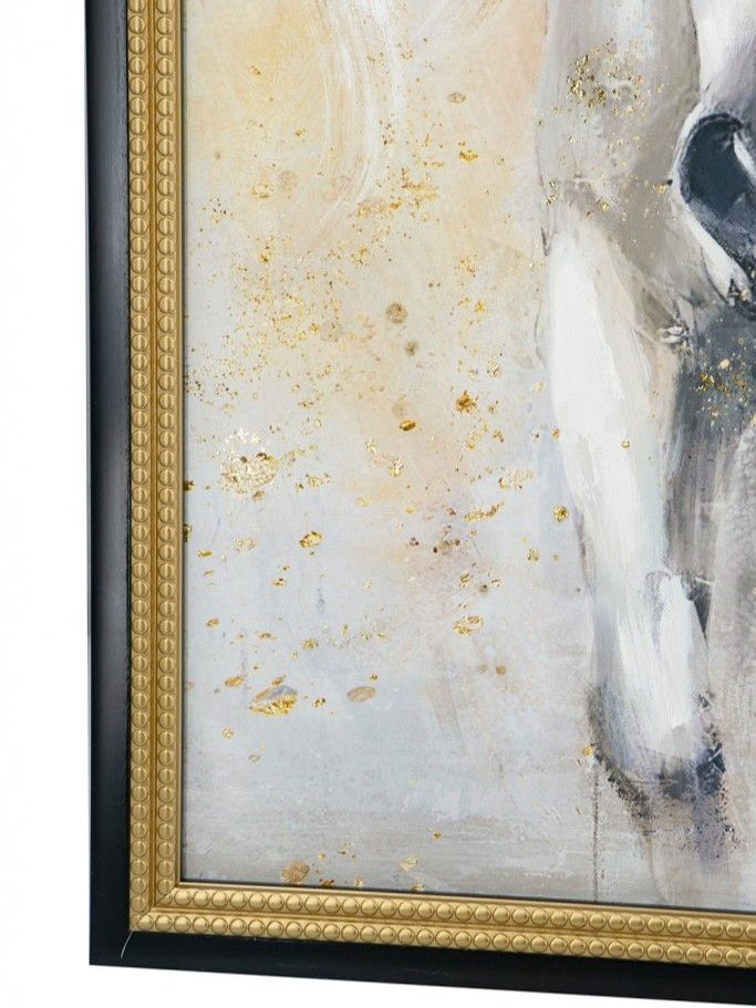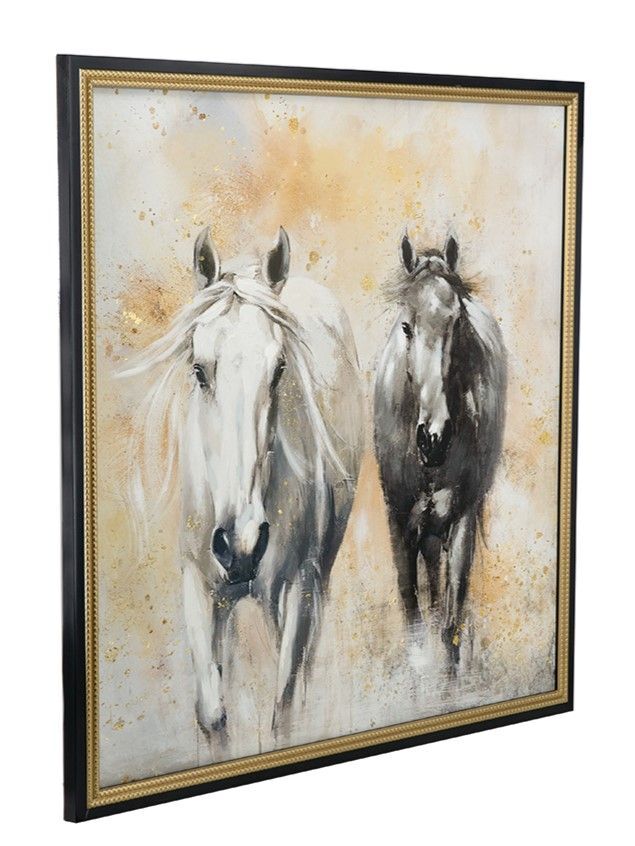 Произведение искусства в золотисто-черной раме, мастерски передающее необузданную силу природы, представляет двух скачущих лошадей, нарисованных вручную с реалистичными деталями. На фоне видны бежевые пятна, создающие ощущение динамичного движения. Нейтральная цветовая гамма позволяет этому изделию дополнять интерьеры в стиле кантри, рустикальном, бохо и модерн, обеспечивая его гармоничную интеграцию в любую обстановку.