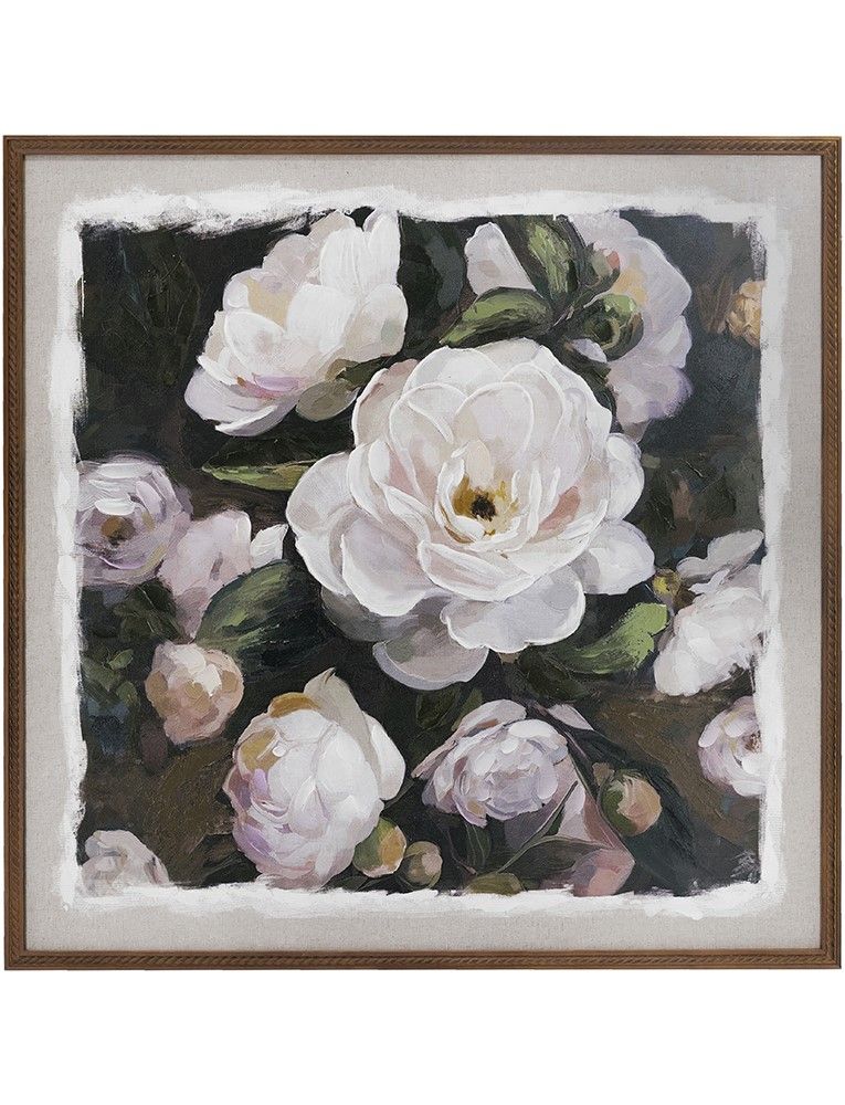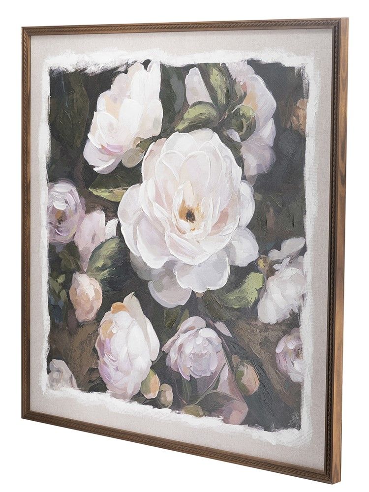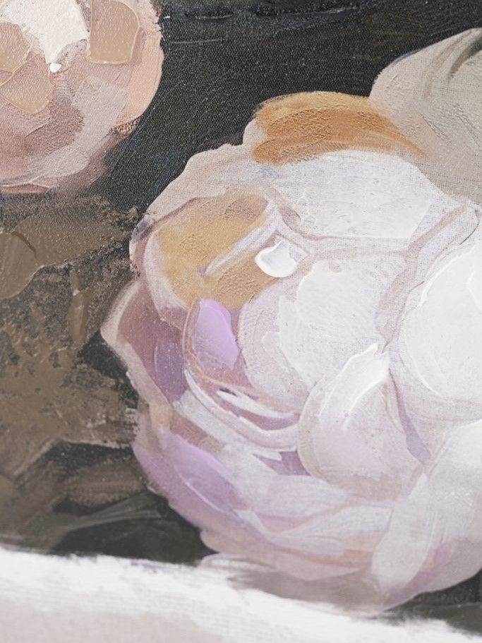 Картина с яркими белыми пионами на богатом серо-коричневом фоне, обрамленным фактурной рамой из натурального дерева, добавит гламура и современного стиля вашему пространству. Преобразите интерьер в вашем доме с помощью этой потрясающей композиции, которая будет элегантно смотреться в спальной комнате, гостиной или фойе.