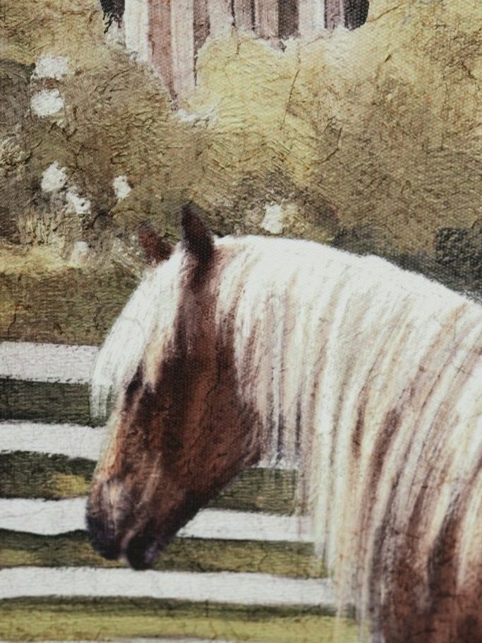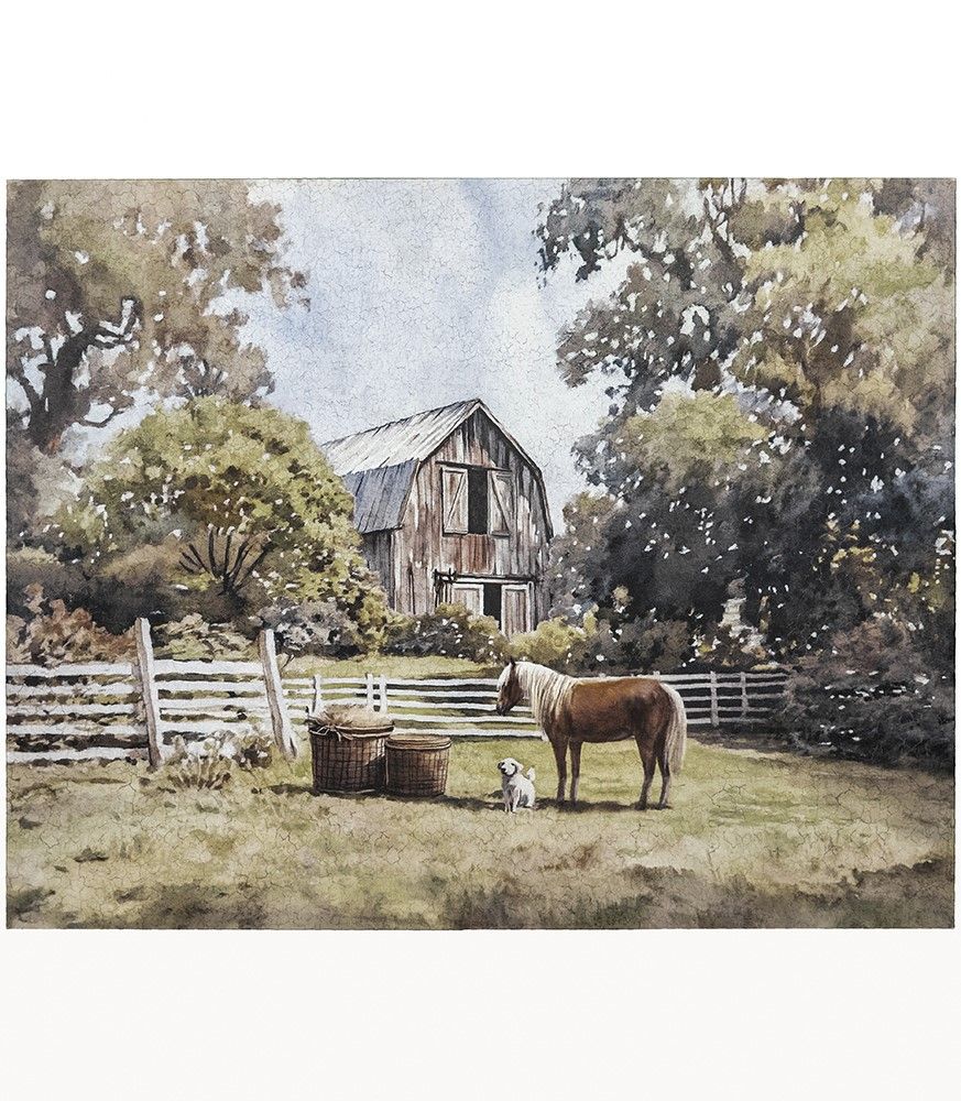 Картина с изображением природных просторов, выполненная на холсте и вдохновленная винтажными деревенскими пейзажами, демонстрирует уютную сцену с фермерским амбаром, пышными зелеными деревьями под тихим голубым небом и гармонично пасущейся лошадью. Разместите этот картину в гостиной, прихожей или спальной комнате, сдержанные цвета и природный пейзаж обязательно привлекут внимание ваших гостей, органично дополняя современный, фермерский, деревенский и традиционный стили.