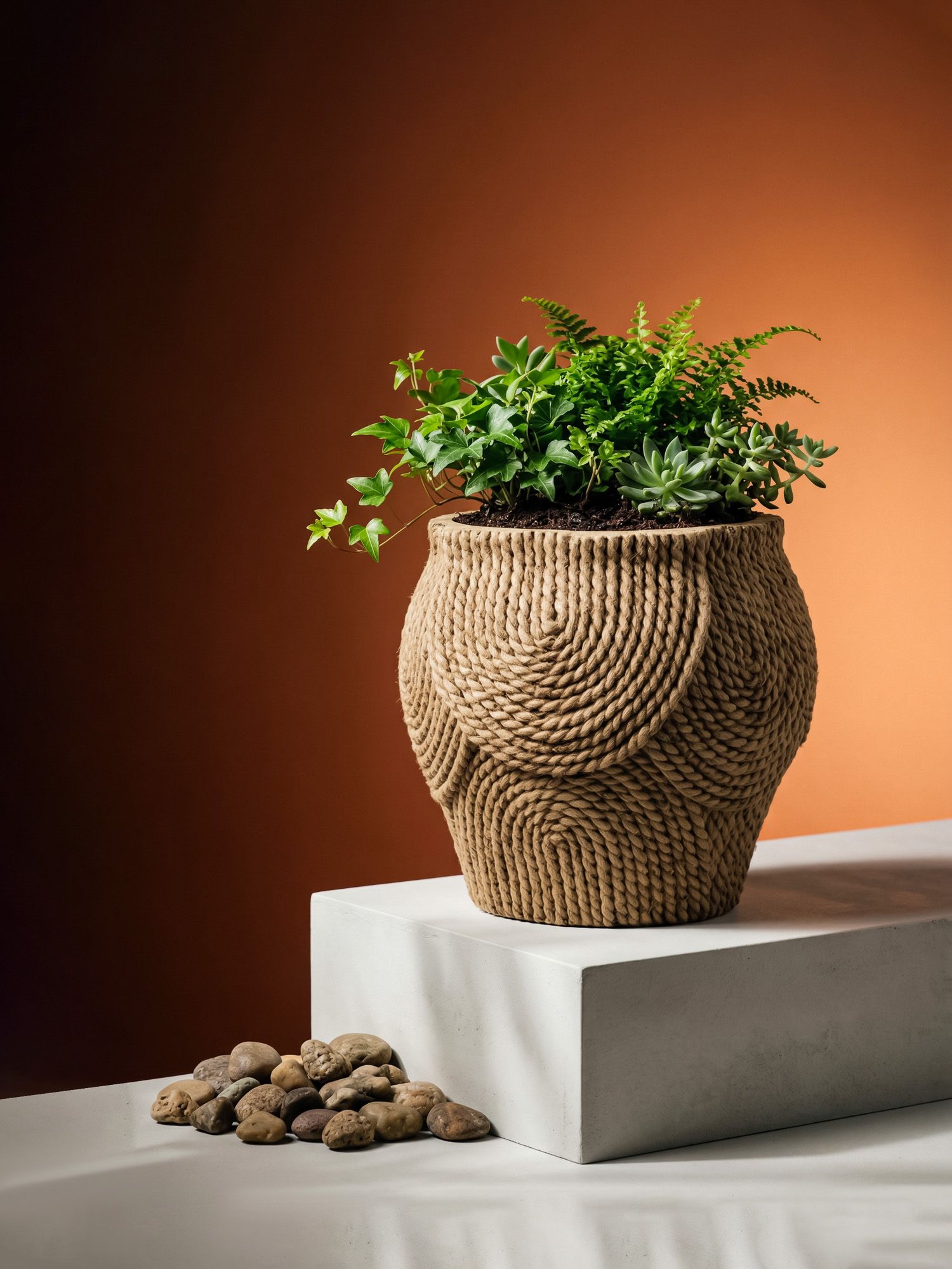 Интересное кашпо, изготовленное из цемента в винтажном стиле, представляет собой классический округлый силуэт, текстурную фактуру в виде отделки веревочным орнаментом с коричневым оттенком. Изделие идеально смотрится как в отдельности, так и в сочетании с красочной коллекцией суккулентов или ампельных растений. Кашпо украсит любую гостиную, столовую или прихожую. Цветовая гамма и интересные узоры позволяют этому изделию дополнять интерьеры в стиле бохо, рустик, фермерский стиль и арт-деко, органично вписываясь в любую обстановку дома.
