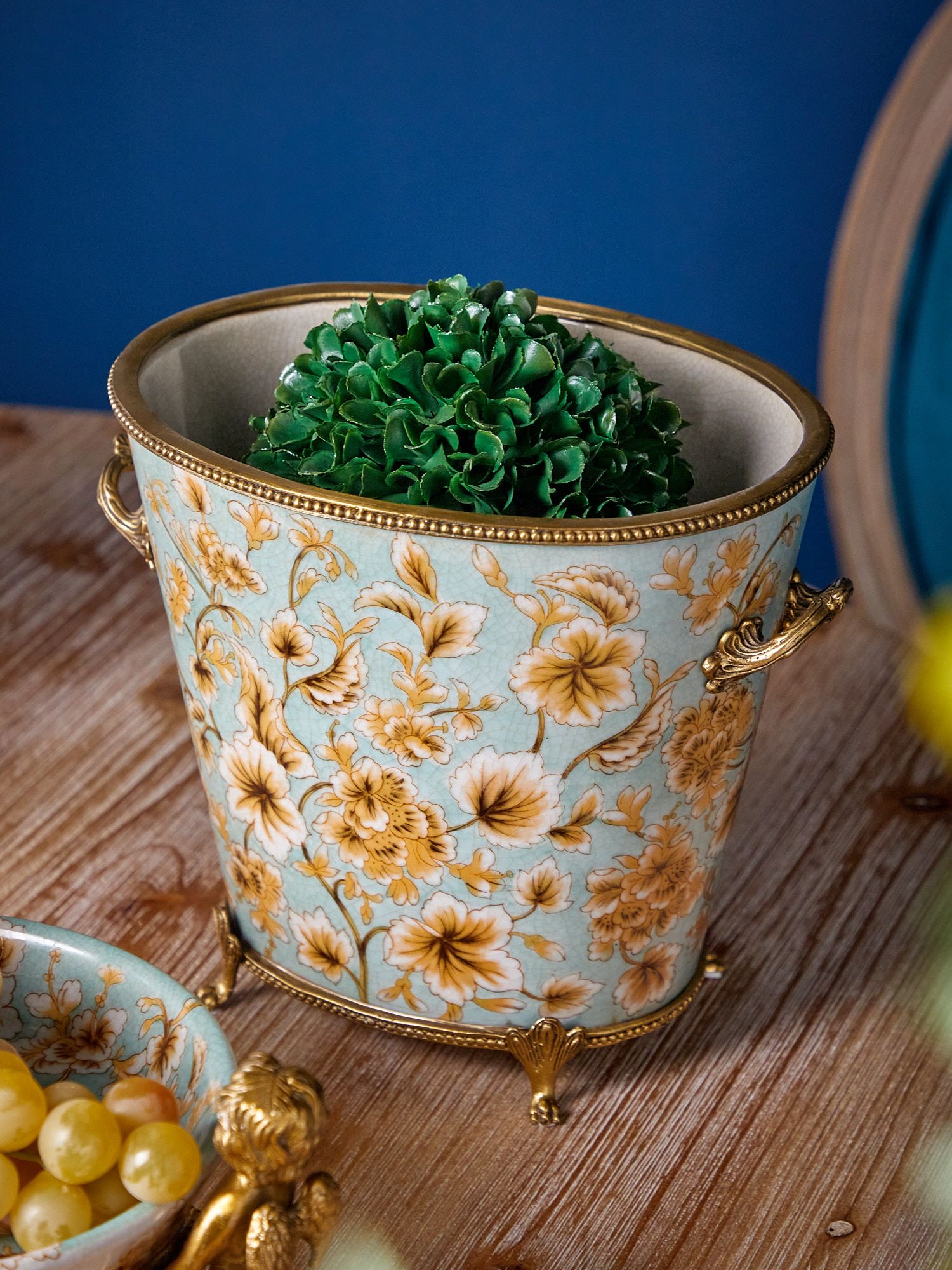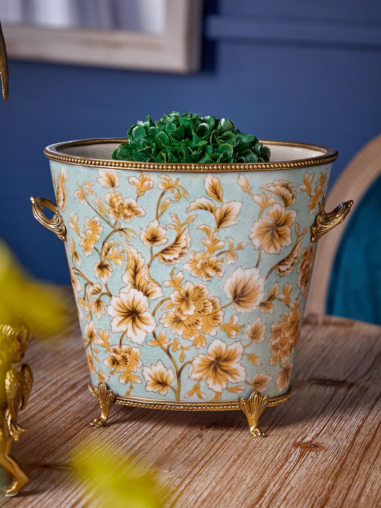 Кашпо, выполненное из фарфора с бронзовыми элементами. Уникальное изделие ручной работы. При производстве этих художественных изделий из фарфора с бронзой используются вековые традиции китайских мастеров. Видимые трещинки (кракелюры) делаются по уникальной технологии, что придает более благородный вид старинного изделия.