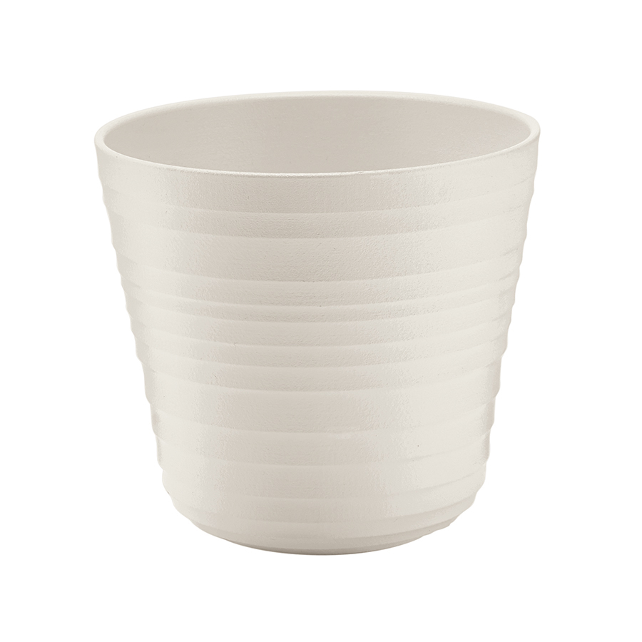 "Кашпо для комнатных растений выполнено из переработанного пластика. Дизайн изделия напоминает керамику, а реалистичности внешнему виду придают тщательно подобранные пастельные тона и неровные круговые узоры, создающие эффект ручной работы.