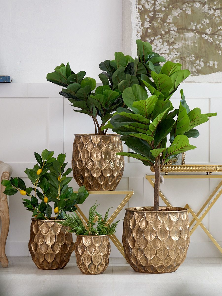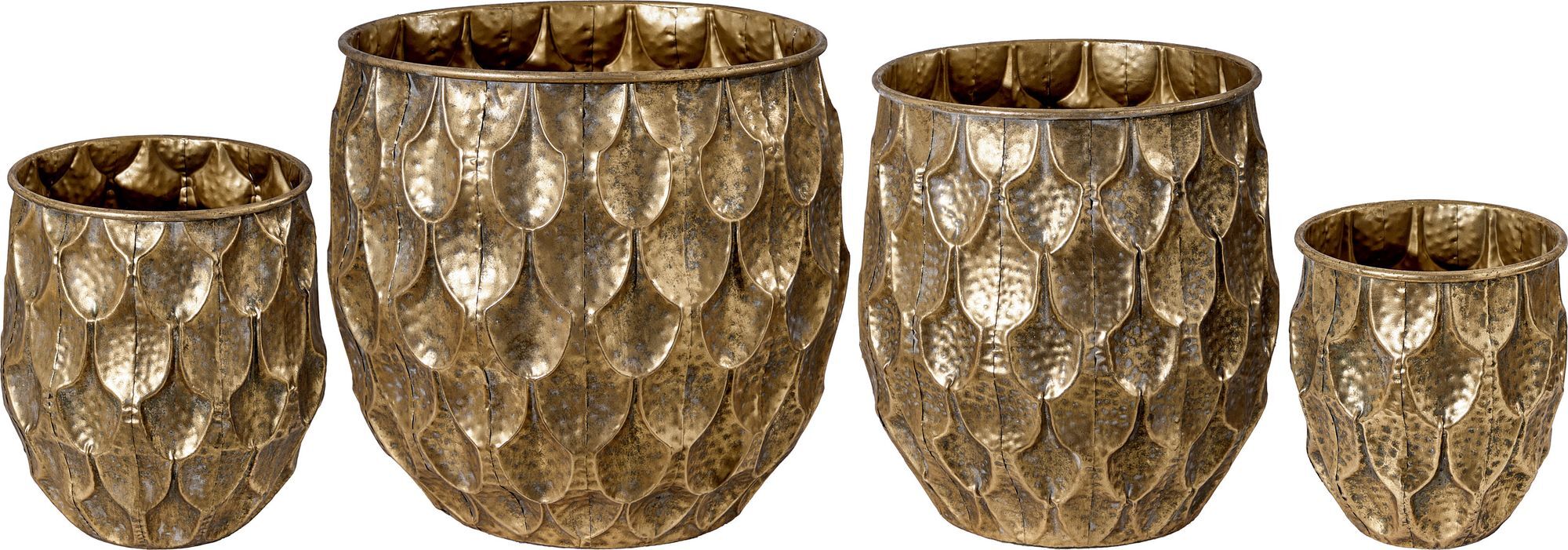 Набор из четырех кашпо Эфиопия, выполненных из металла с эффектом под старину, напылением золотистого цвета и фактурной отделкой. Цветочные композиции из сухоцветов, размещенные в эти кашпо, создадут необычный образ в вашем интерьере. Эксклюзивные формы и фактуры навеяло богатство культуры Африки, множество художественных традиций и таинственная атмосфера, окутывающая неподражаемостью. Изделия имеют признаки искусственного состаривания, поверхности декорированы с эффектом патинирования, а наличие сварочных швов подчеркивают принадлежность к ручной работе.