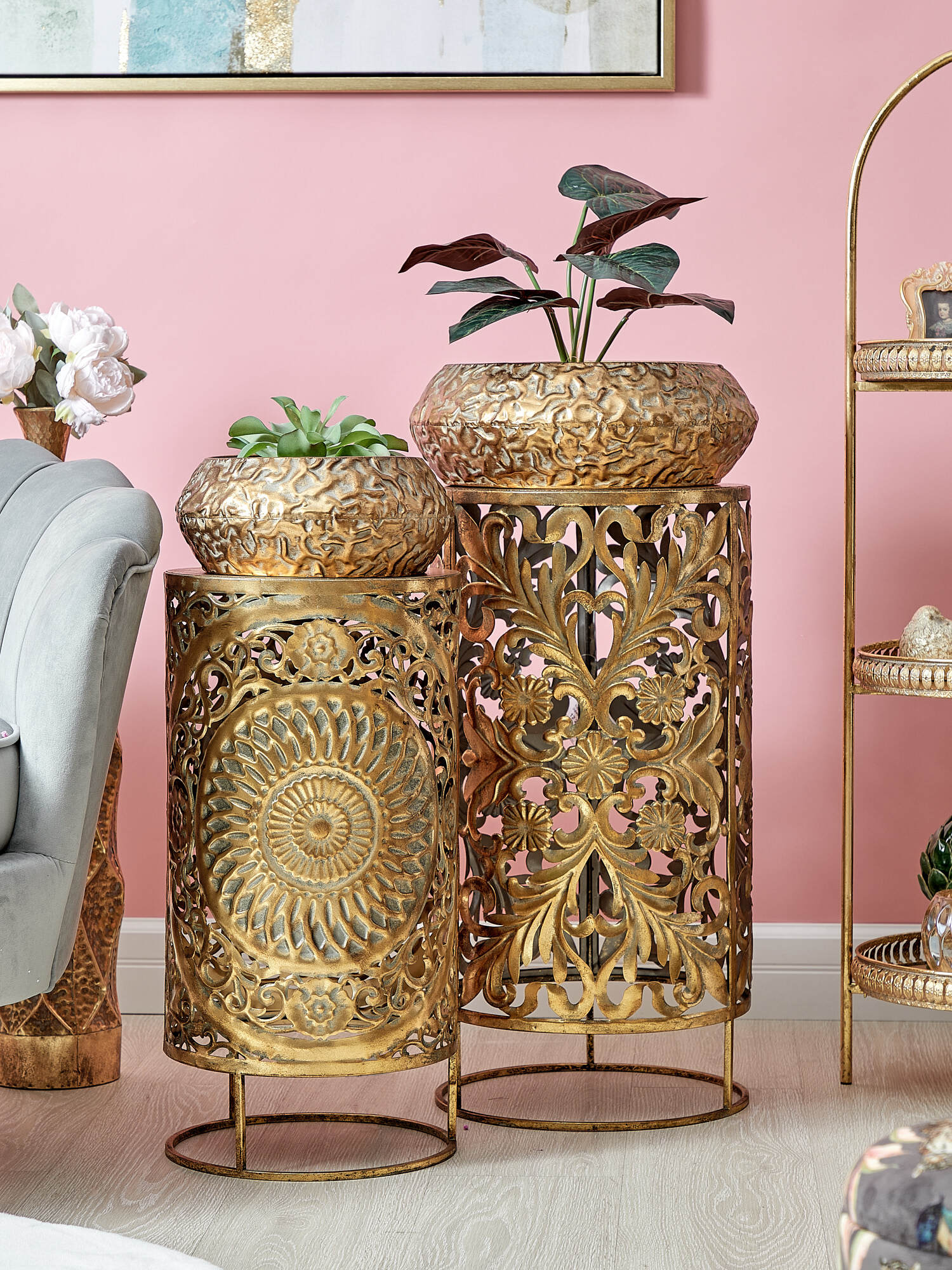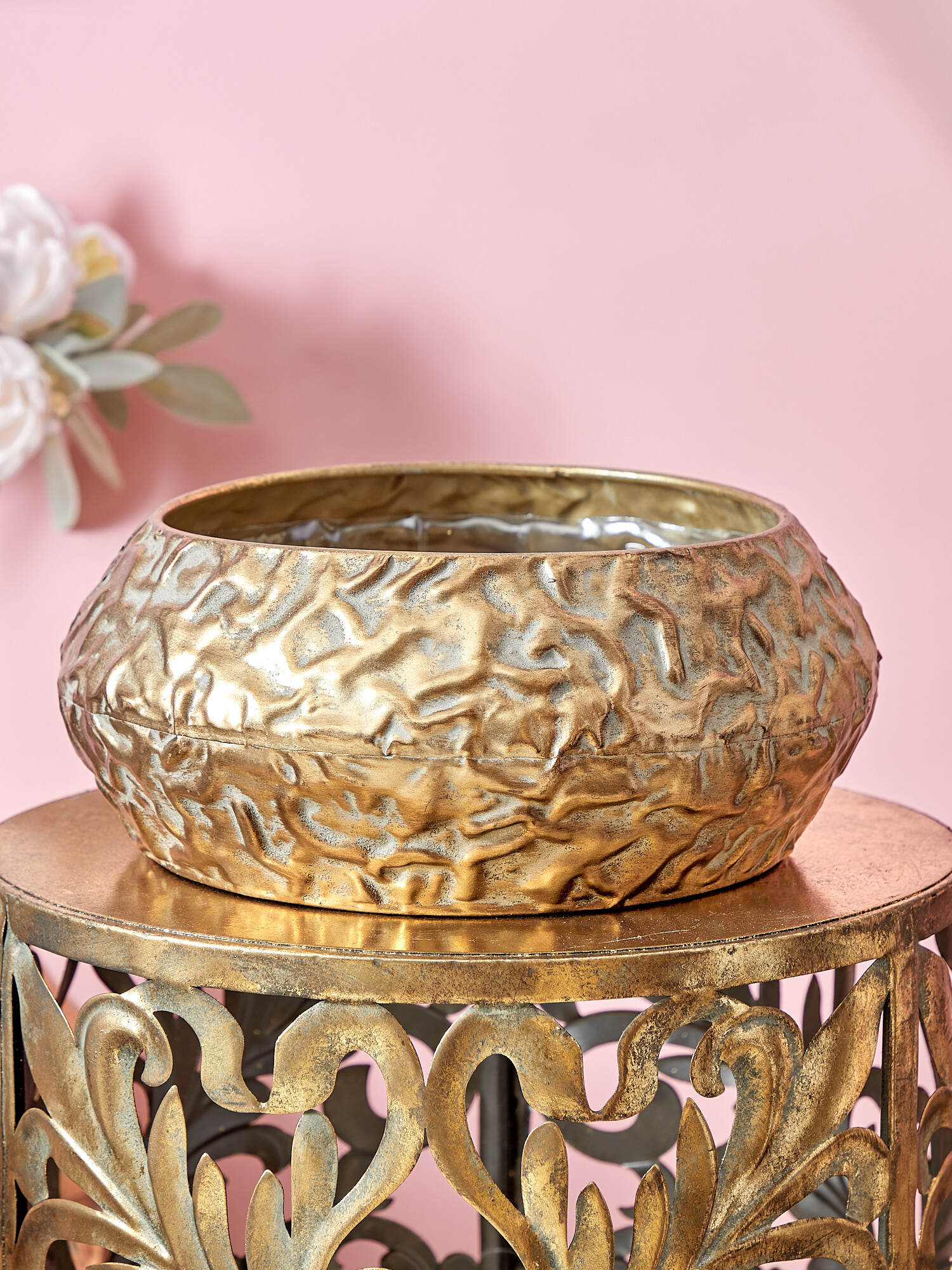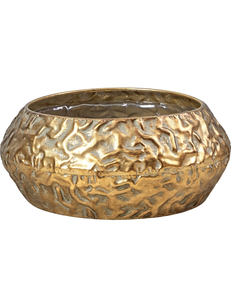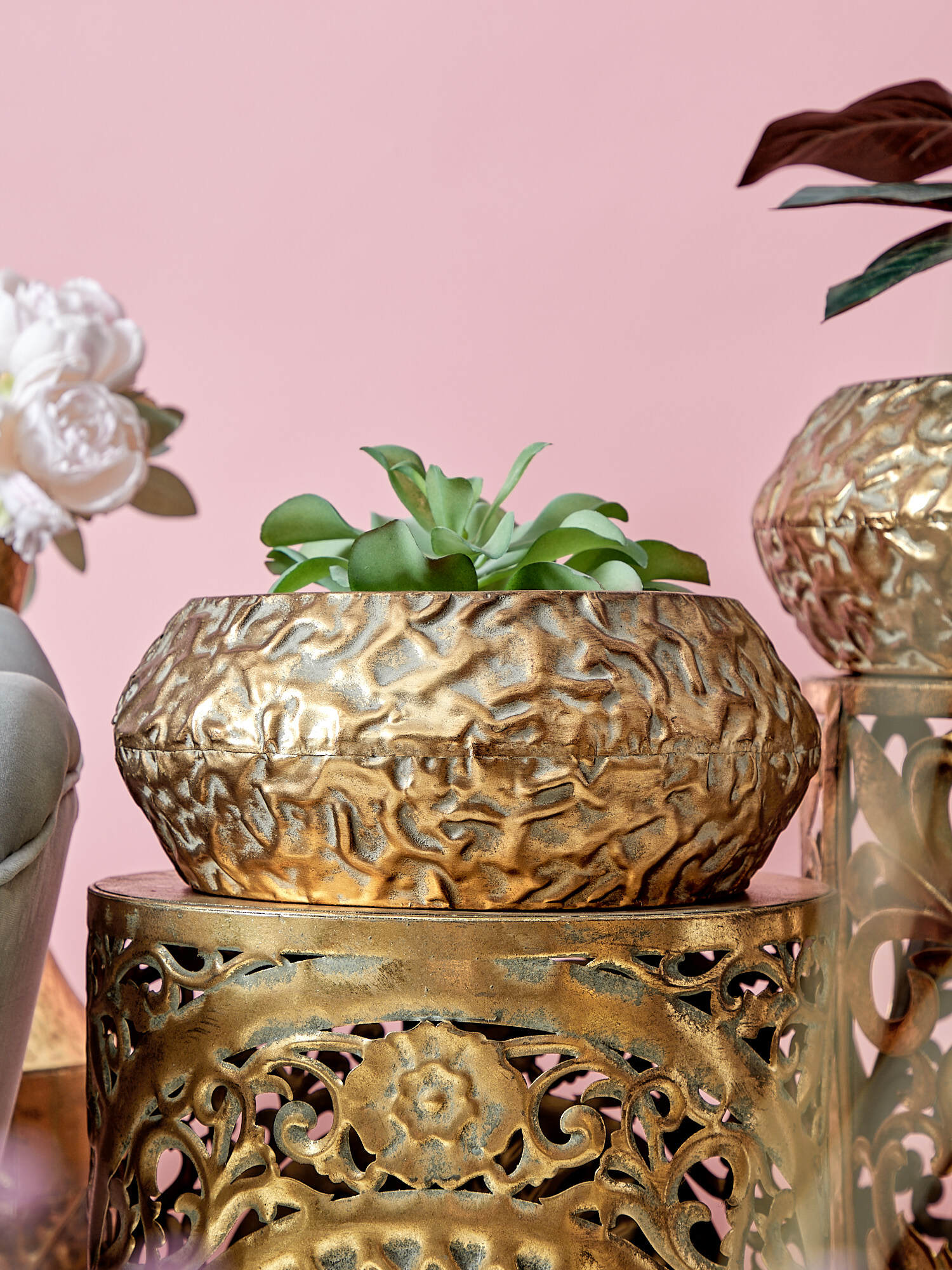 Кашпо Гана, выполненное из металла в африканском стиле с напылением золотистого цвета. Изделие имеет признаки искусственного состаривания, поверхность декорирована с эффектом патинирования, а наличие сварочных швов подчеркивают принадлежность к ручной работе. Цветочные композиции из сухоцветов, размещенные в это кашпо, создадут необычный образ в вашем интерьере. Эксклюзивные формы и фактуры навеяло богатство культуры Африки, множество художественных традиций и таинственная атмосфера, окутывающая неподражаемостью.