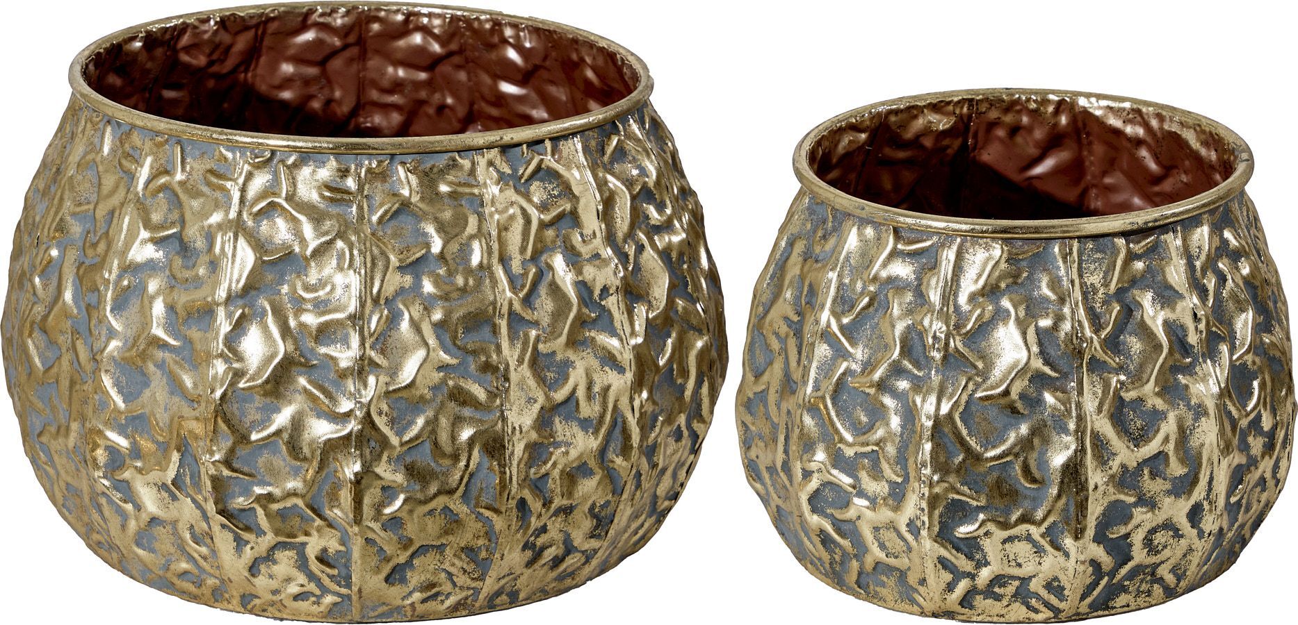 Набор из двух кашпо Гана, выполненных из металла в африканском стиле с напылением золотистого цвета, создан для сухоцветов и искусственных цветочных композиций. Растения, размещенные в эти кашпо, произведут необычный образ в вашем интерьере. Эксклюзивные формы и фактуры навеяло богатство культуры Африки, множество художественных традиций и таинственная атмосфера, окутывающая неподражаемостью. Изделия имеют признаки искусственного состаривания, поверхности декорированы с эффектом патинирования, а наличие сварочных швов подчеркивают принадлежность к ручной работе.