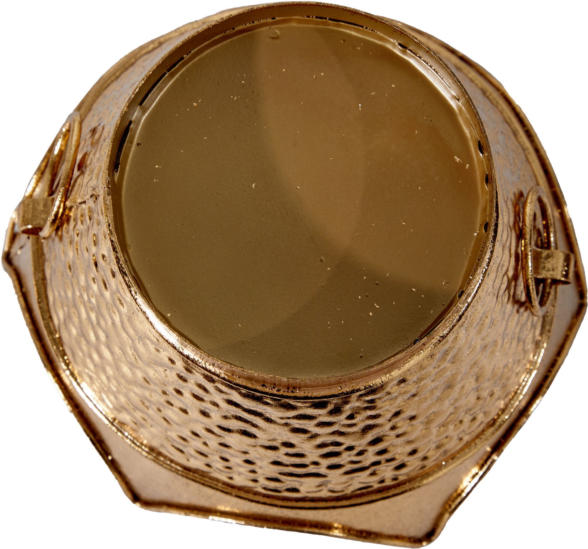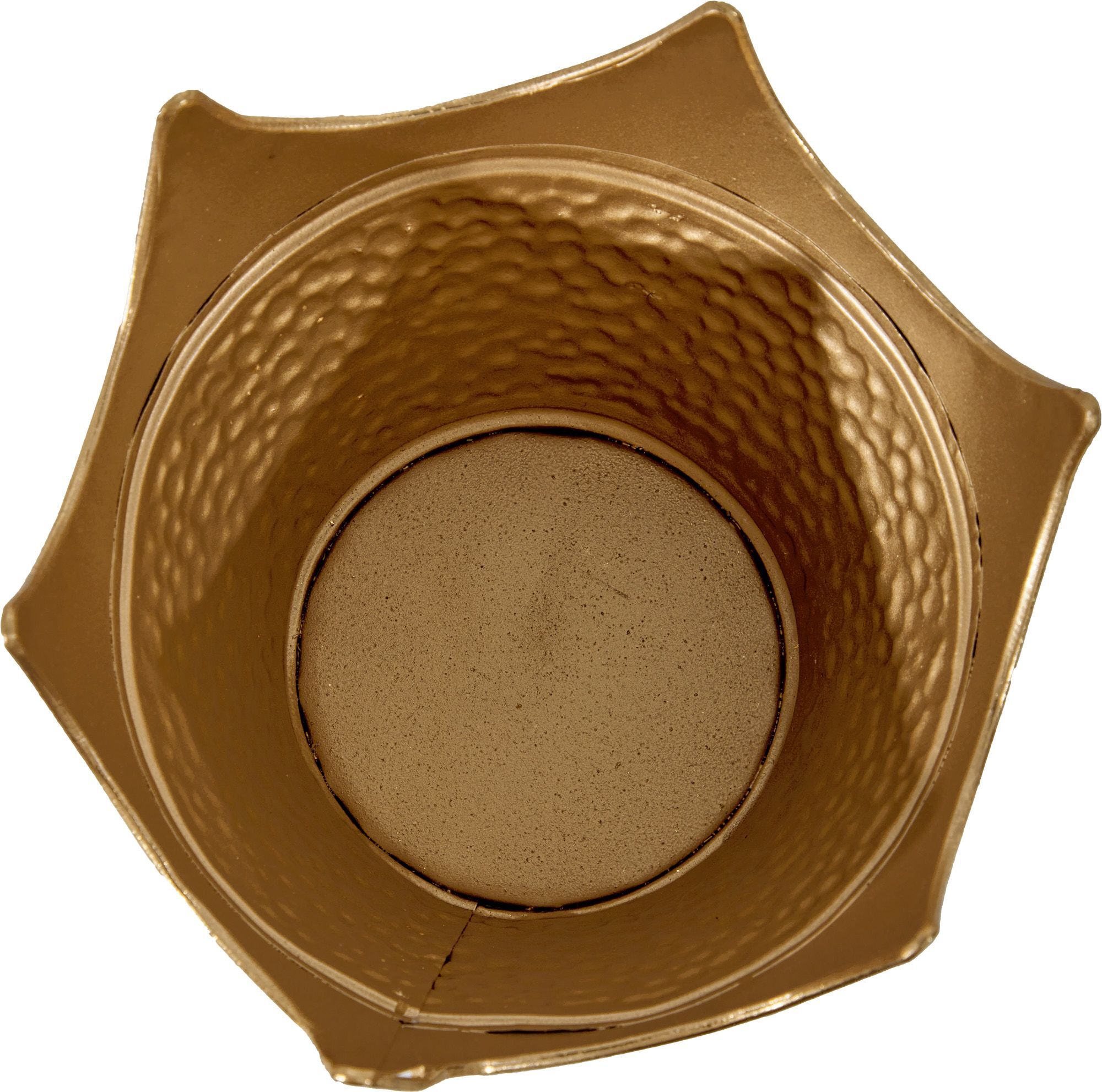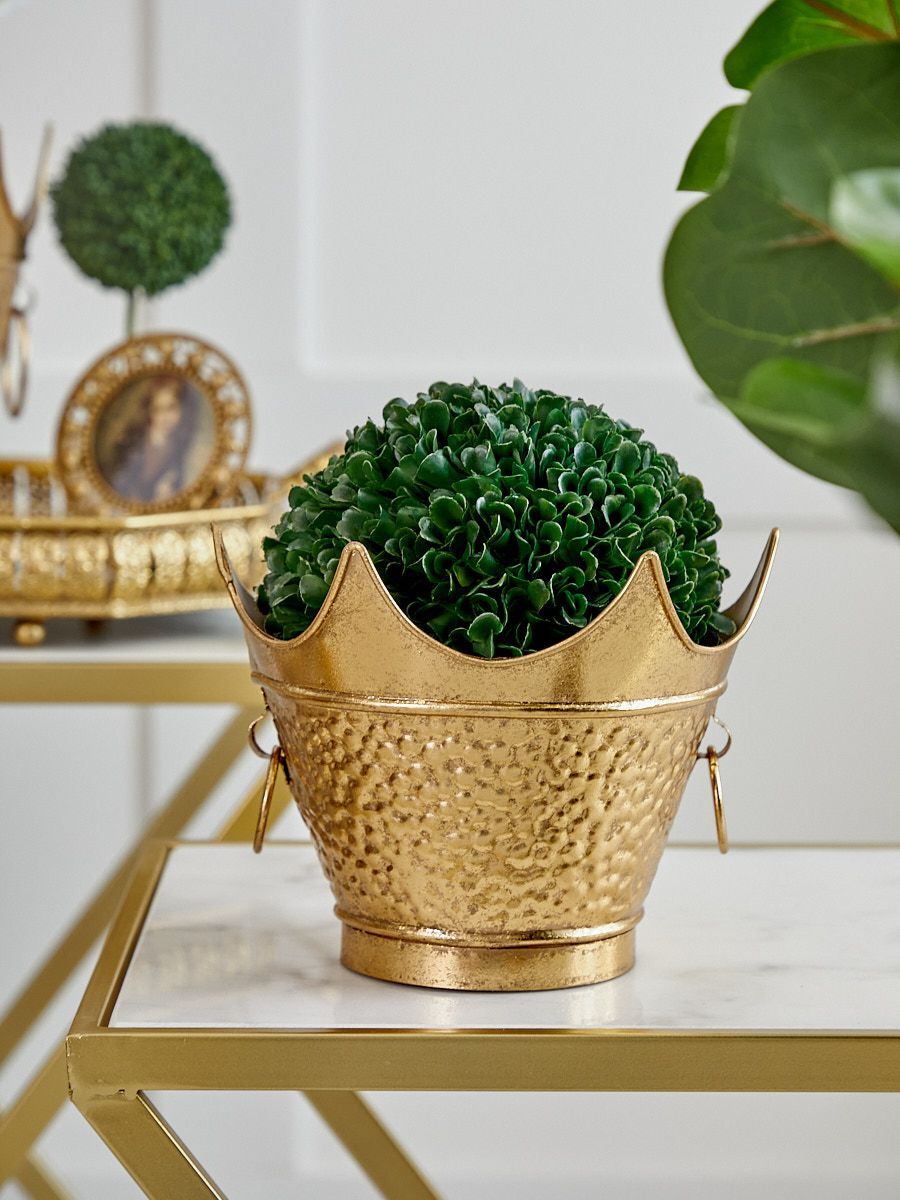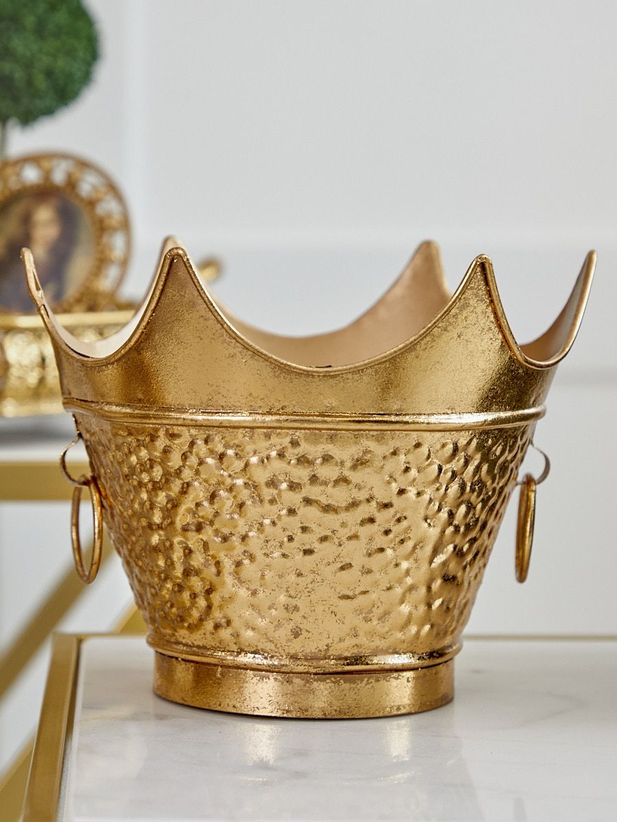 Восхитительное кашпо в виде короны, выполненное из металла с напылением золотистого цвета и фактурной отделкой. Цветочные композиции из сухоцветов, размещенные в это кашпо, создадут царственный образ в интерьере, восхищая ваших гостей неподражаемым стилем.