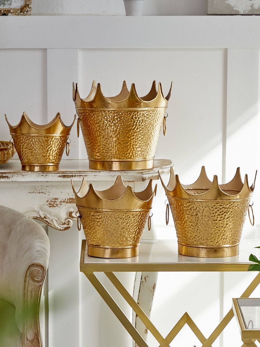 Восхитительный набор из четырех кашпо в виде корон, выполненных из металла с напылением золотистого цвета и фактурной отделкой. Цветочные композиции из сухоцветов, размещенные в эти кашпо, создадут царственный образ в интерьере, восхищая ваших гостей неподражаемым стилем.
