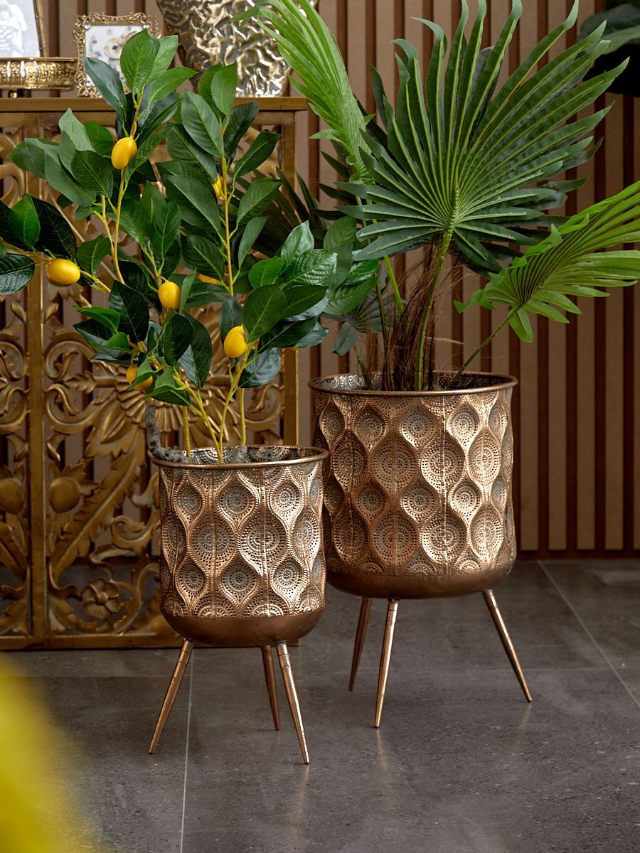 Набор из двух кашпо на ножках Мадагаскар, выполненных из металла с напылением золотистого цвета, создан для сухоцветов и искусственных цветочных композиций. Изделия имеют признаки искусственного состаривания, поверхности декорированы с эффектом патинирования, а наличие сварочных швов подчеркивают принадлежность к ручной работе. Растения, размещенные в эти кашпо, произведут необычный образ в вашем интерьере. Эксклюзивные формы и фактуры навеяло богатство культуры Африки, множество художественных традиций и таинственная атмосфера, окутывающая неподражаемостью.