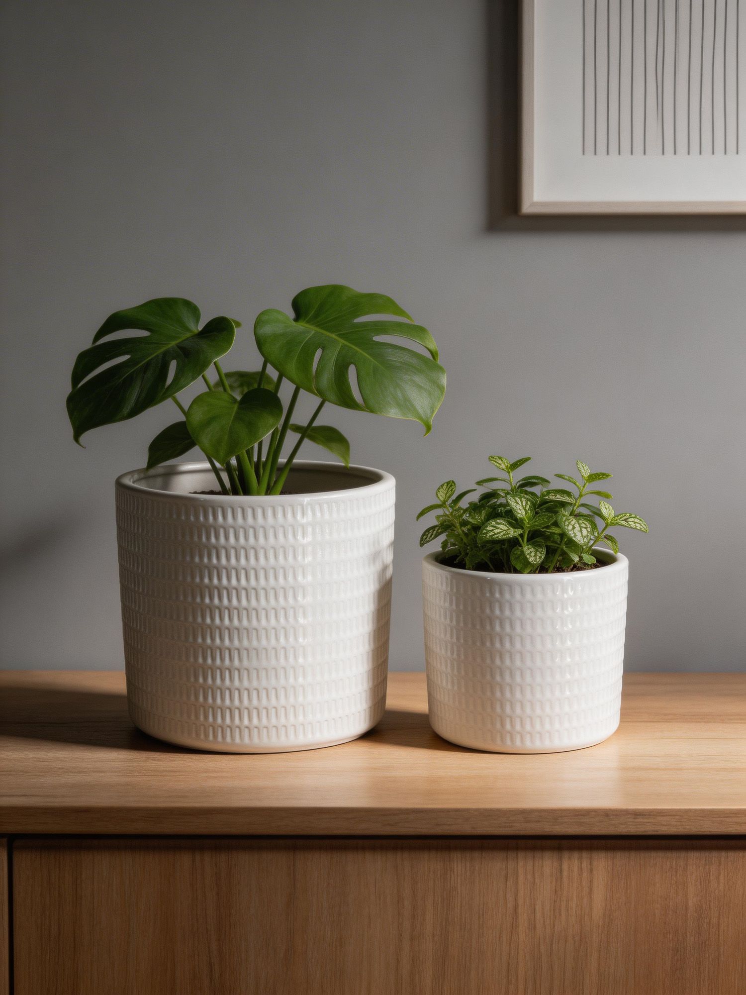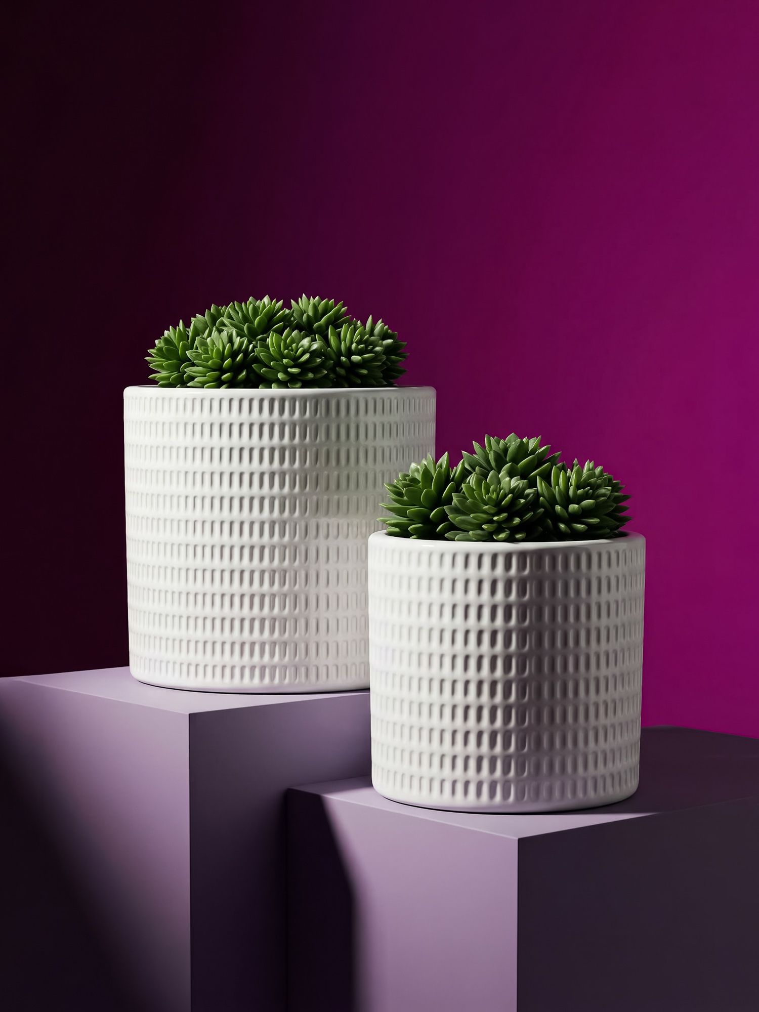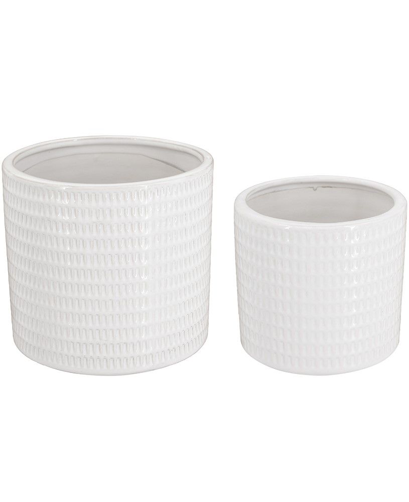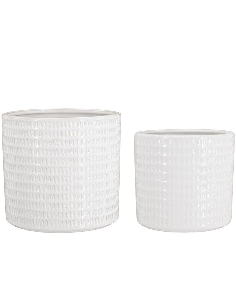 Набор из двух кашпо, воплощающие красоту современного скандинавского дизайна, отличаются четким цилиндрическим силуэтом, повторяющимся геометрическим мотивом и ярко-белой отделкой. Украсьте кашпо пушной цветочной композицией, яркими суккулентами или вьющейся травой, тем самым добавляя новый акцент и художественный вид любой гостиной, столовой или прихожей. Нейтральный оттенок и сдержанная форма позволяют этому набору дополнять традиционные, современные, скандинавские и богемные стили.