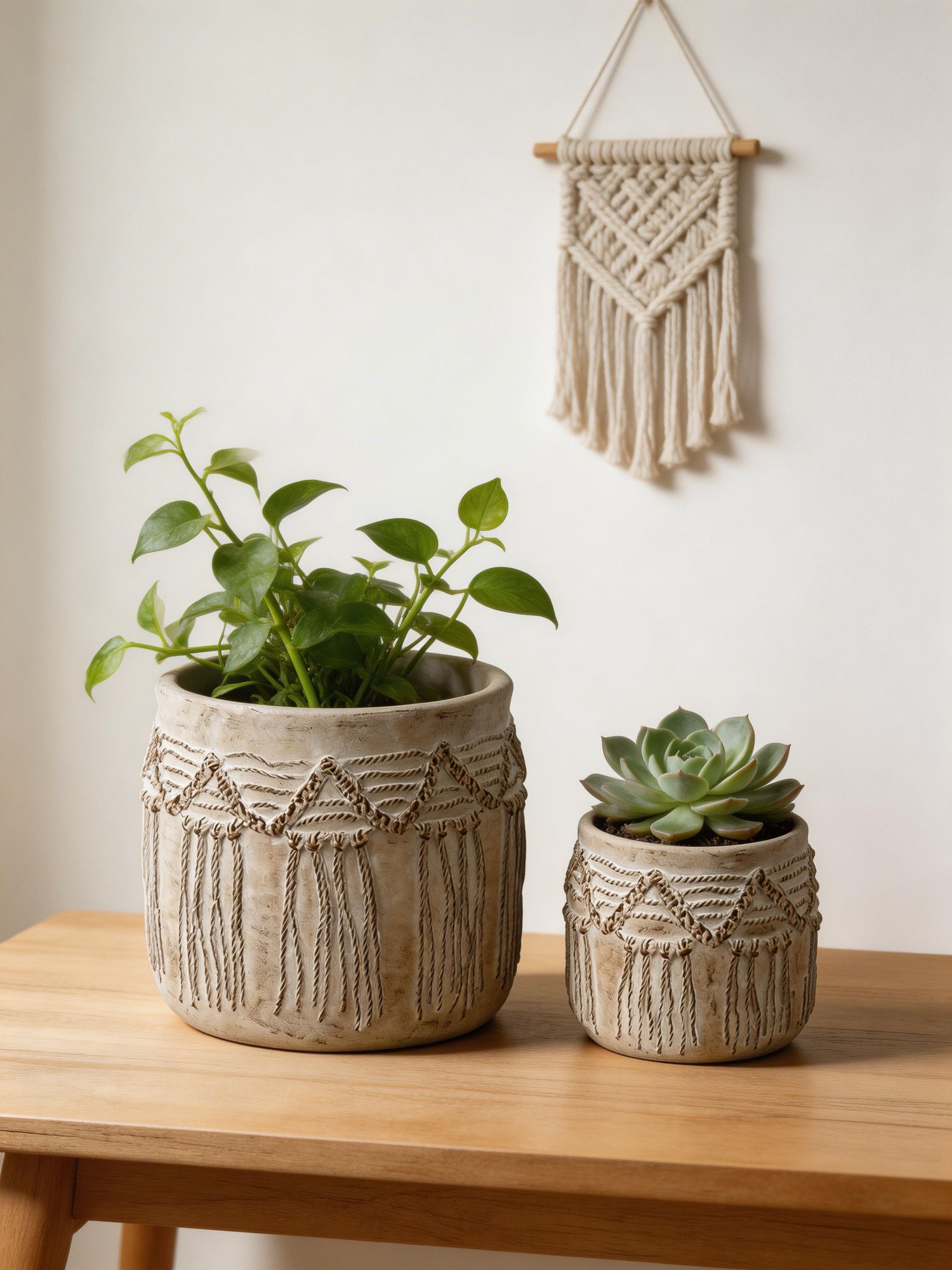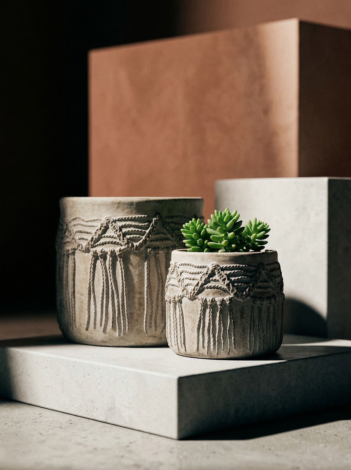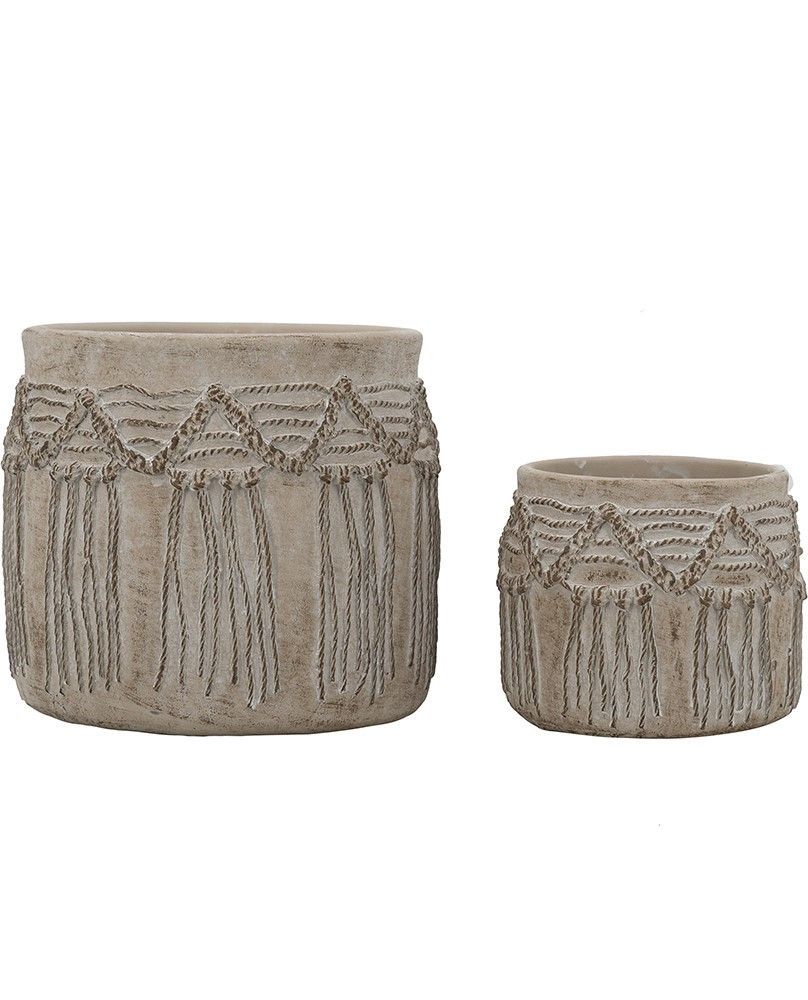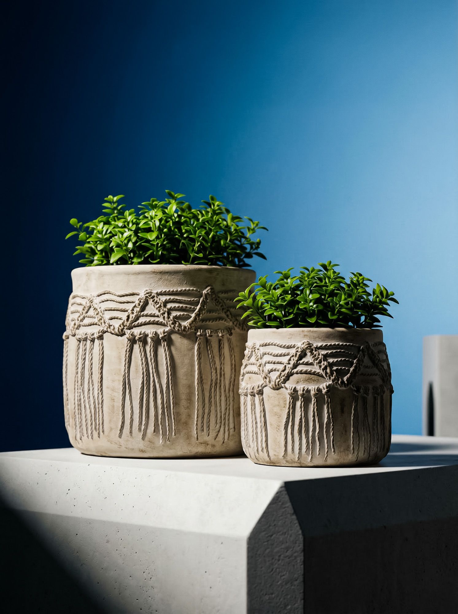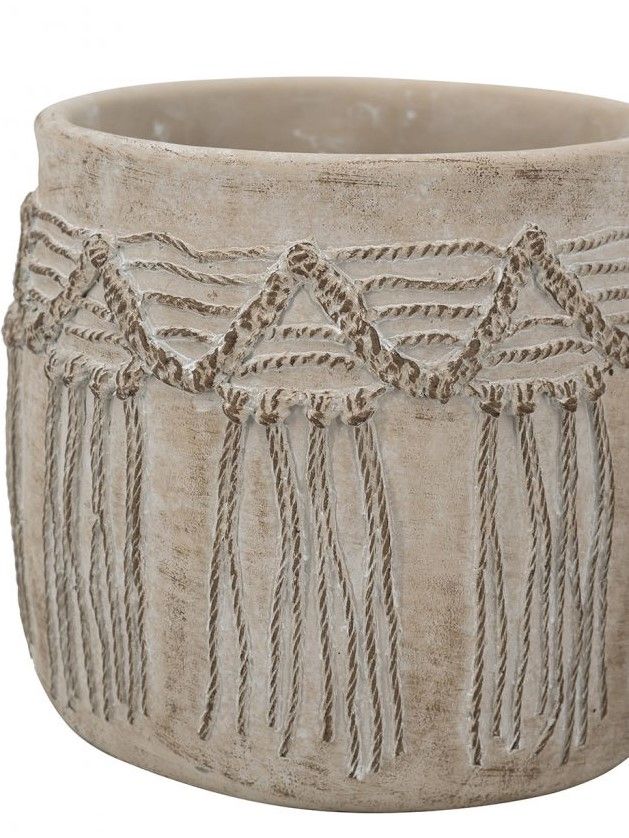 Классические цементные кашпо созданы с дизайном в стиле макраме и коричневой отделкой в винтажном стиле, что позволит изделиям стать эффектным дуэтом в пространстве вашего дома. Кашпо будут привлекать внимание в любом уголке вашего сада, гостиной или прихожей. Органичные детали и состаренная цветовая гамма позволяют этой паре дополнять переходный, фермерский и богемный стили, органично вписываясь в любой интерьер.