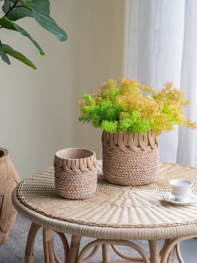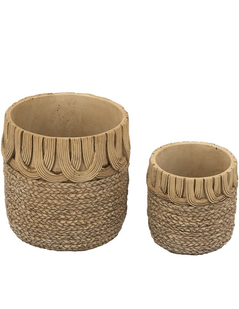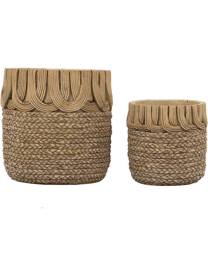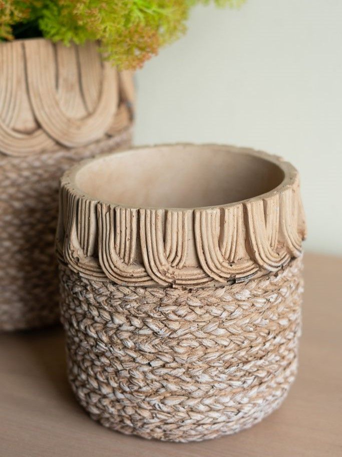 Красивый набор из двух кашпо, мастерски изготовленные из прочного цемента, представляют собой классическую округлую форму в коричневом оттенке с необычными узорами, напоминающими плетение корзин. Изделия идеально смотрятся как сами по себе, так и в сочетании с яркой цветочной композицией, коллекцией суккулентов или ампельных растений. Кашпо украсят любую гостиную, столовую или прихожую, а сдержанная цветовая гамма и уникальный дизайн позволяют этому набору гармонично сочетаться со стилями бохо, фермерским, ваби-саби и современными направлениями, гармонично вписываясь в любой интерьер.