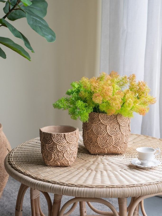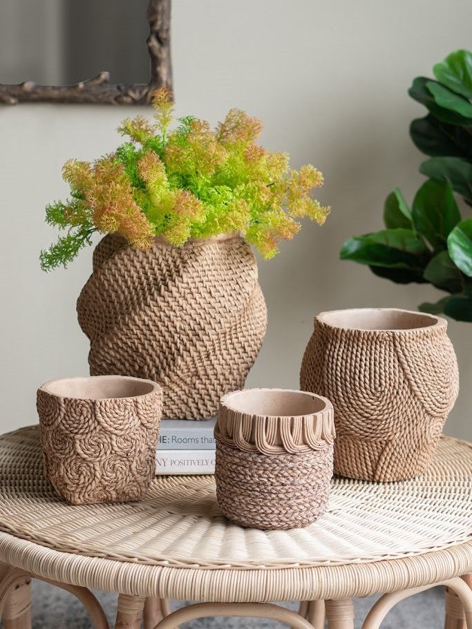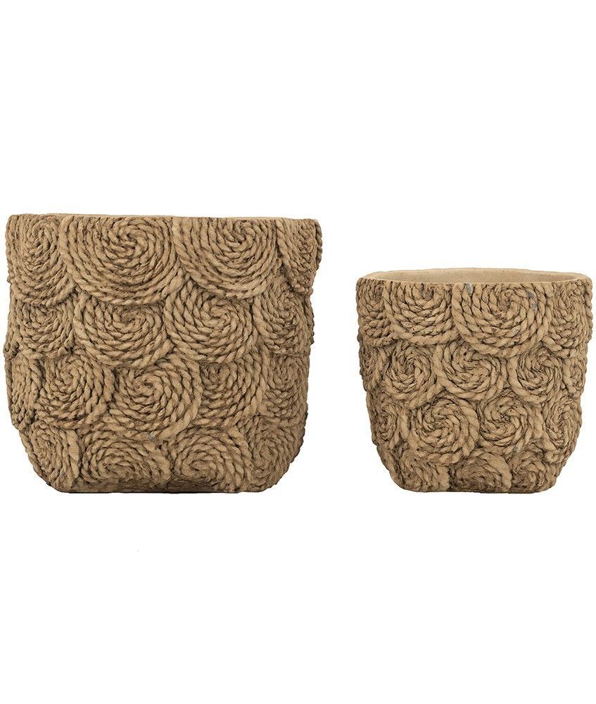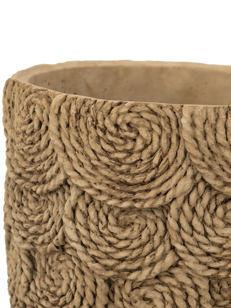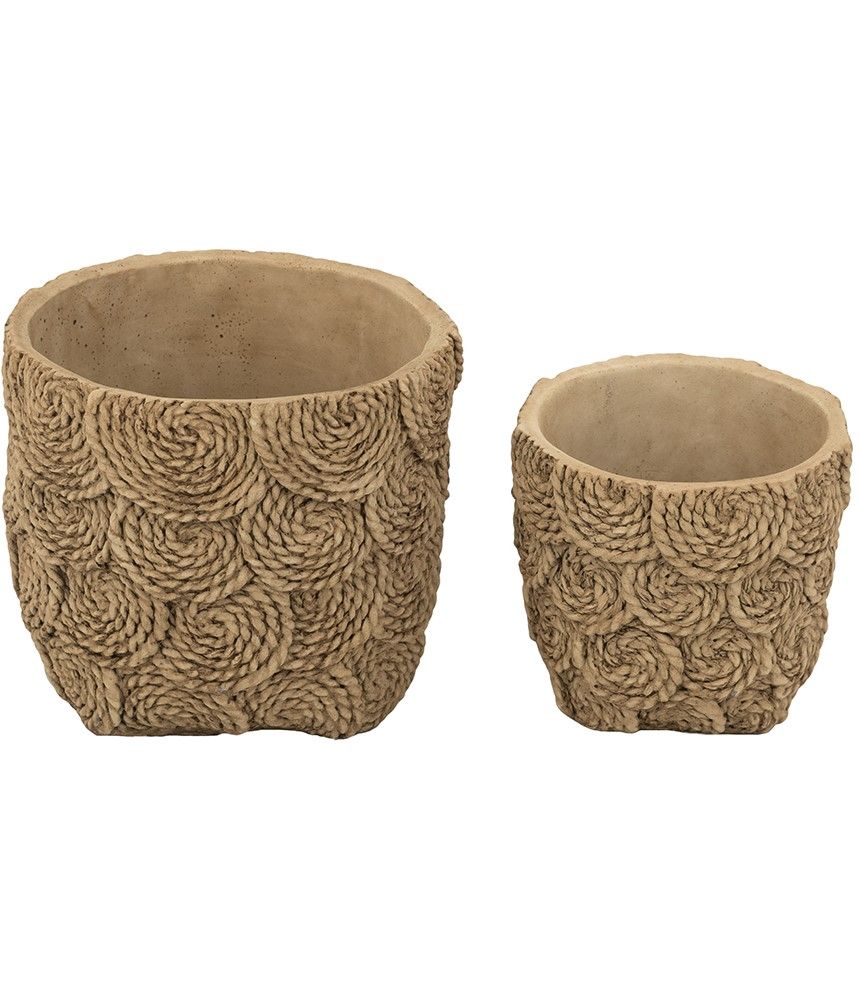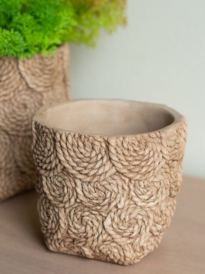 Набор из двух кашпо, изготовленные из цемента в винтажном стиле, представляют собой классический округлый силуэт, текстурную фактуру в виде отделки веревочным орнаментом с коричневым оттенком. Изделия идеально смотрятся как в отдельности, так и в сочетании с красочной коллекцией суккулентов или ампельных растений. Кашпо украсят любую гостиную, столовую или прихожую. Цветовая гамма и интересные узоры позволяют этому набору дополнять интерьеры в стиле бохо, рустик, фермерский стиль и арт-деко, органично вписываясь в любую обстановку дома.