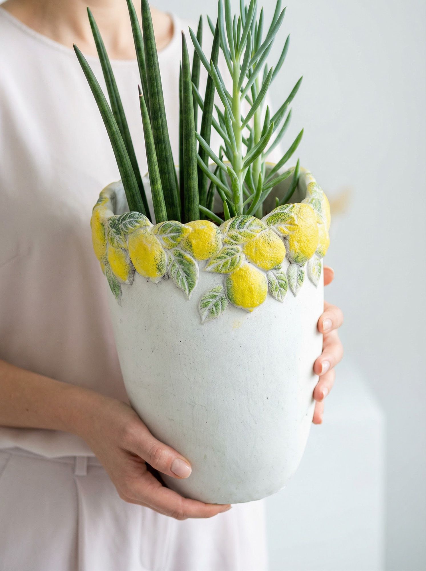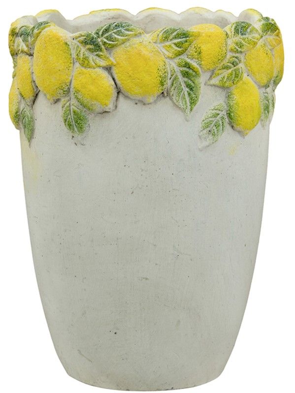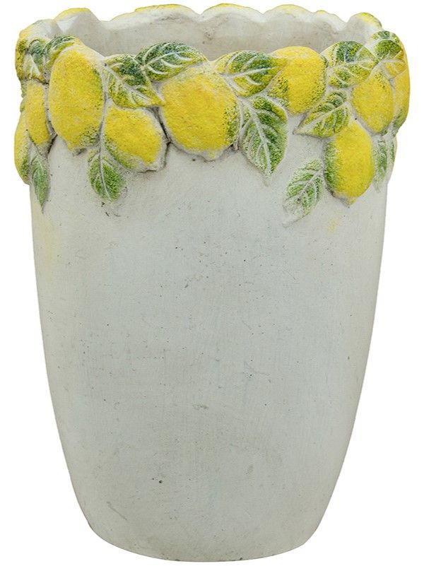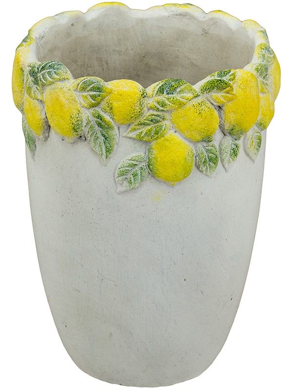 Эффектное кашпо, вдохновленное беззаботным очарованием Тоскании, имеет светло-серую матовую поверхность, фактурное горлышко и яркое изображение сочных лимонов с зелеными листьями. Создайте яркий образ в интерьере совместно с изделиями из этой коллекции, размещая пышные композиции из сухоцветов или искусственных цветов. Текстурированные детали и уютная цветовая гамма позволяют использовать кашпо в переходных, французских, дворянских, фермерских и богемных интерьерах, органично вписываясь в любой стиль.