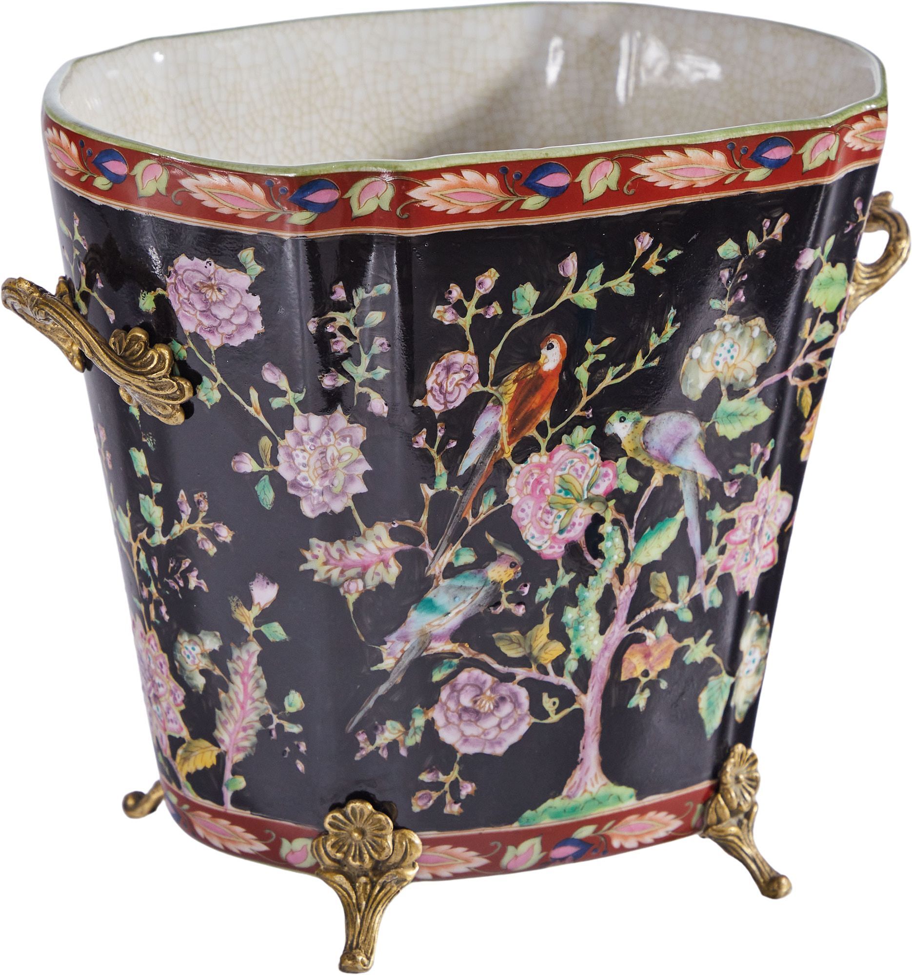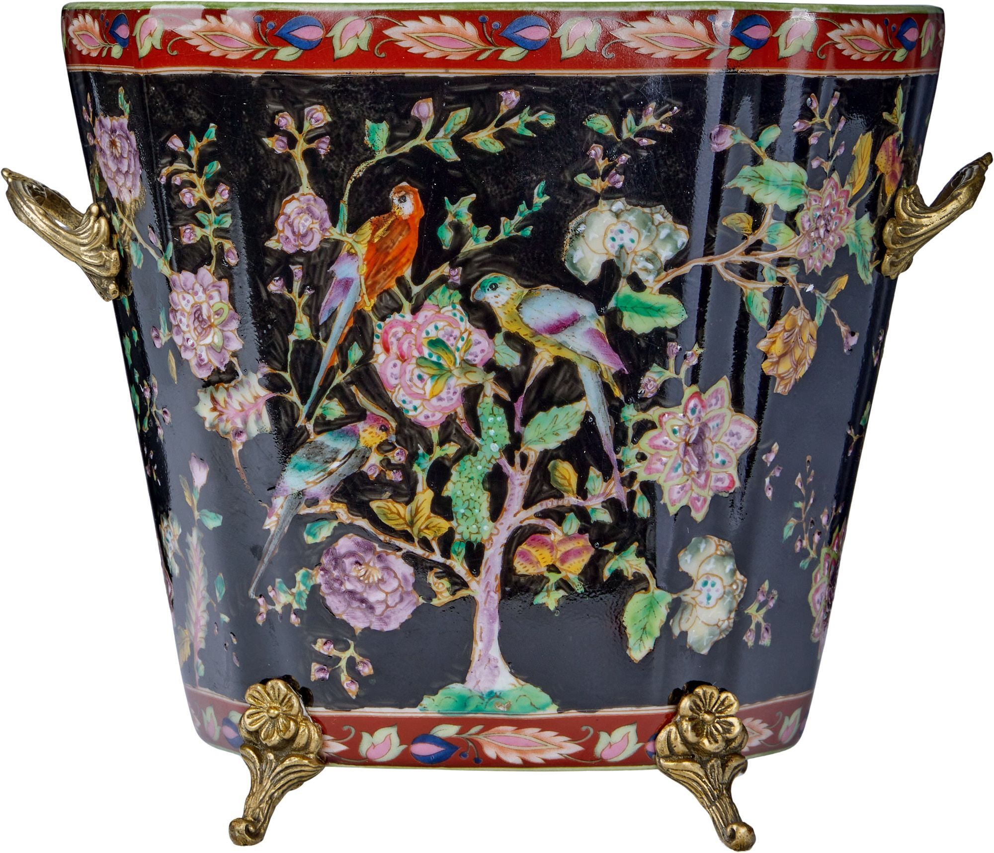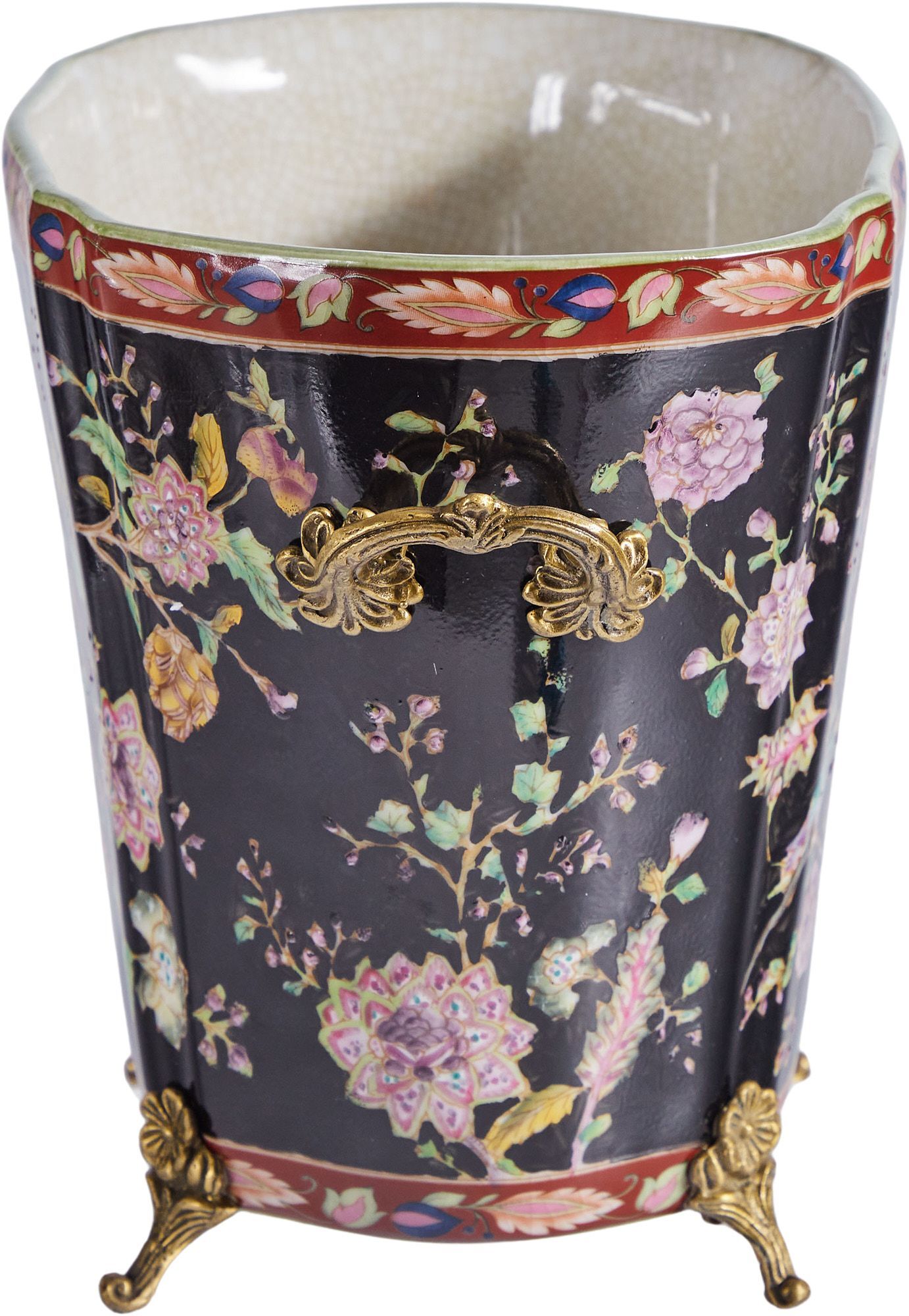 Элегантное кашпо с ручками, выполненное из фарфора с бронзовыми элементами. Уникальное изделие ручной работы. При производстве этих художественных изделий из фарфора с бронзой используются вековые традиции китайских мастеров. Видимые трещинки (кракелюры) делаются по уникальной технологии, что придает более благородный вид старинного изделия.