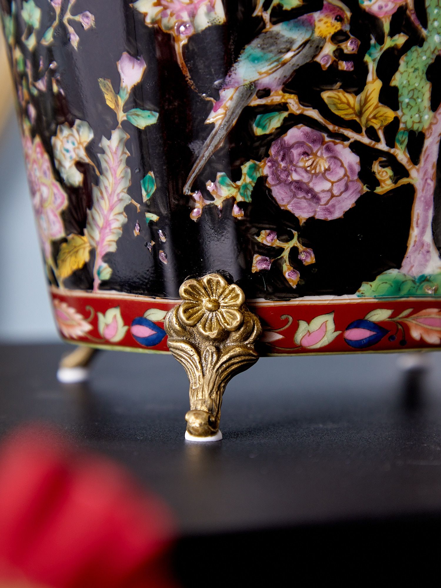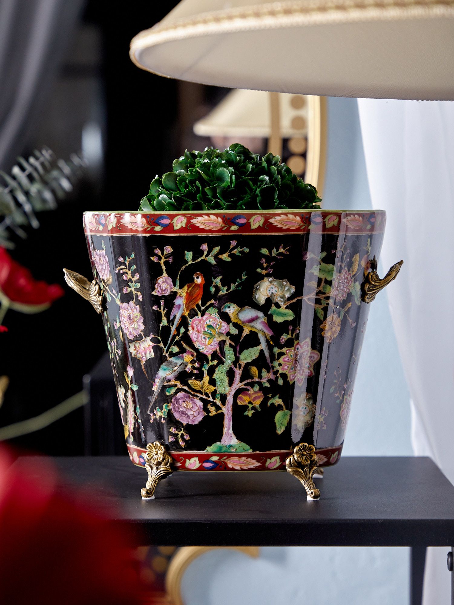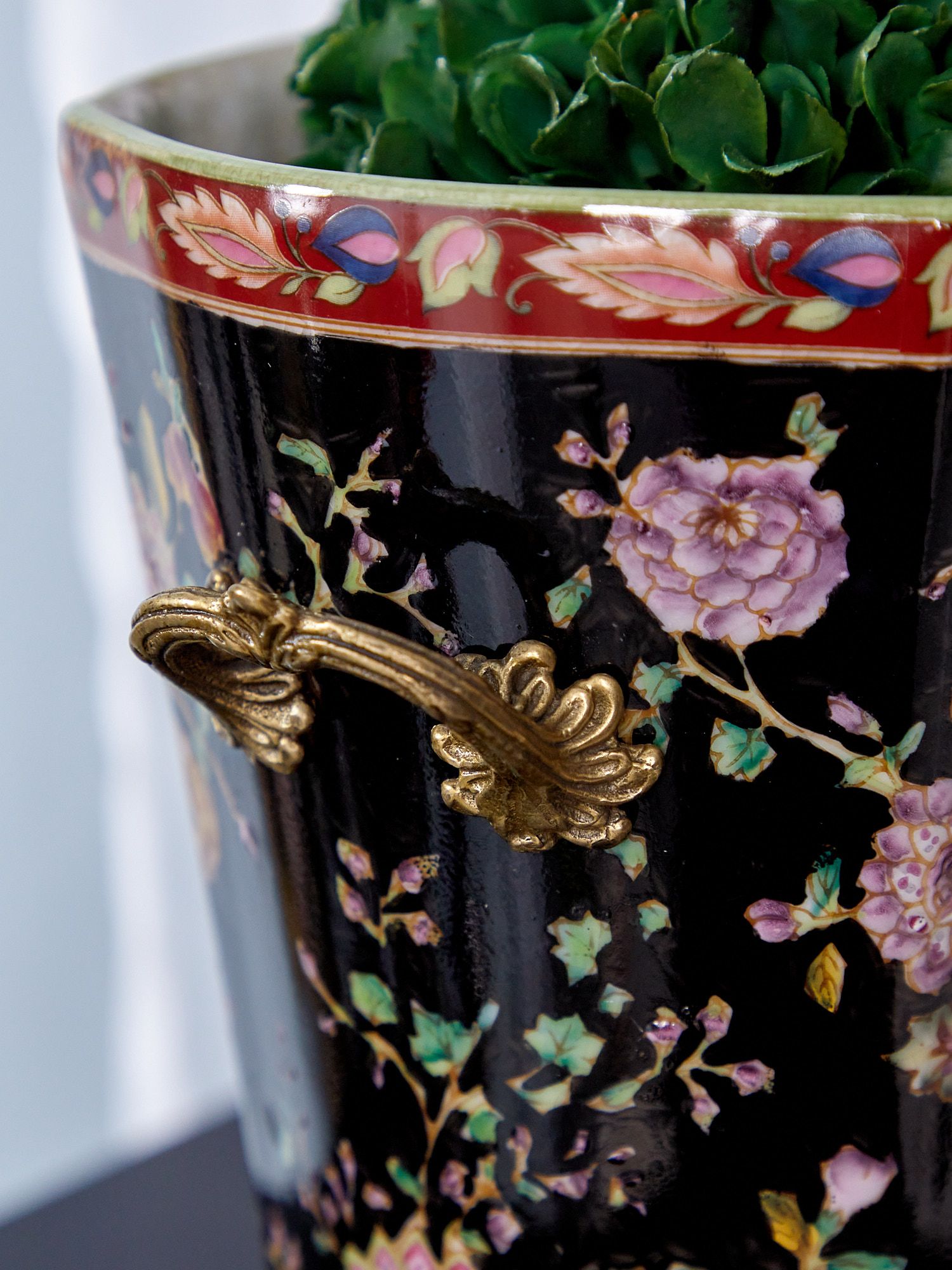 Элегантное кашпо с ручками, выполненное из фарфора с бронзовыми элементами. Уникальное изделие ручной работы. При производстве этих художественных изделий из фарфора с бронзой используются вековые традиции китайских мастеров. Видимые трещинки (кракелюры) делаются по уникальной технологии, что придает более благородный вид старинного изделия.