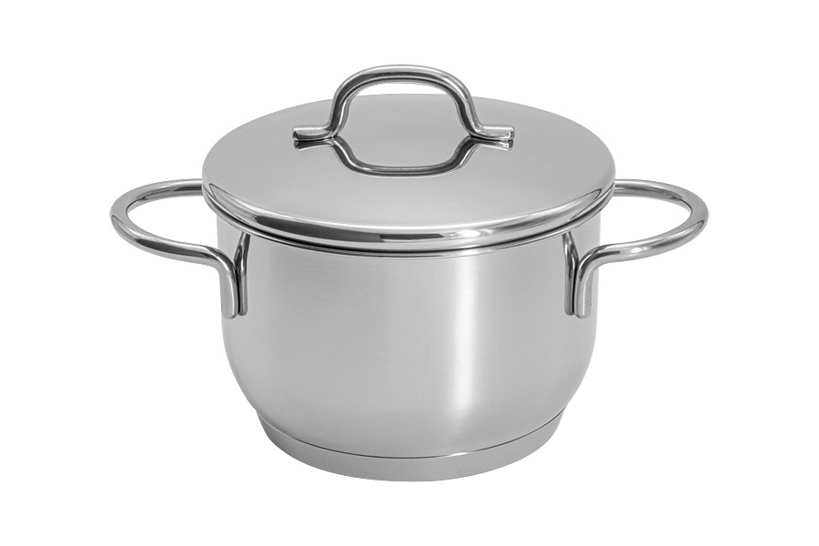 Трёхслойное дно толщиной 8-9 мм, толщина стенок – 0,7 - 0,8 мм. Глянцевая внешняя поверхность. Подходит для всех типов плит, включая индукционные. Металлическая крышка с эффектом «нет пара». Можно готовить практически без жидкости и масла