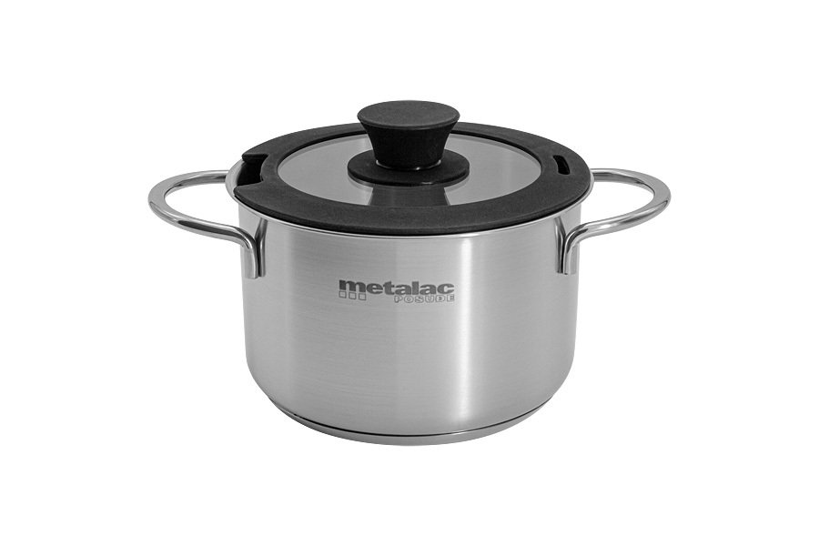 Трёхслойное дно толщиной 6 мм, толщина стенок - 0,5 мм. Сатинированная внешняя поверхность. Мерная шкала. Подходит для всех типов плит, включая индукционные. Стеклянная крышка с силиконовым ободом и функцией дуршлага и держателя для ложки