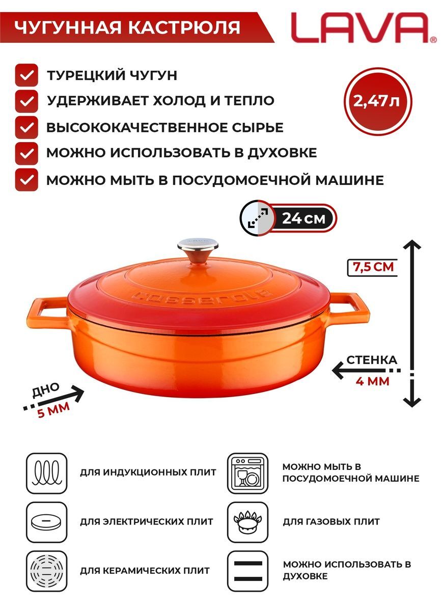 Кастрюля 2,47 л, d 24 см, с крышкой, чугун, цвет оранжевый
