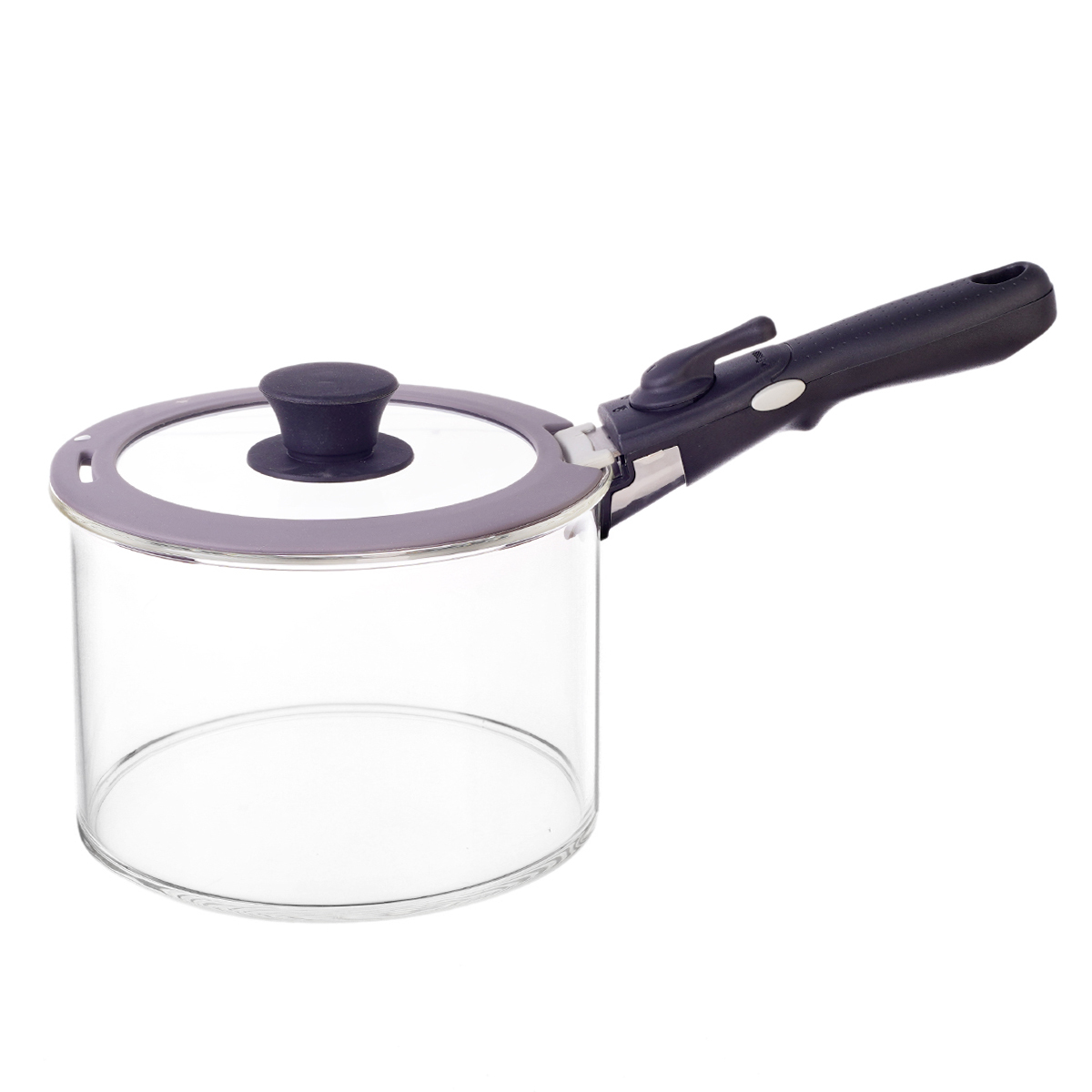 Изящная и практичная одновременно кастрюля из термостойкого стекла со съёмной ручкой и пароотводом в крышке.