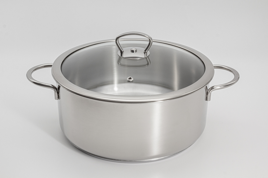 Трёхслойное дно толщиной 6 мм, толщина стенок кастрюли - 0,5 мм. Глянцевая внешняя поверхность. Подходит для всех типов плит, включая индукционные. Стеклянная крышка с металлической ручкой и отверстием для выпуска пара