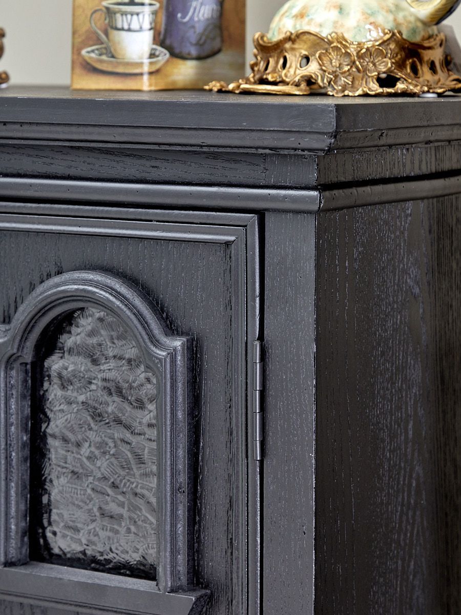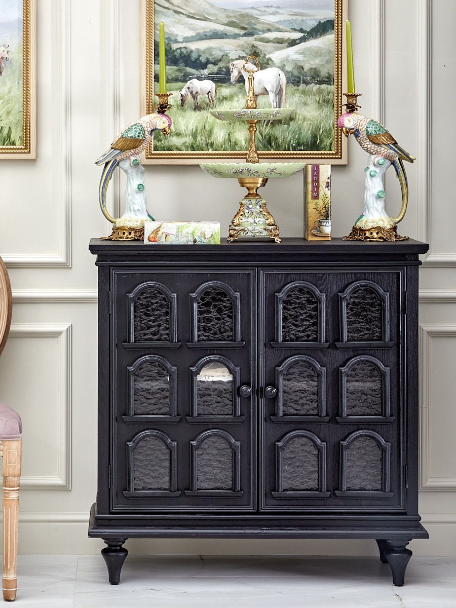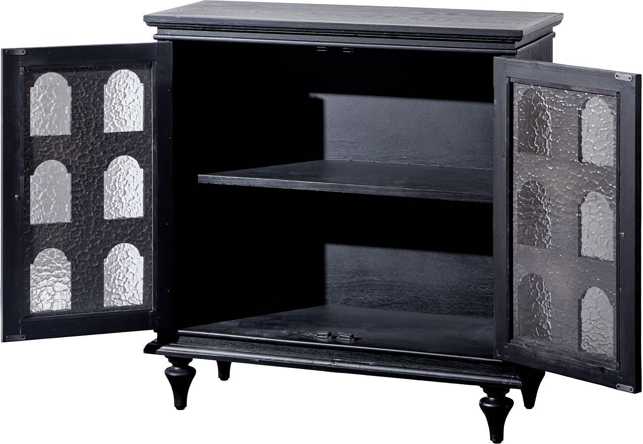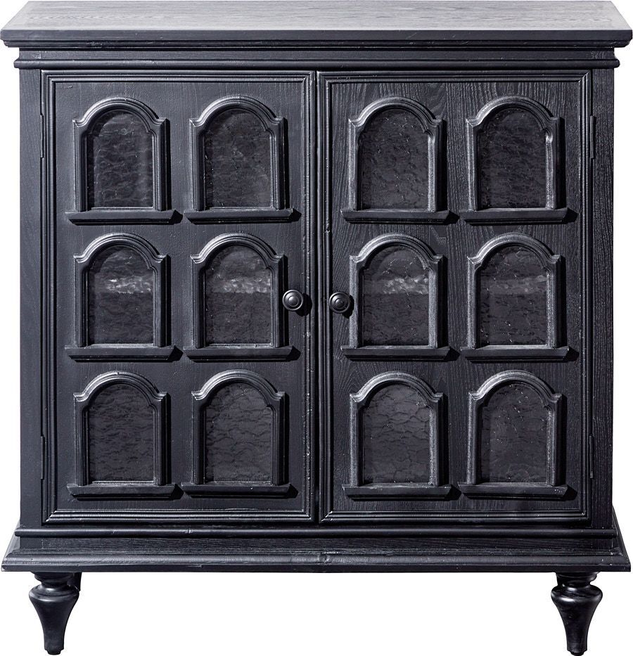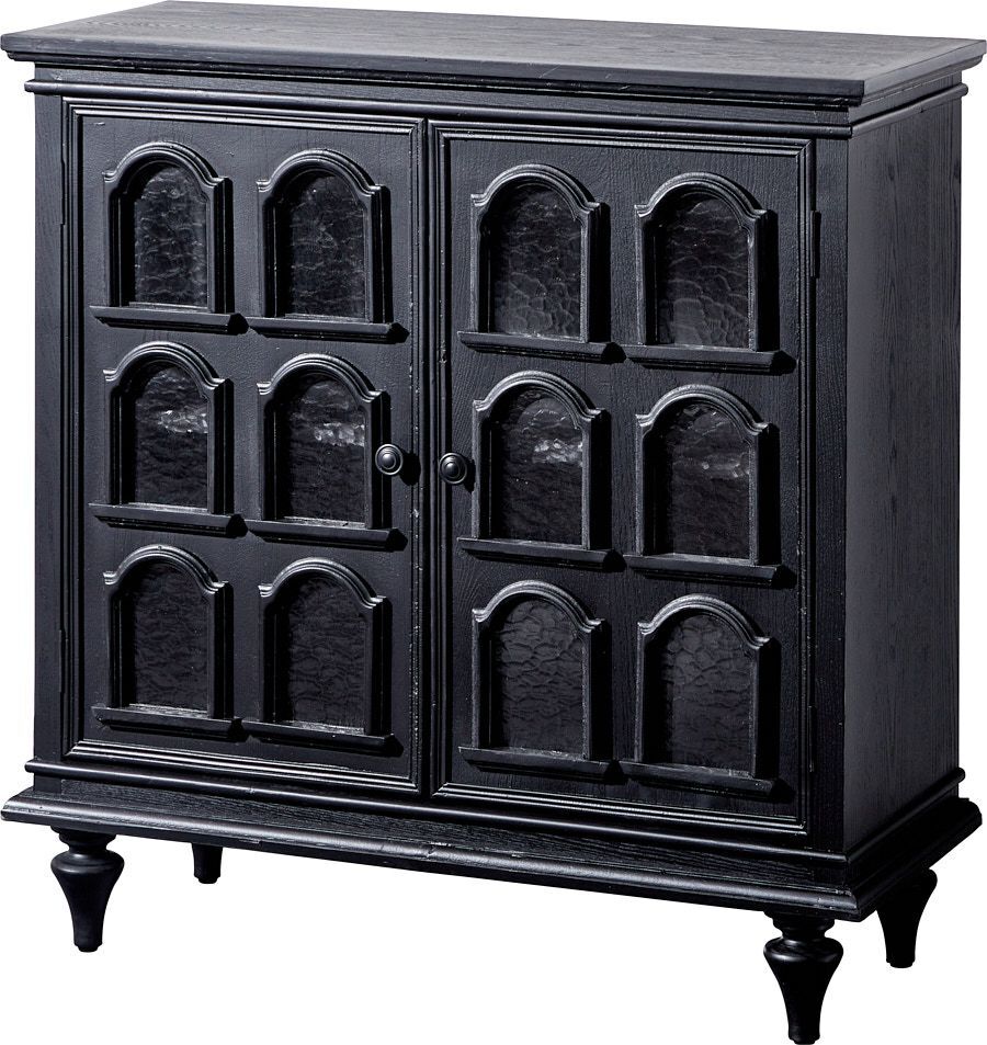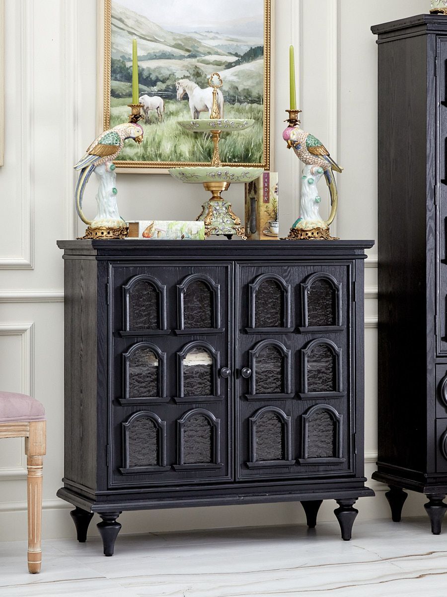 Элегантный комод, выполненный в стиле нуар, дверцы которого украшены арочными фрагментами и фактурными стеклами. Насыщенный матово-черный цвет восхищает глубиной оттенка, классически гармонируя со всем окружающим интерьером. Изделие создано для хранения вещей и любимых предметов и станет прекрасным дополнением в любую гостиную, спальную комнату или офис.