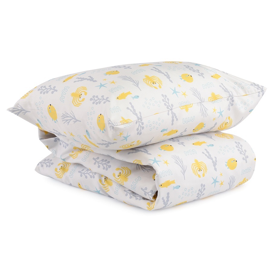 "Комплект постельного белья из сатина с принтом Oceania world из коллекции Tiny world , ,разбавит однотонный текстиль и украсит любую детскую комнату. Изображения морских обитателей могут стать темой для увлекательных разговоров даже с маленькими детьми. Сатин плотностью 210 ТС приятен на ощупь, хорошо впитывает влагу и пропускает воздух, обладает естественным блеском и не теряет внешний вид даже после множества стирок.