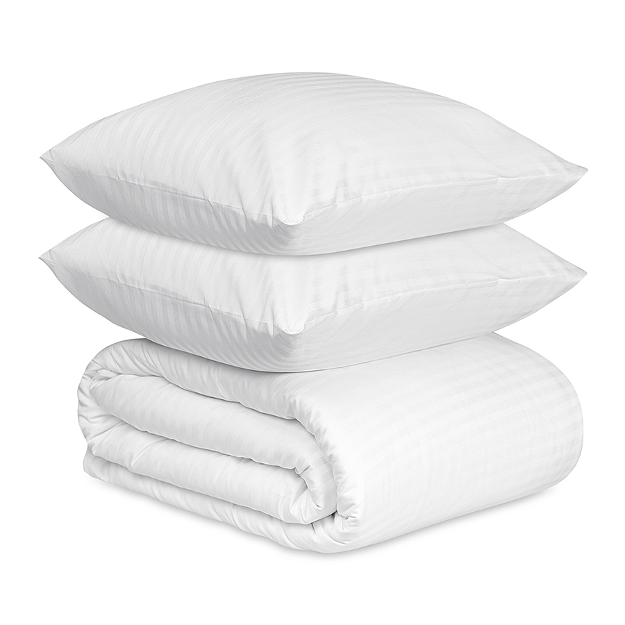 "Комплект из двух наволочек и пододеяльника из страйп-сатина из коллекции Essential – постельное белье премиального качества, которое сделает любую спальню более комфортной и изысканной.