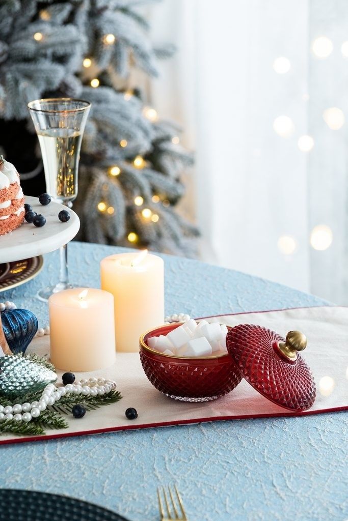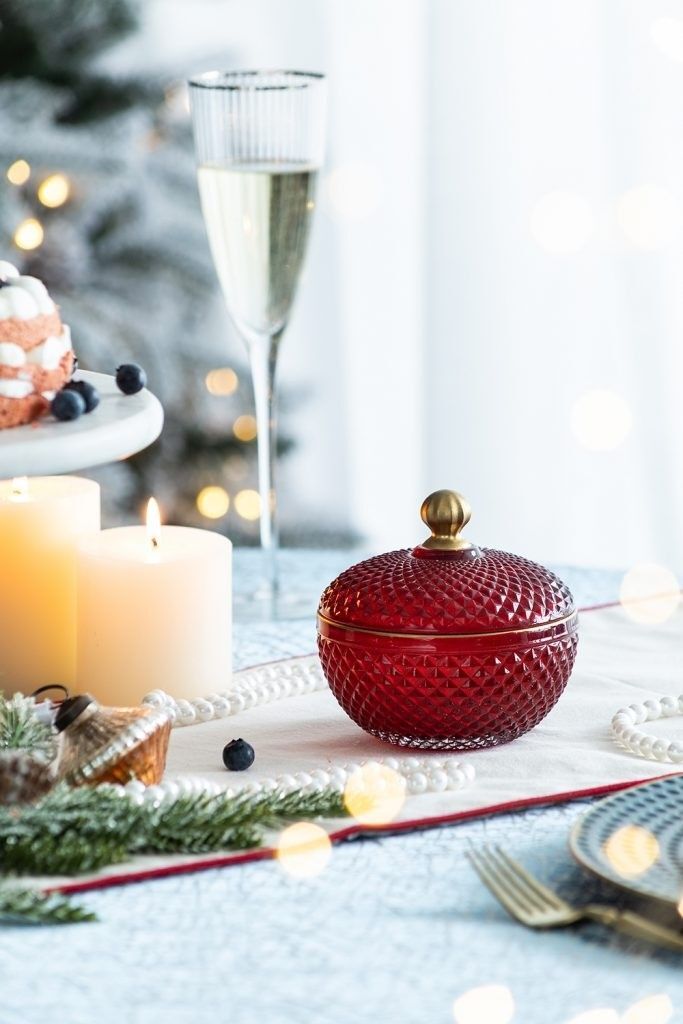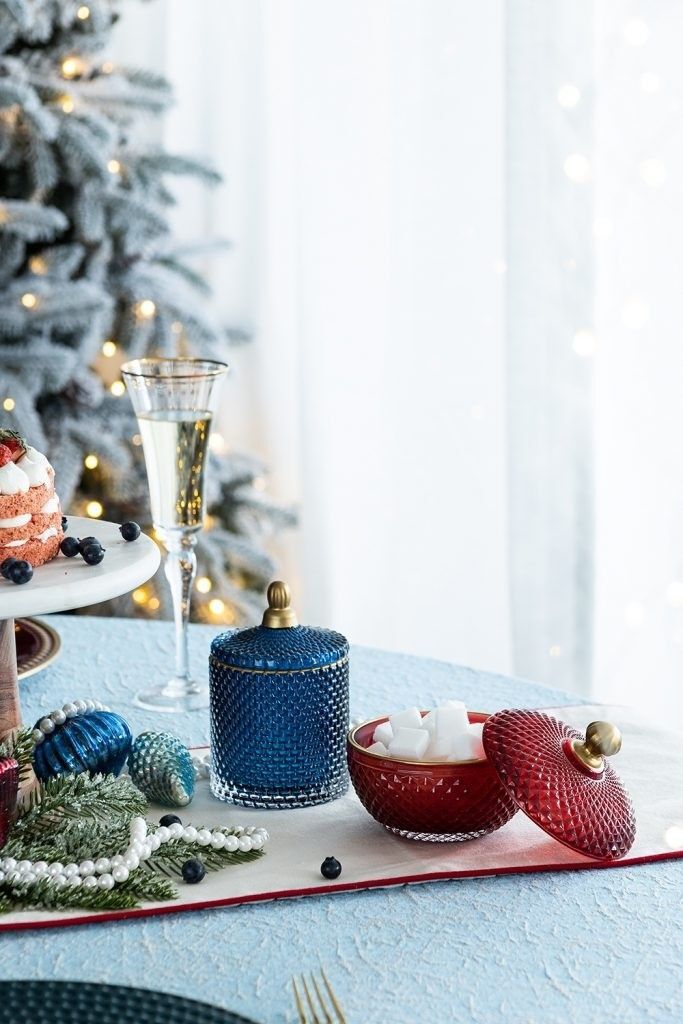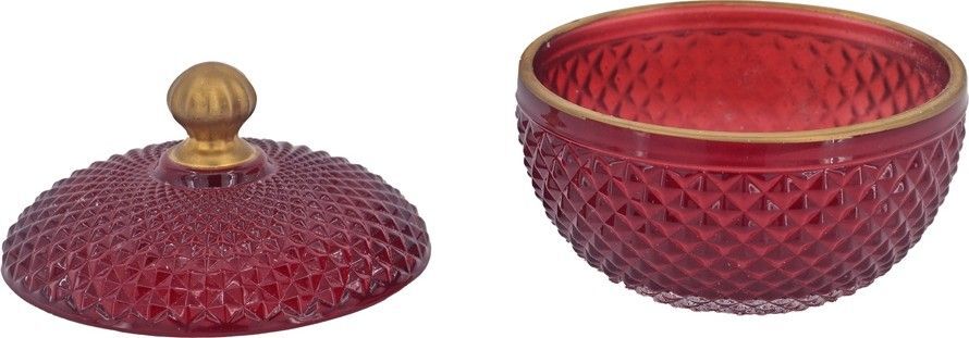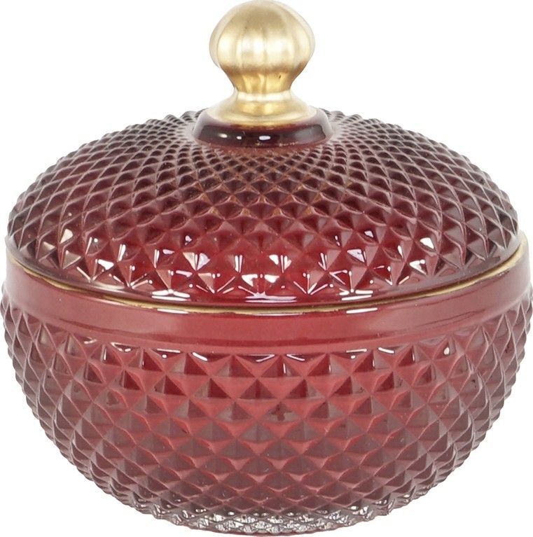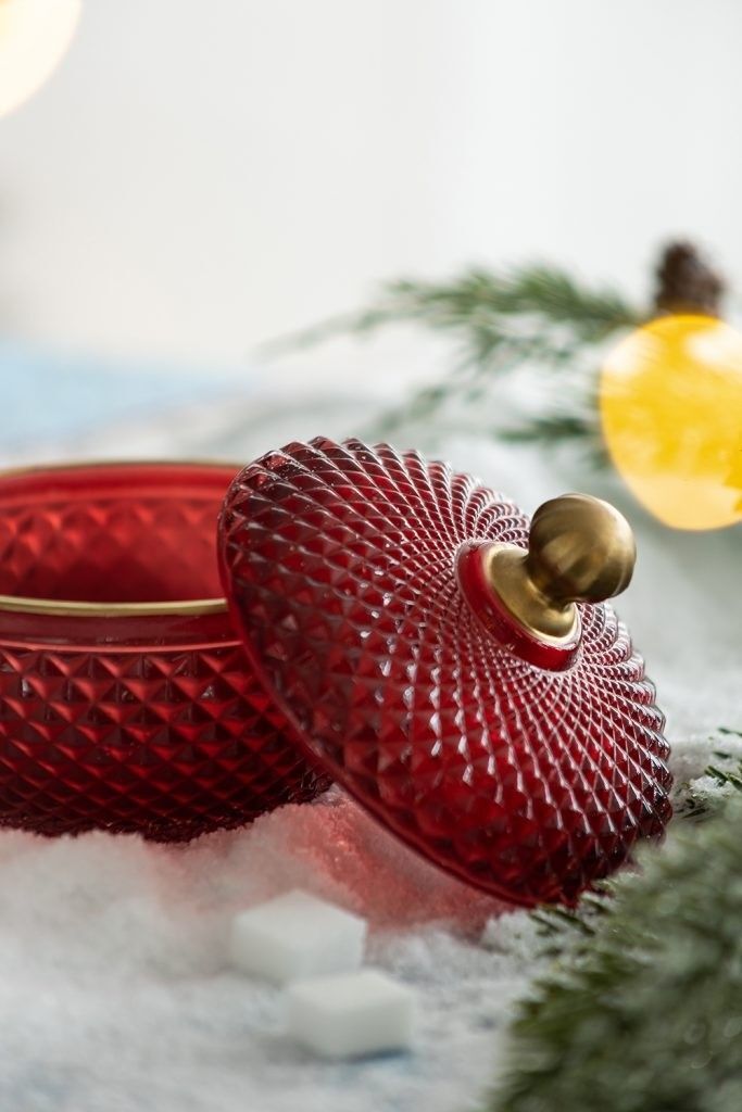 Стеклянная конфетница с крышкой, геометрической текстурой и гранями, отражающими световые потоки. Может служить декоративным элементом, а также удобным местом хранения для продуктов или других мелких предметов.