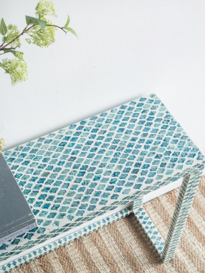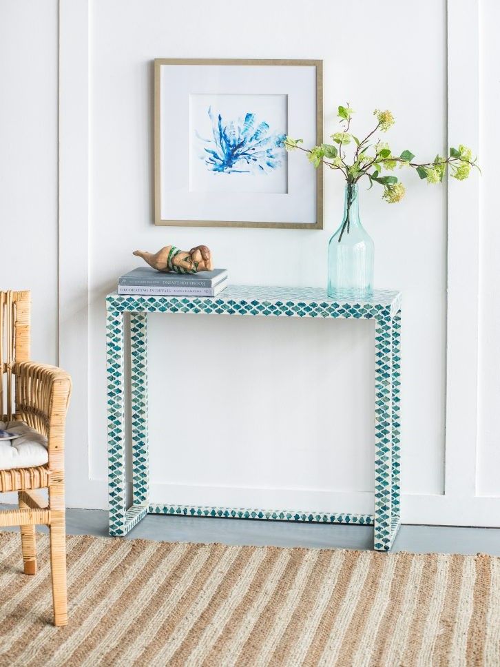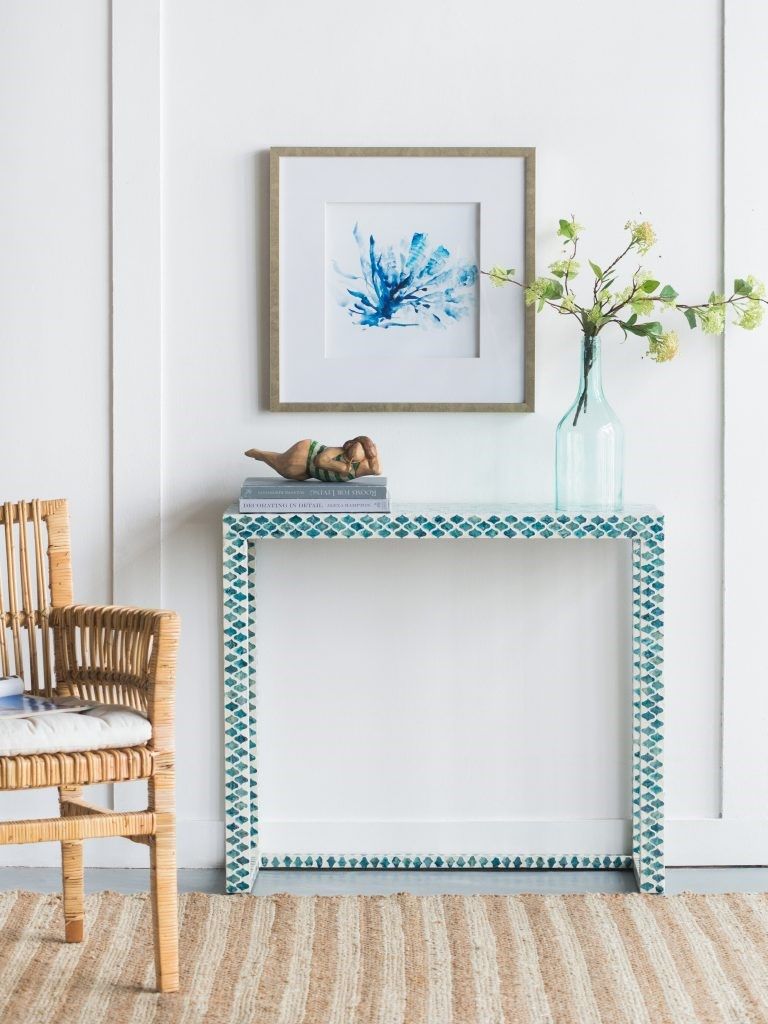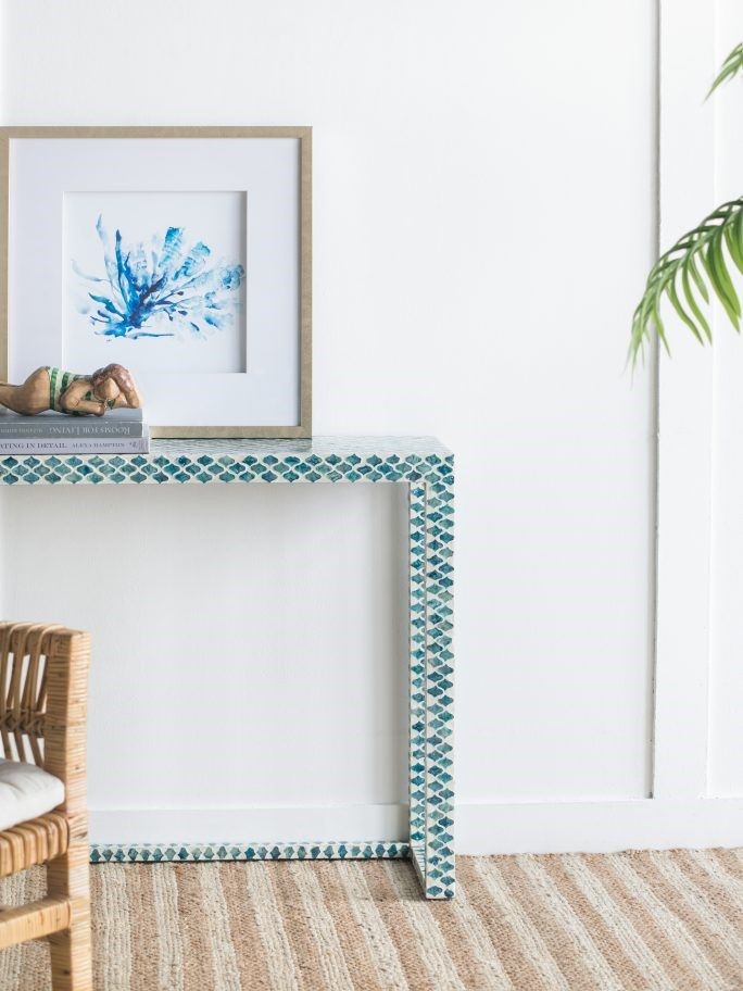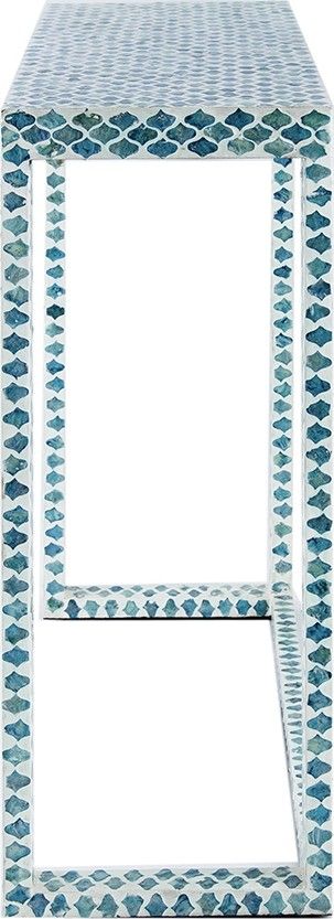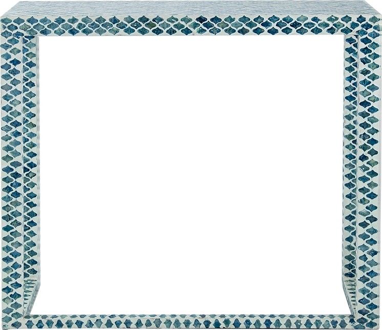 Консольный стол представляет собой великолепное сочетание инкрустаций раковинами устриц синего цвета и отделку цветом слоновой кости. Графический рисунок придаст визуальную привлекательность и непринужденную богемную элегантность в вашем доме.