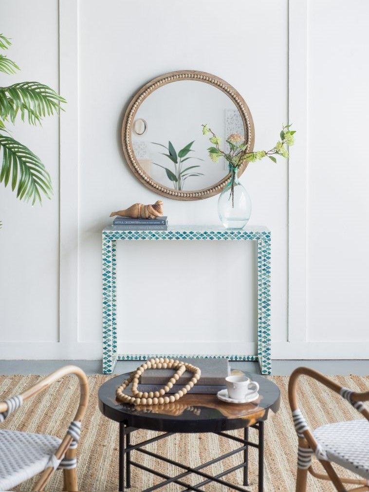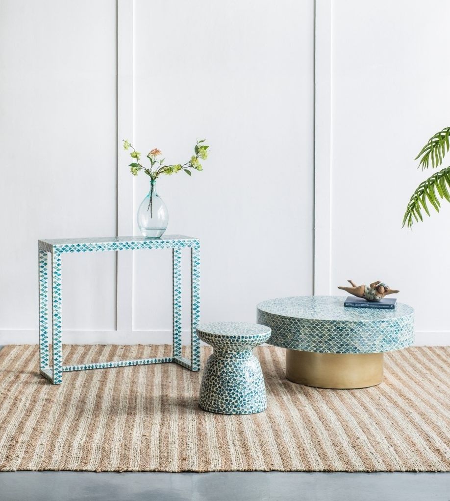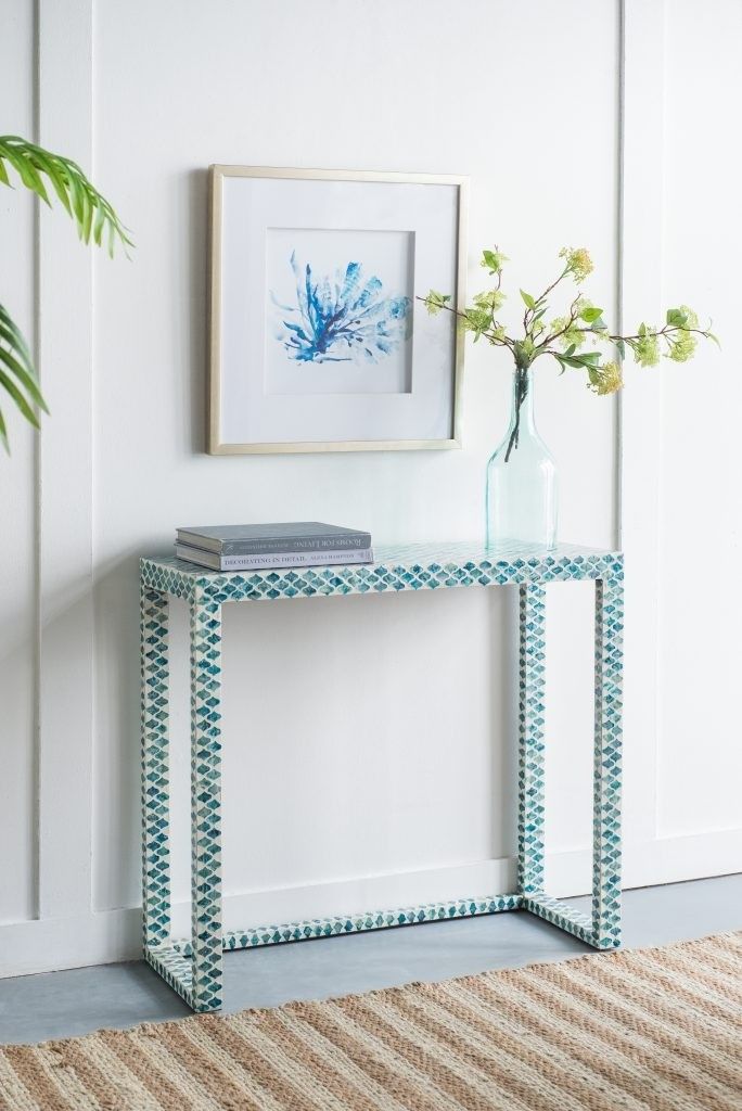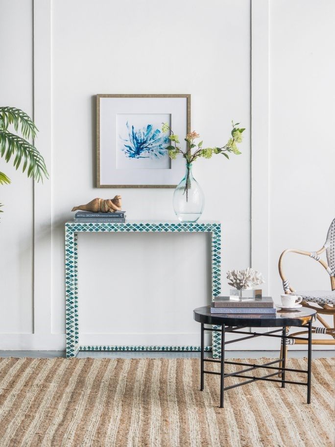 Консольный стол представляет собой великолепное сочетание инкрустаций раковинами устриц синего цвета и отделку цветом слоновой кости. Графический рисунок придаст визуальную привлекательность и непринужденную богемную элегантность в вашем доме.