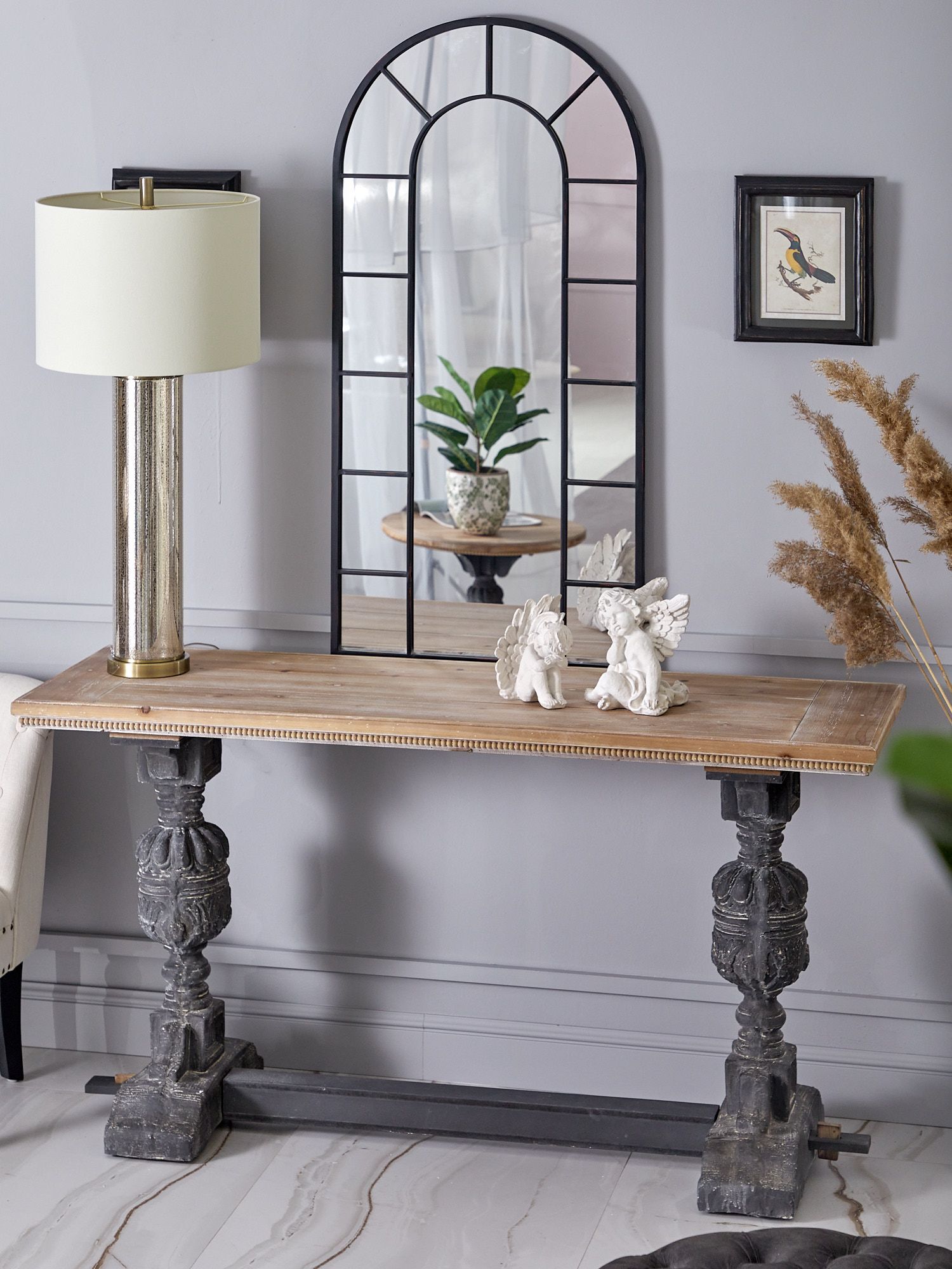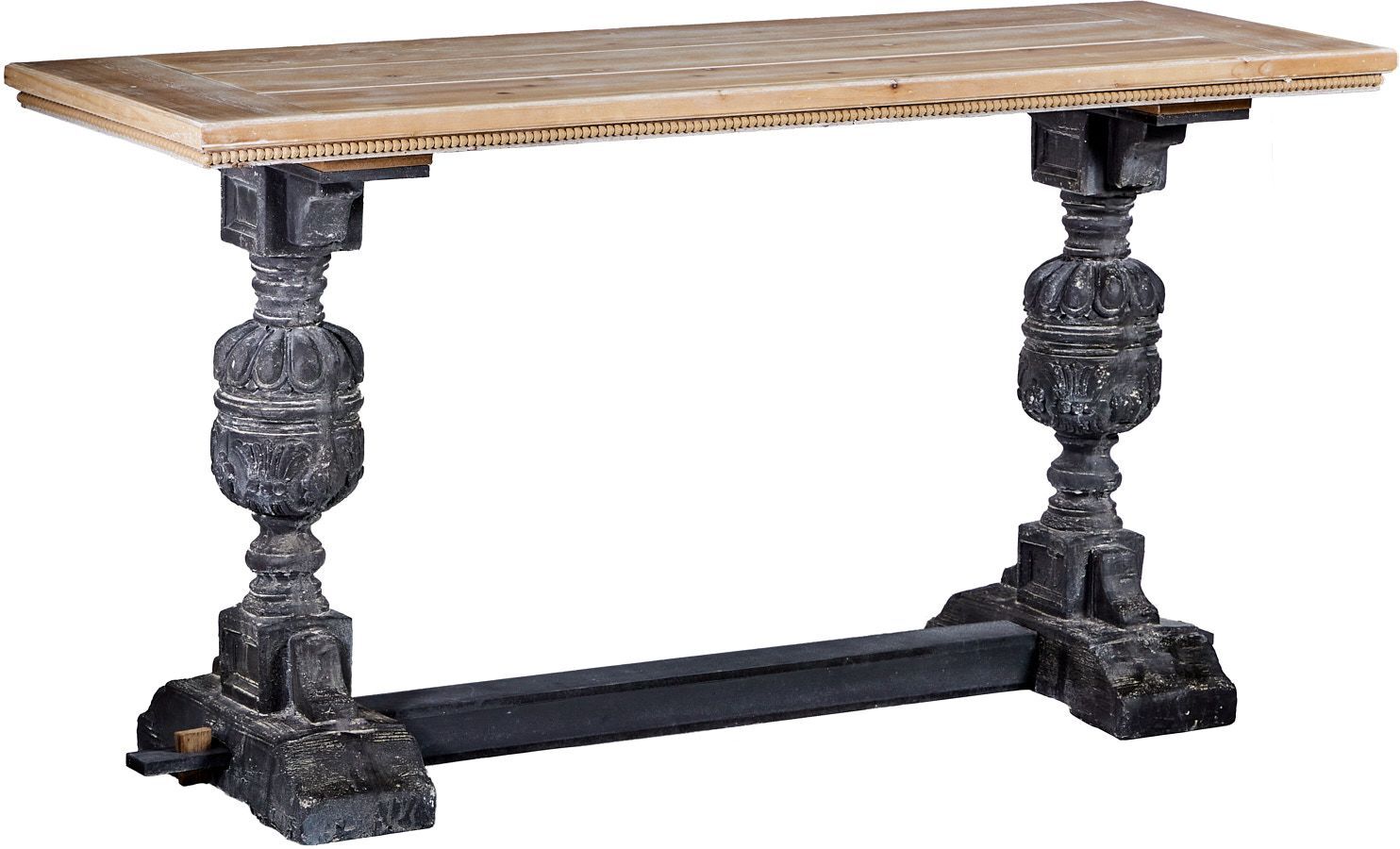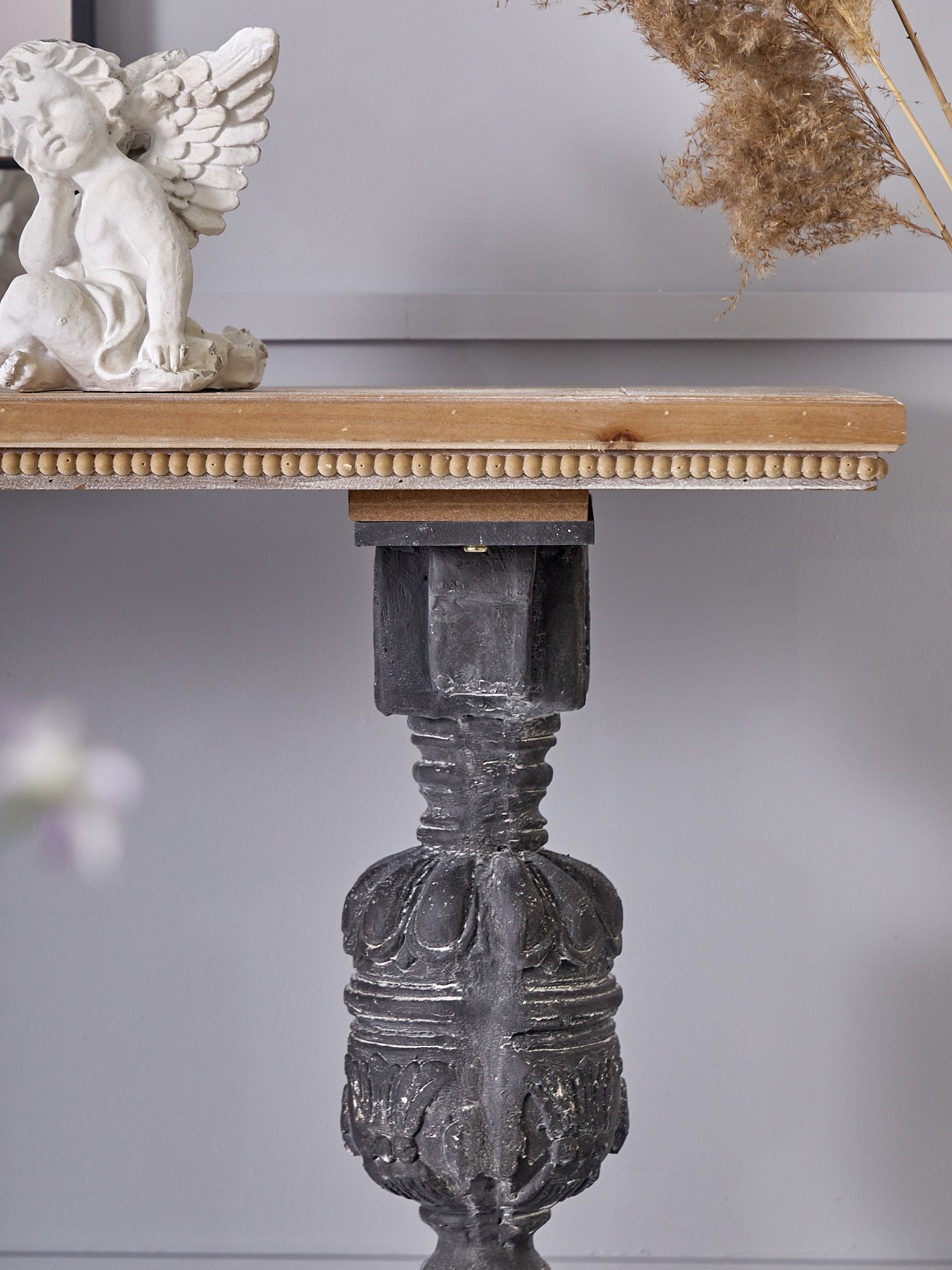 Консольный стол с прямоугольной деревянной столешницей, резное основание которого украшено элегантными формами греческих и римских эпох, создаст особенный стиль в интерьере вашего дома. Станет великолепной основой для вазы с яркими цветами, горящих свечей или стопки книг. Установите это изделие в шикарной гостиной или на просторной веранде загородного дома. Поверхностные потертости и неровности с эффектом реставрации, трещины и сколы краски на изделии характеризуют индивидуальный подход к производству каждого предмета, создавая задуманный дизайнером античный образ ушедших эпох.