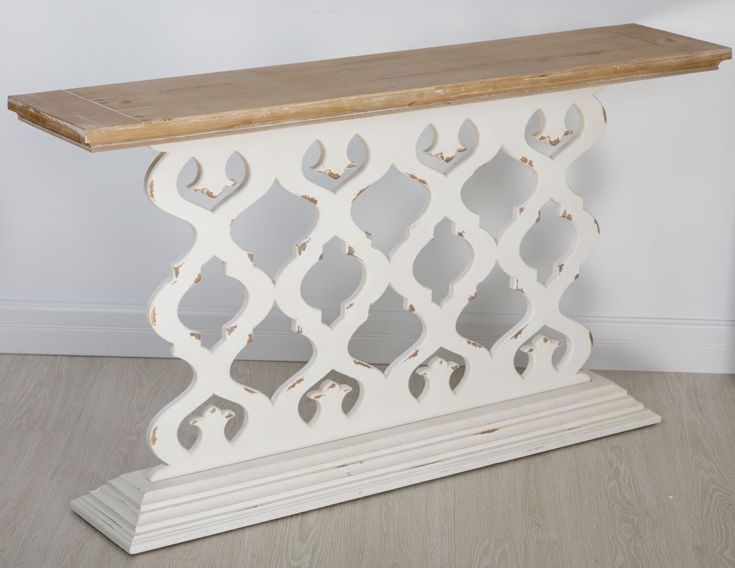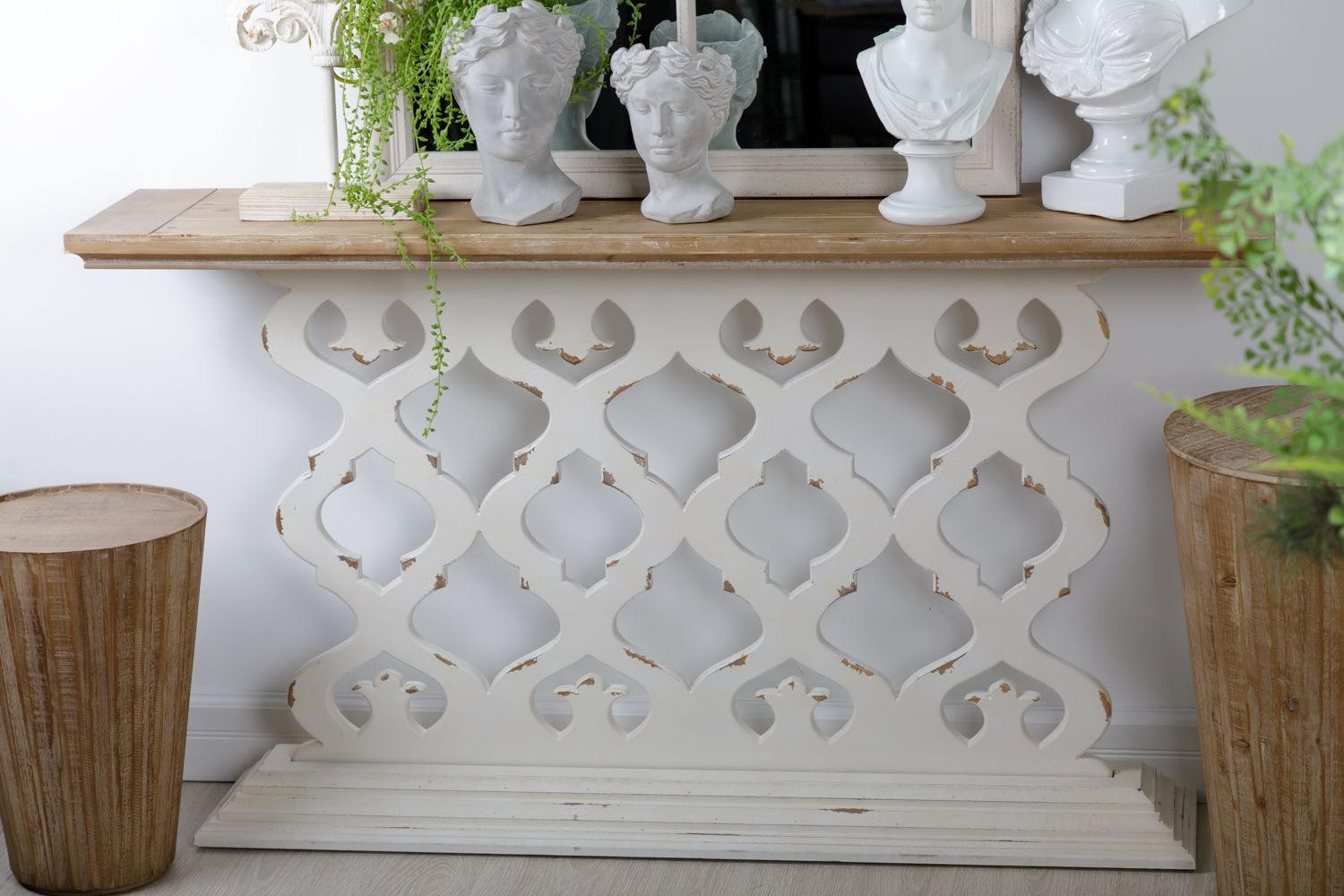 Пристенная консоль создаст величественный античный стиль греческих и римских эпох в вашем доме, изделие можно использовать как самостоятельный декоративный элемент. Уникальная эстетика и гармония этого изделия никогда не потеряют свою актуальность, демонстрируя на своей поверхности элементы декора, цветочные композиции и другие предметы. Поверхностные потертости и неровности с эффектом реставрации, трещины и сколы краски на изделии характеризуют индивидуальный подход к производству каждого предмета, создавая задуманный дизайнером античный образ ушедших эпох.