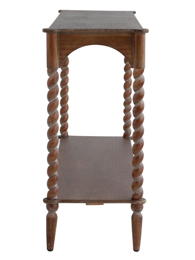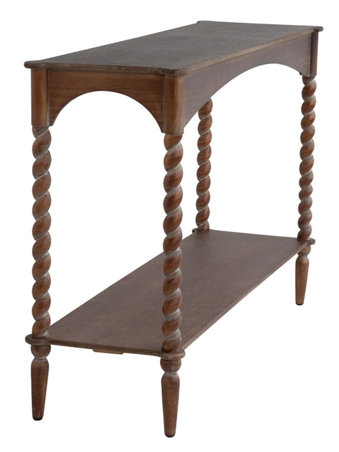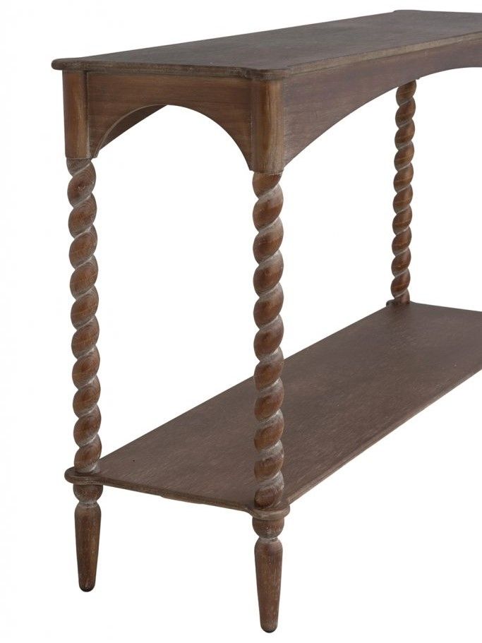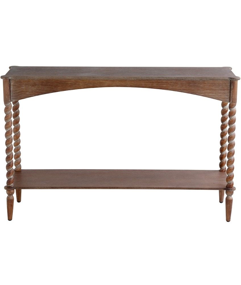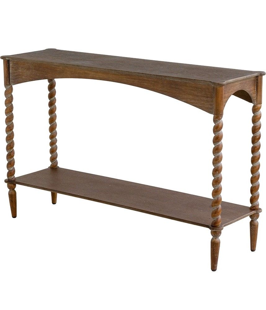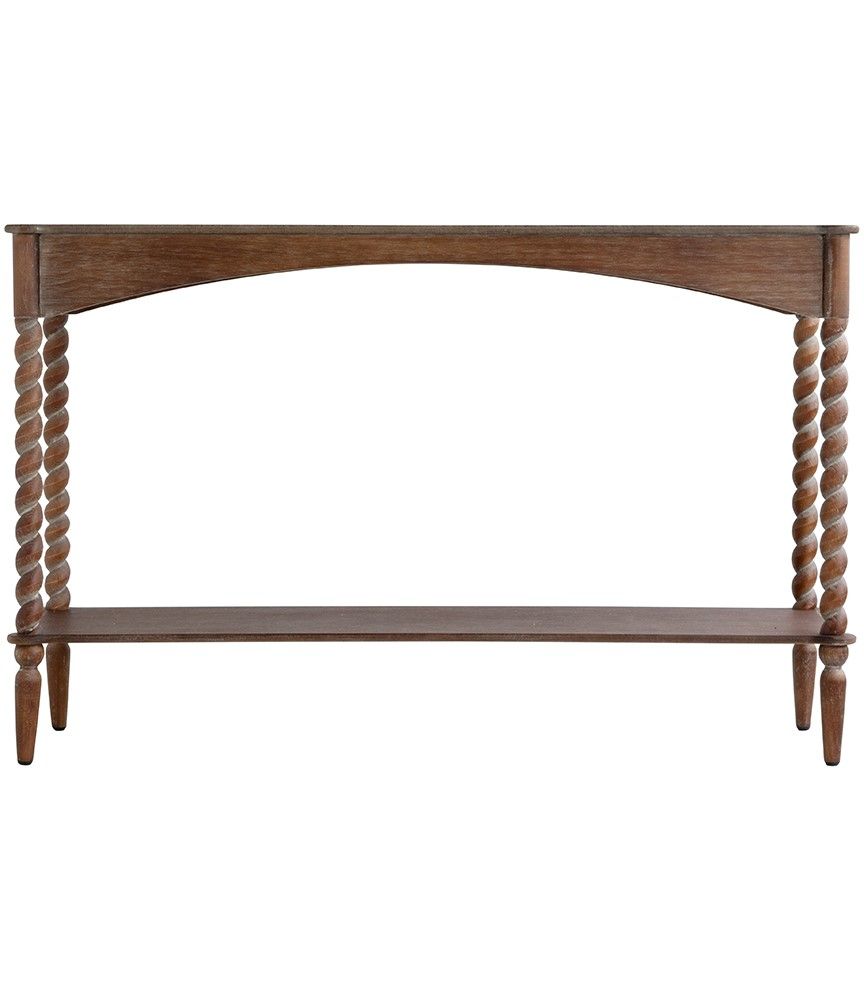 Пристенный консольный столик, вдохновленный винтажными техниками обработки натурального дерева, имеет текстуру коричневого цвета, четыре элегантные резные ножки и дополнительную нижнюю полку для хранения или демонстрации любимых предметов. Изготовленный из прочной древесины ели и сосны, отличается исключительной долговечностью и устойчивостью, что гарантирует долгое служение в любом доме. Чистые линии, натуральная текстура и длинный узкий силуэт консоли идеально впишется в интерьеры в стиле кантри, традиционный, дворянский или переходный.