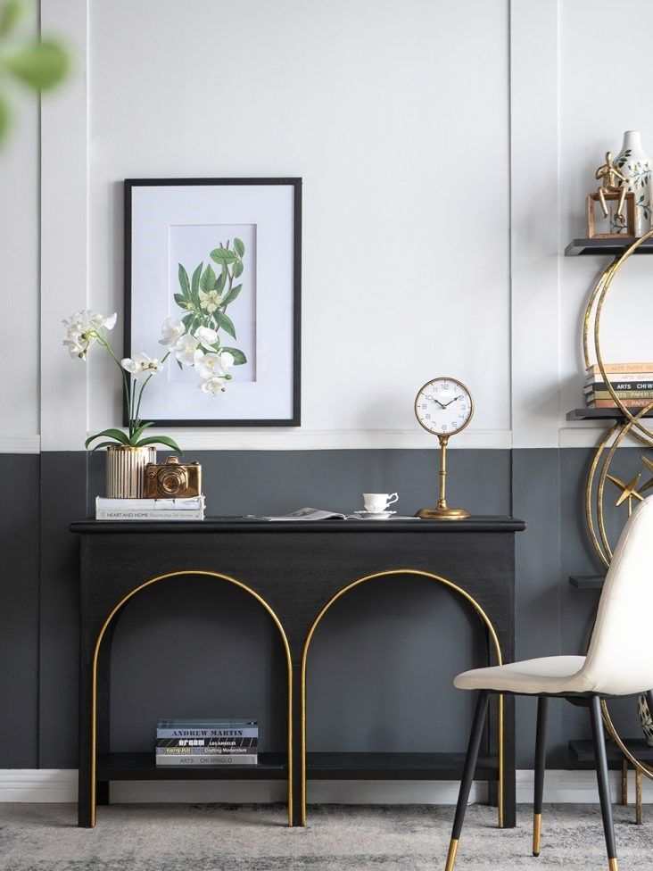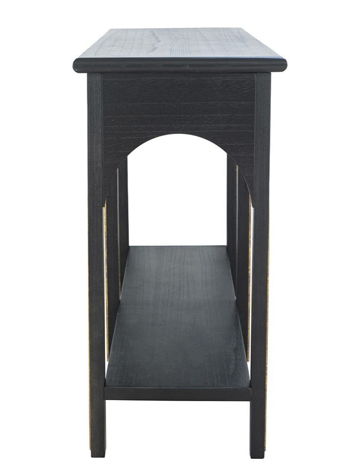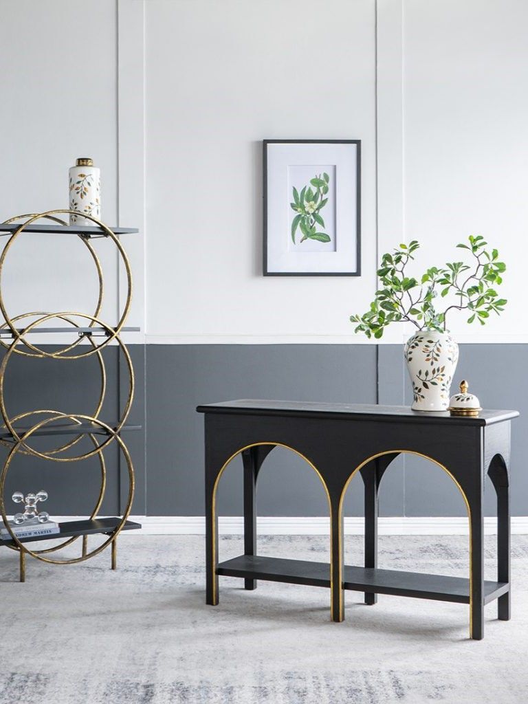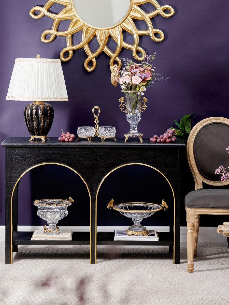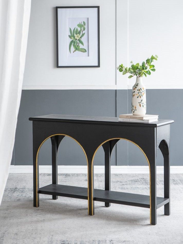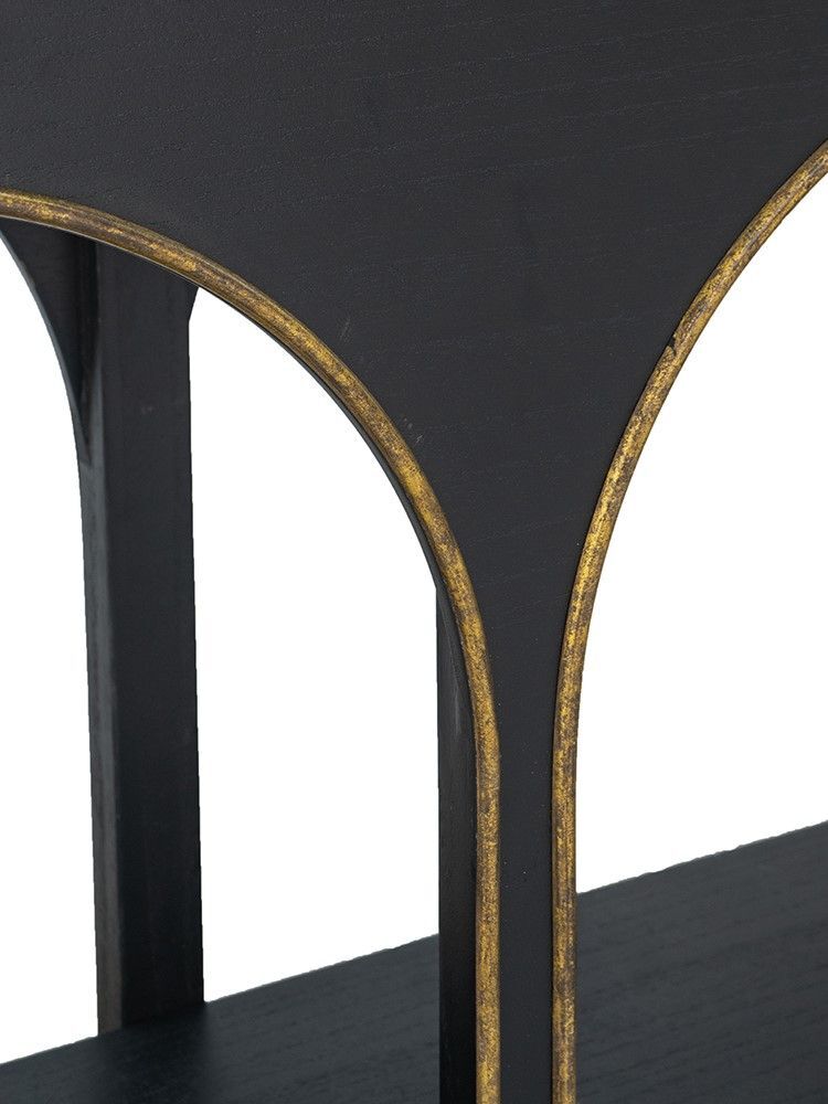 Консольный стол, как элегантный образец современного дизайна, может похвастаться удобной прямоугольной поверхностью, длинной нижней полкой и шестью прочными ножками, которые образуют две привлекательные арки. Придавая легкий контраст, штрихи золотистых оттенков выделяются на фоне массивного черного дерева, благодаря чему этот предмет привлечет внимание гостей из любой комнаты вашего дома. Конструкция из дерева павловнии, известной своей природной прочностью и легким весом, предлагает уникальное сочетание стабильности и долговечности.