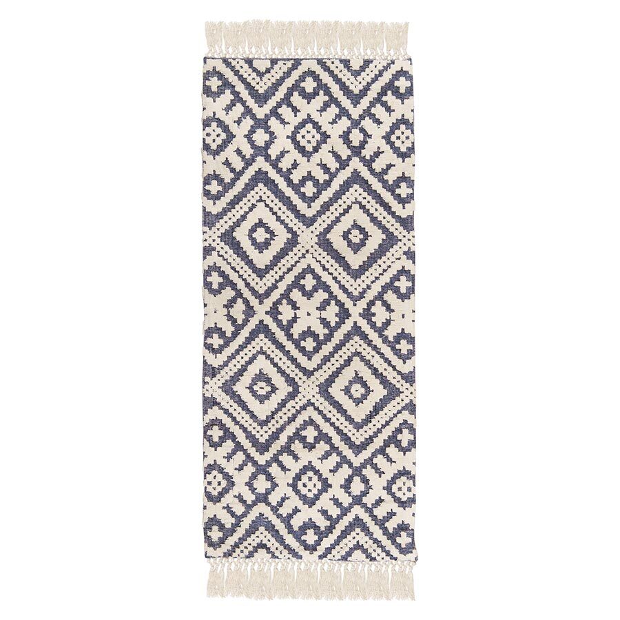 "Ковер из хлопка Jaipur из коллекции Ethnic украшен контрастным геометрическим принтом и бахромой. Он органично впишется в скандинавский стиль или разбавит строгий минимализм. Ковер можно повесить на стену в качестве арт-объекта, поместить на пол возле дивана или кровати. Изделие на подкладке, выполнено из прочного высококачественного хлопка, край с изнаночной стороны укреплен киперной лентой, исключающей деформацию. Ковер представлен в нескольких размерах.