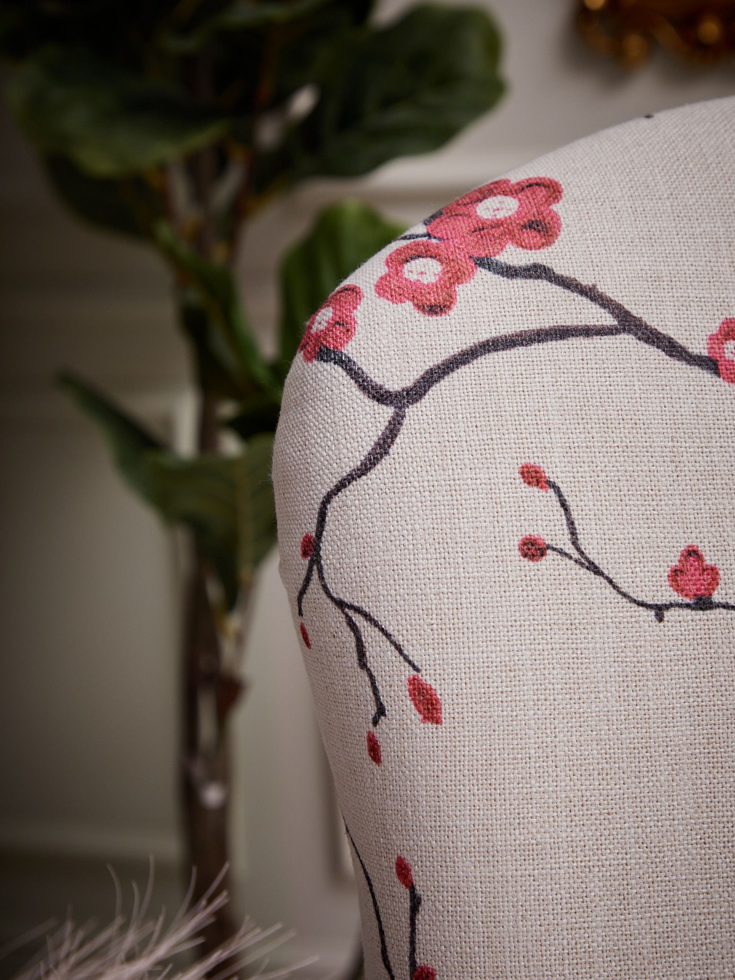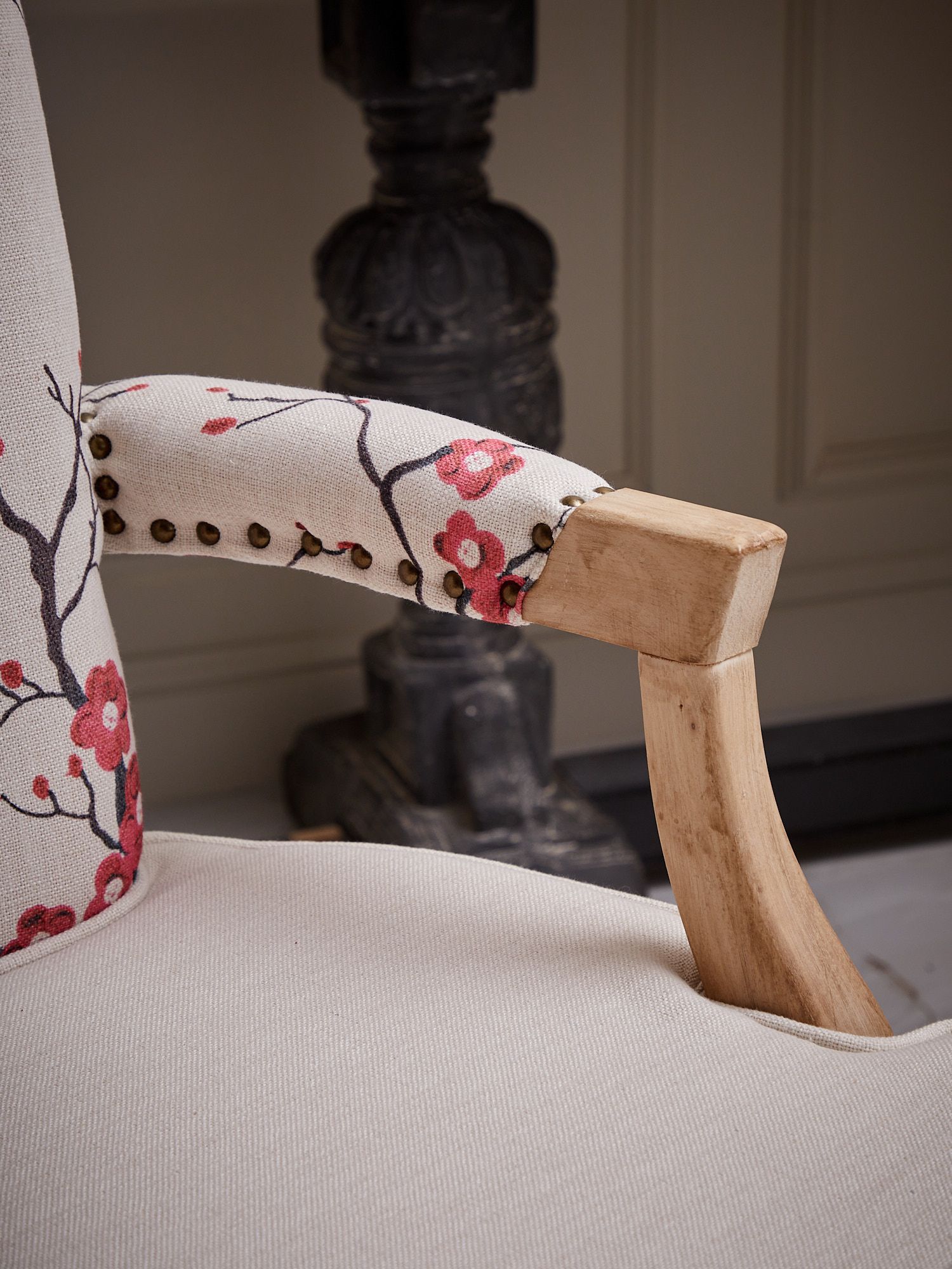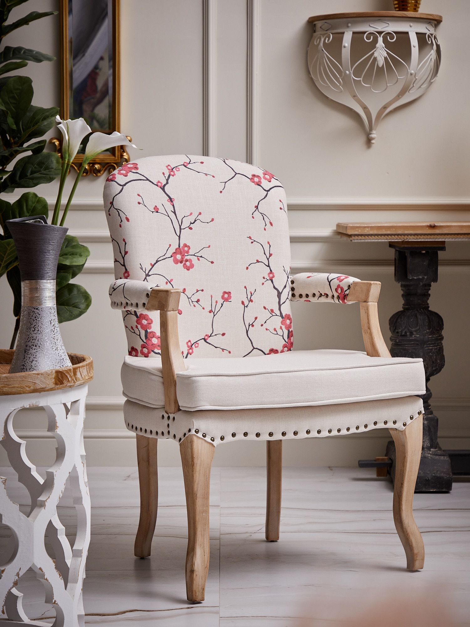 Стильная и классическая модель кресла, выполненная из натурального дерева и льняной ткани с изображением цветущей сакуры. Обивка выполнена в светлых тонах, что подарит интерьеру ощущение легкости и спокойствия. Подлокотники имеют комфортные и мягкие накладки из ткани. Поверхность деревянного каркаса выполнена с признаками искусственного состаривания и декорирована тонким слоем матового лака, тем самым визуально подчеркивая принадлежность к ручной работе.