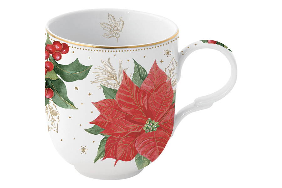 Кружка, 350 мл, фарфор P, белая, с золотистым кантом, Пуансеттия и ягоды, Poinsettia and berries