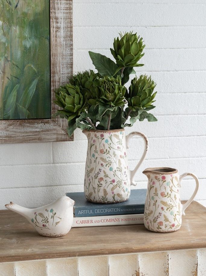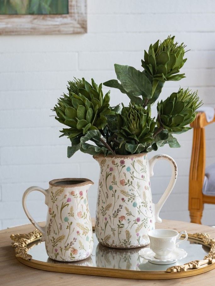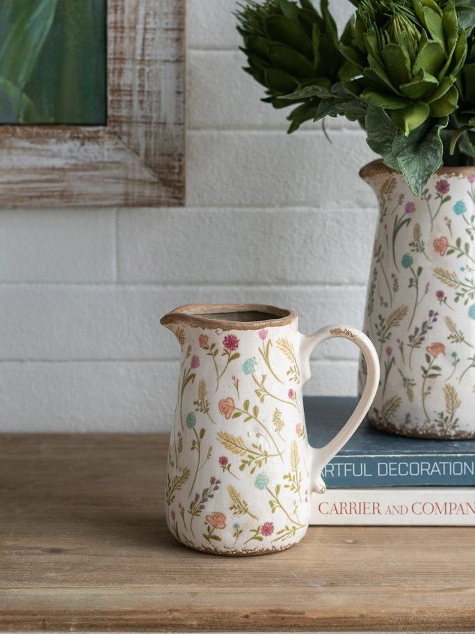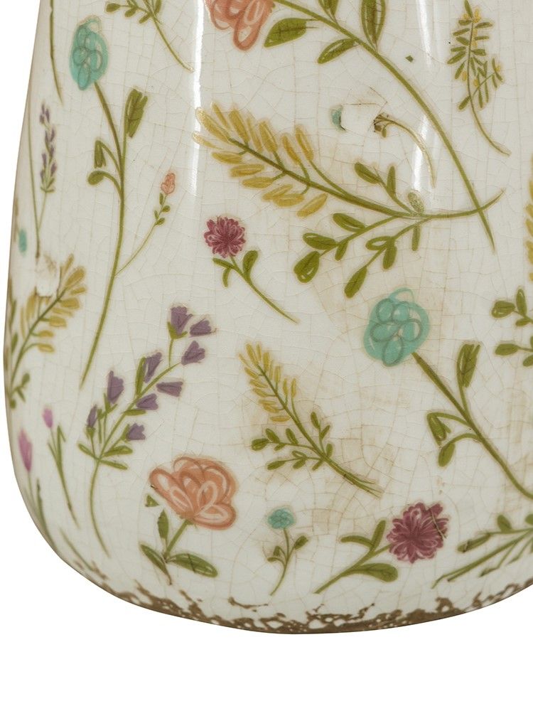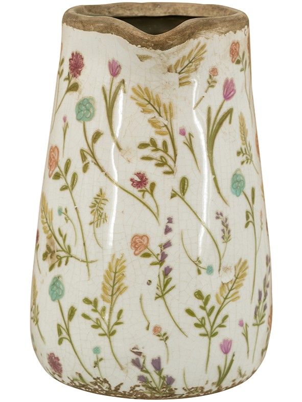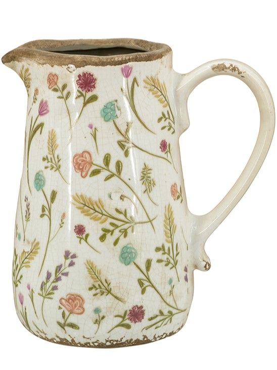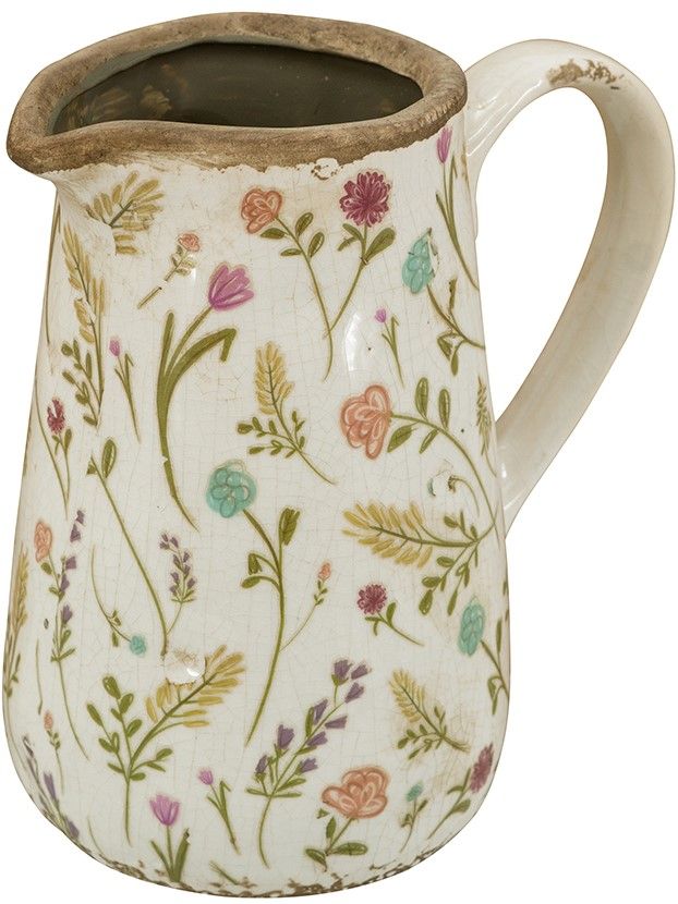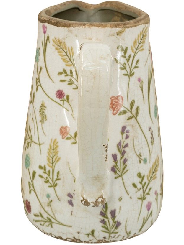 Декоративный кувшин, как эффектное изделие в деревенском стиле, имеет состаренную белую поверхность, текстурированный край возле горлышка и украшен разноцветными цветочными мотивами. Уютная цветовая гамма и потертые детали позволяют изделию гармонично вписываться в интерьеры в стиле кантри, рустикальный, традиционный и шебби-шик.