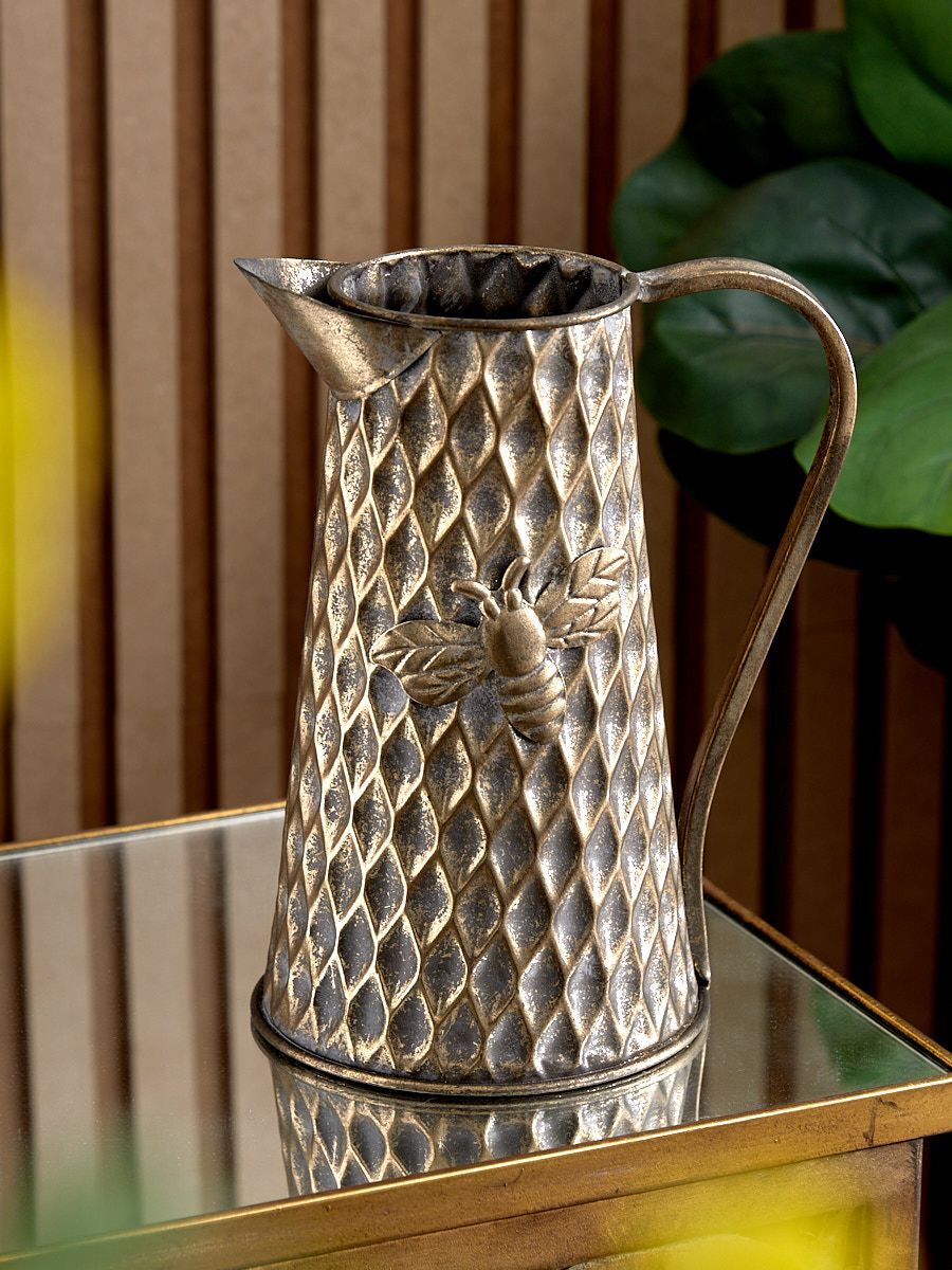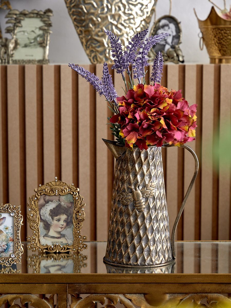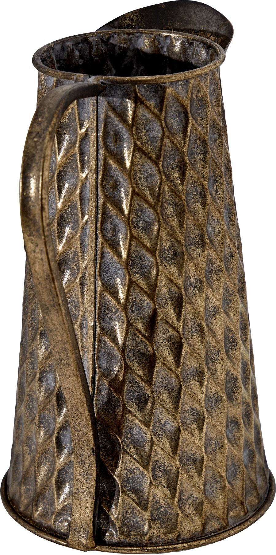 Декоративный кувшин Конго, выполненный из металла с напылением золотистого цвета и фактурной отделкой на корпусе. Растения из сухоцветов, размещенные в этом кувшине, создадут необычный образ в вашем интерьере. Эксклюзивные формы и фактуры навеяло богатство культуры Африки, множество художественных традиций и таинственная атмосфера, окутывающая неподражаемостью. Изделие имеет признаки искусственного состаривания, поверхность декорирована с эффектом патинирования, а наличие сварочных швов подчеркивают принадлежность к ручной работе.