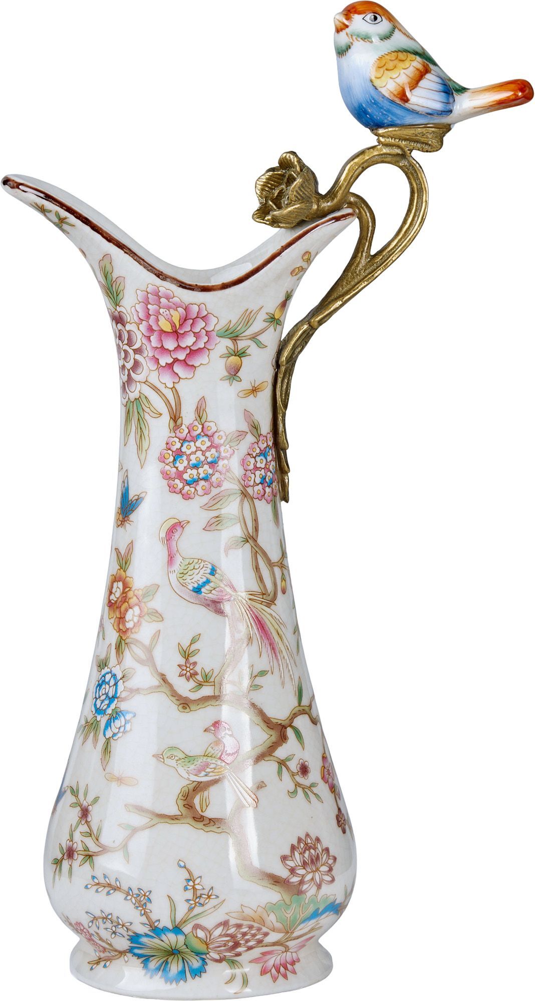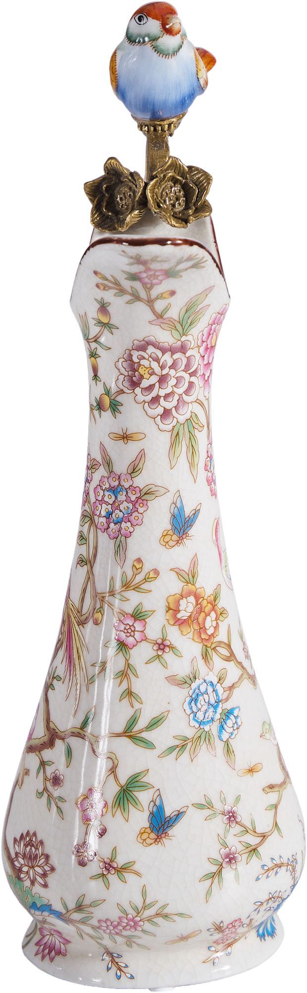 Кувшин с птичкой, выполненный из фарфора с бронзовыми элементами. Уникальное изделие ручной работы. При производстве этих художественных изделий из фарфора с бронзой используются вековые традиции китайских мастеров. Видимые трещинки (кракелюры) делаются по уникальной технологии, что придает более благородный вид старинного изделия.