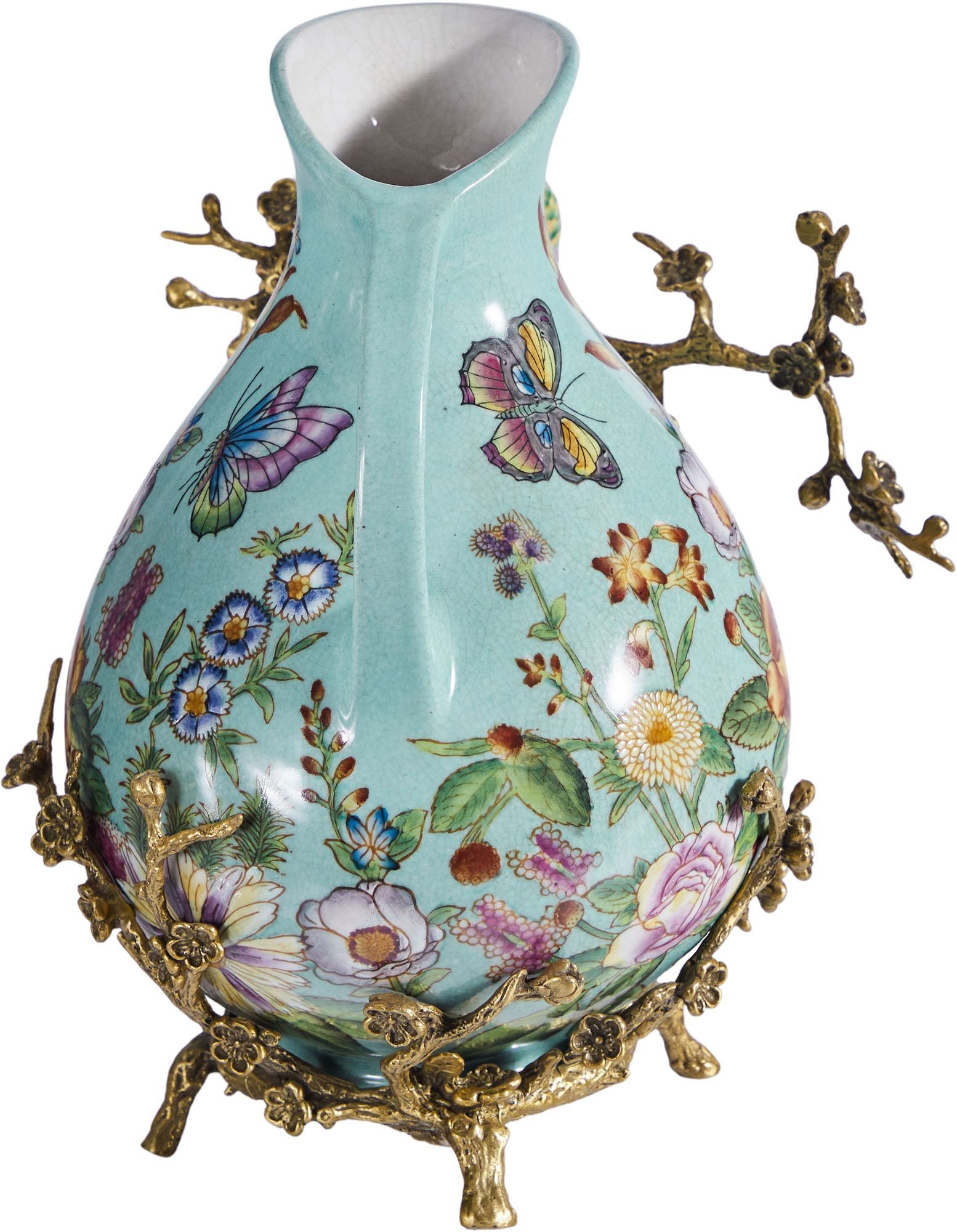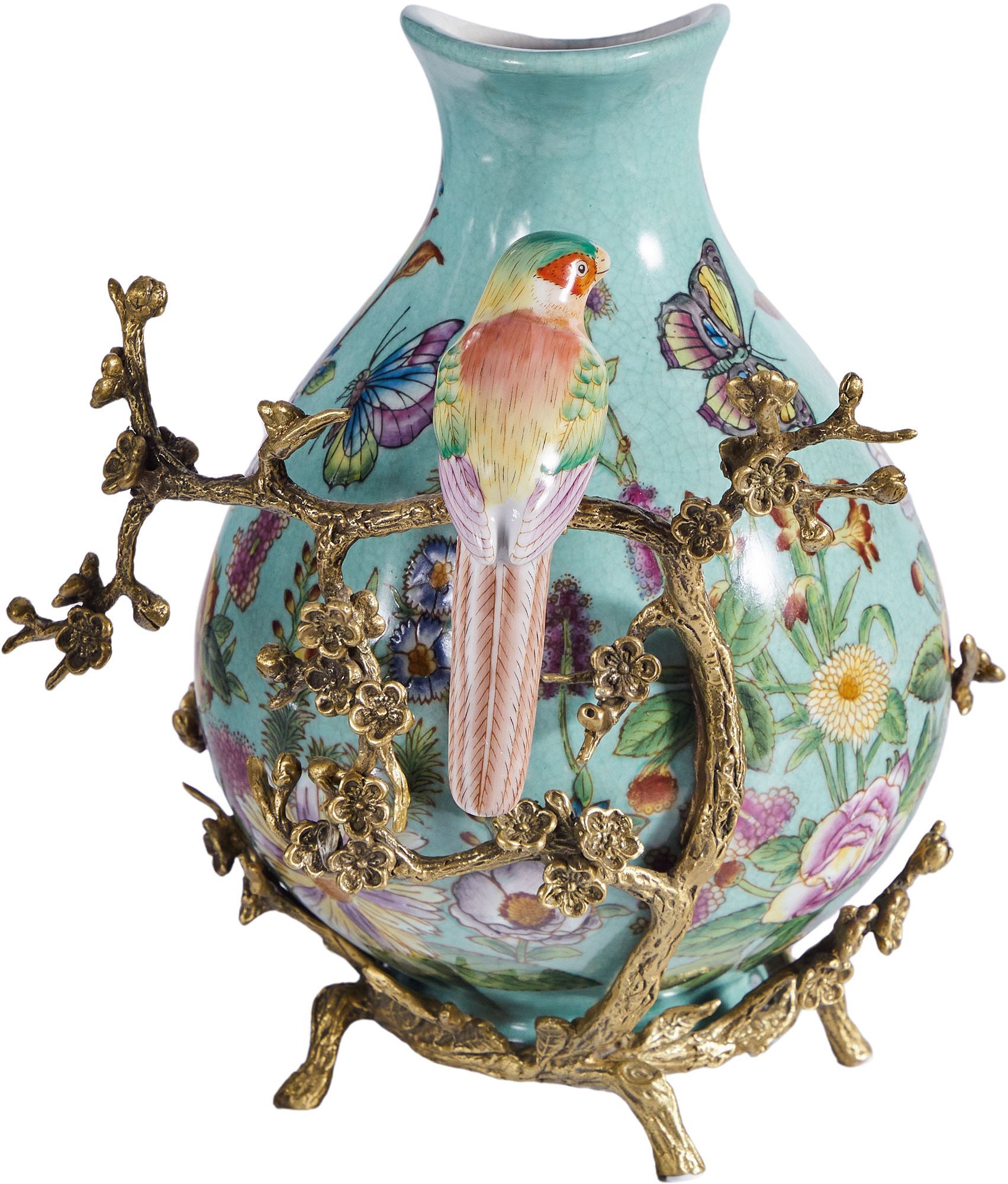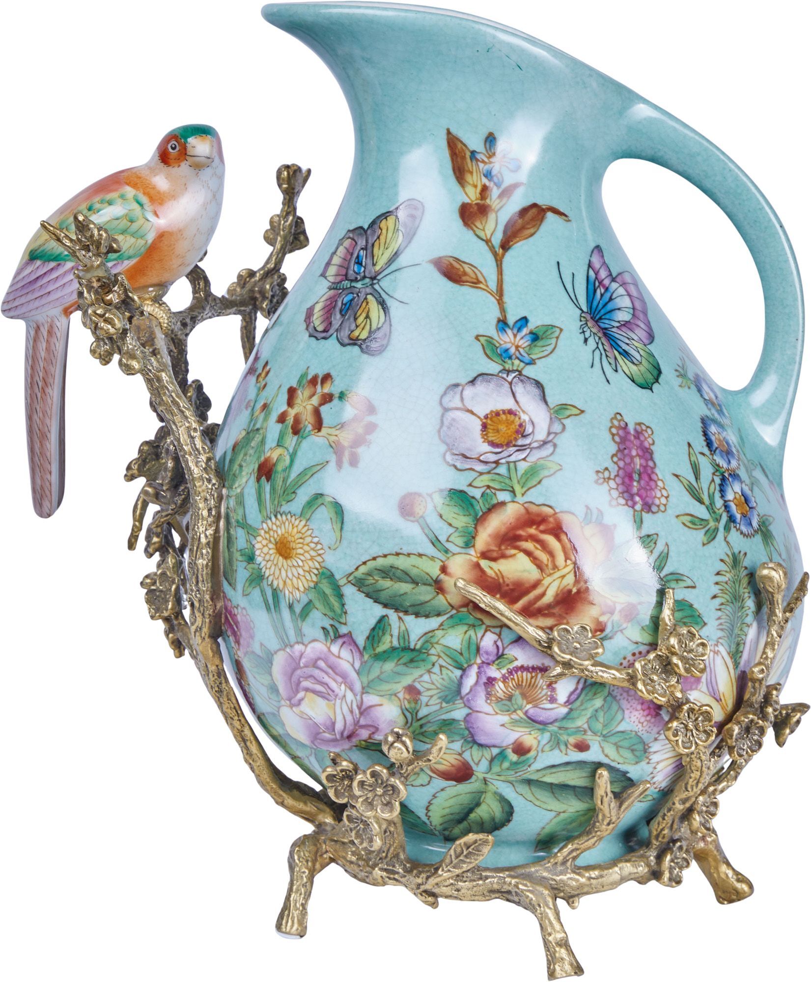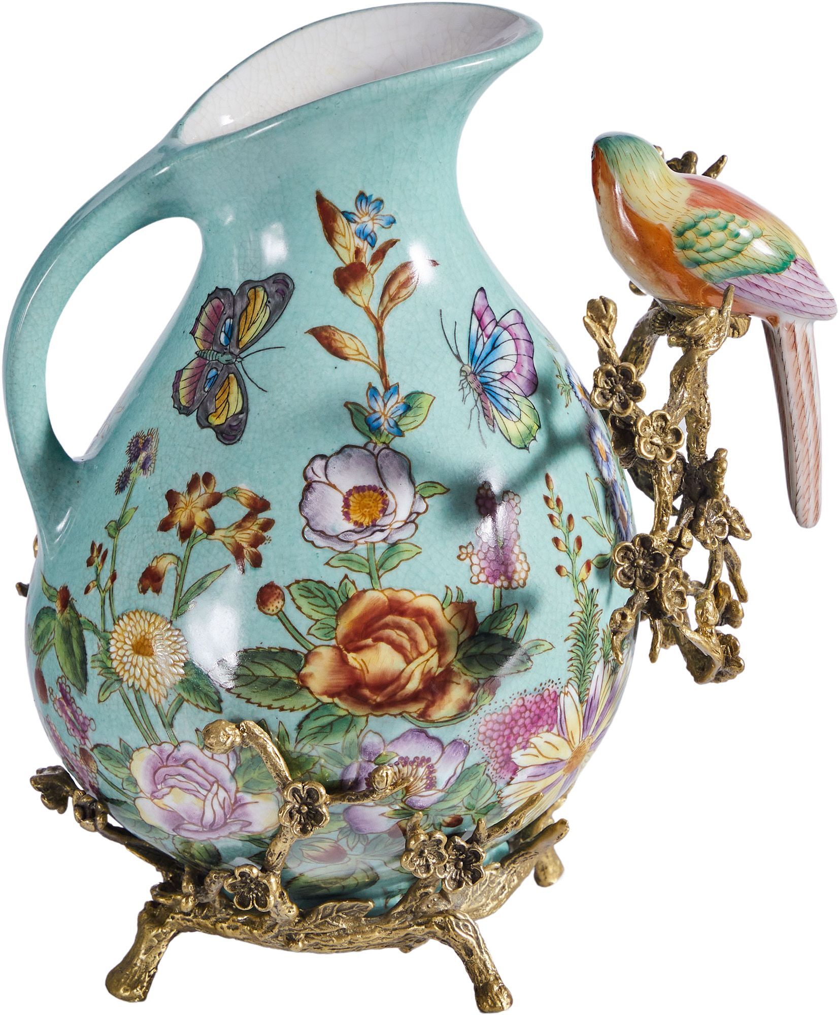 Кувшин с птичкой, выполненный из фарфора с бронзовыми элементами. Уникальное изделие ручной работы. При производстве этих художественных изделий из фарфора с бронзой используются вековые традиции китайских мастеров. Видимые трещинки (кракелюры) делаются по уникальной технологии, что придает более благородный вид старинного изделия.