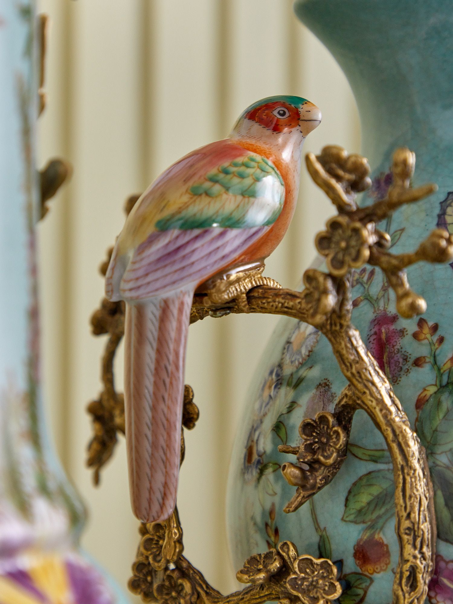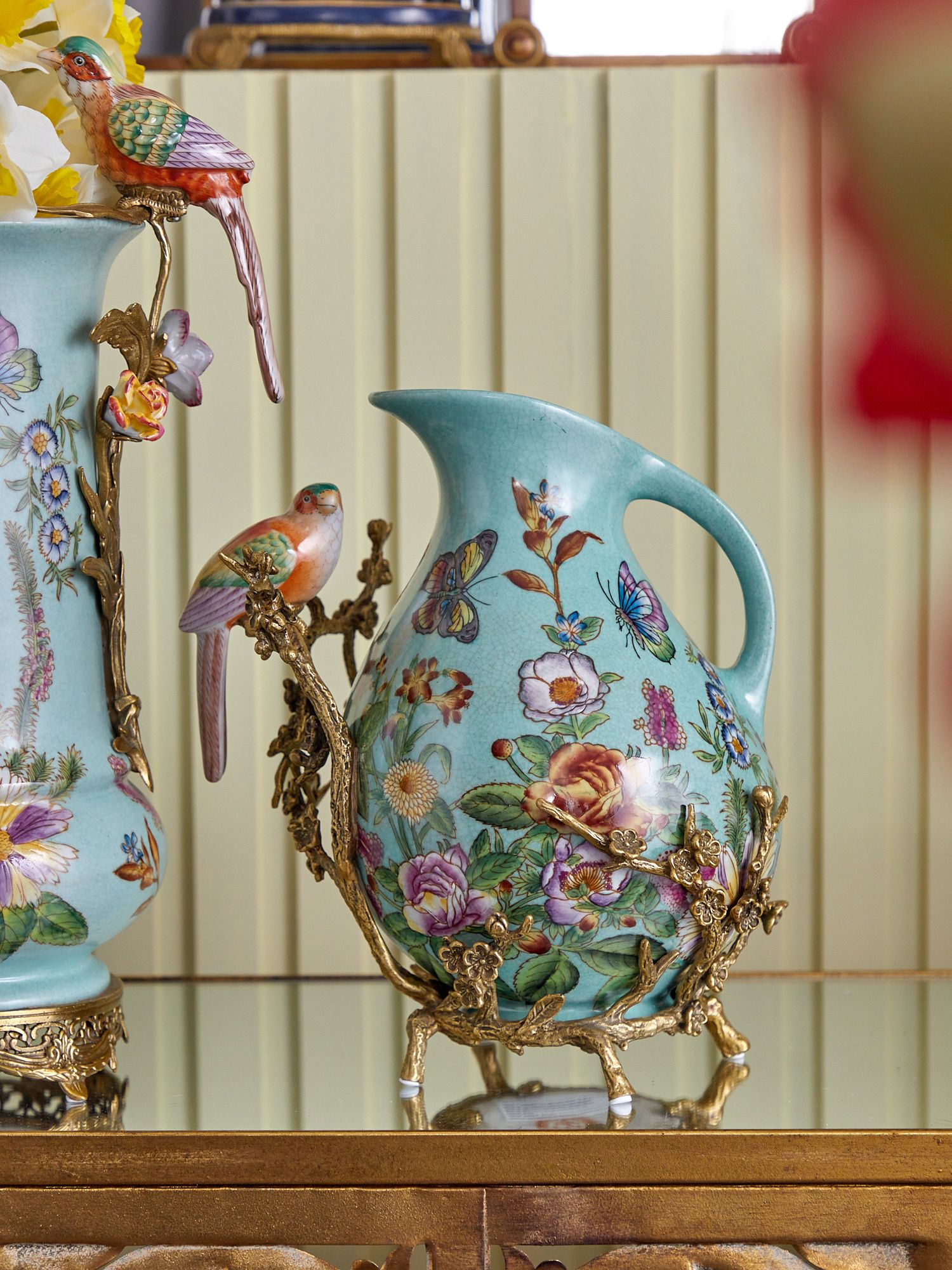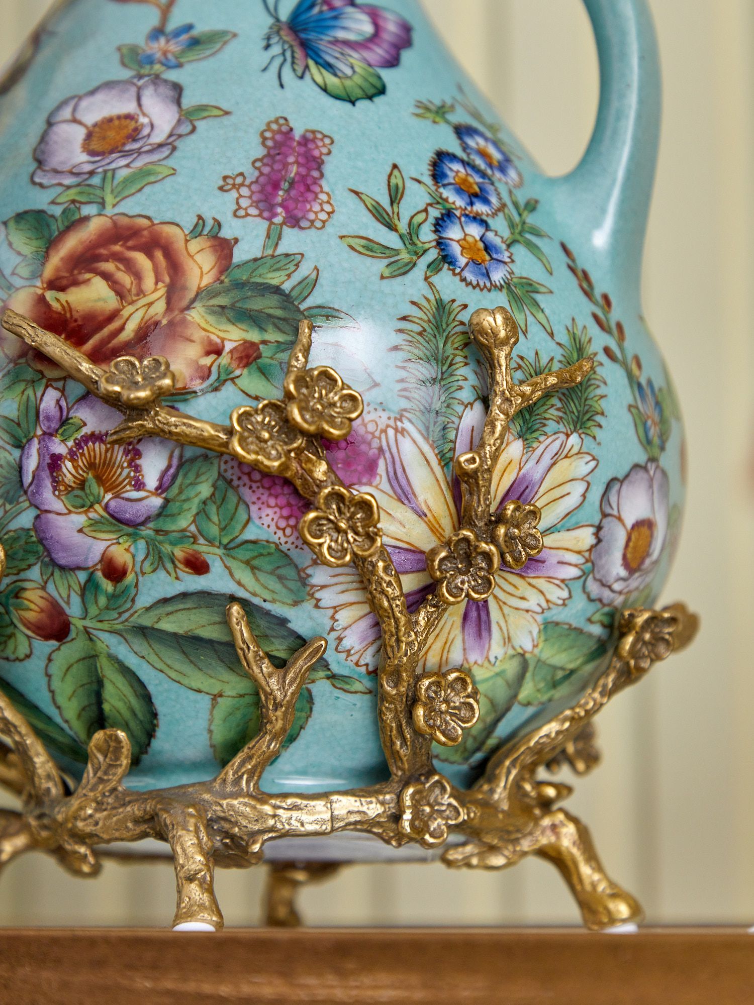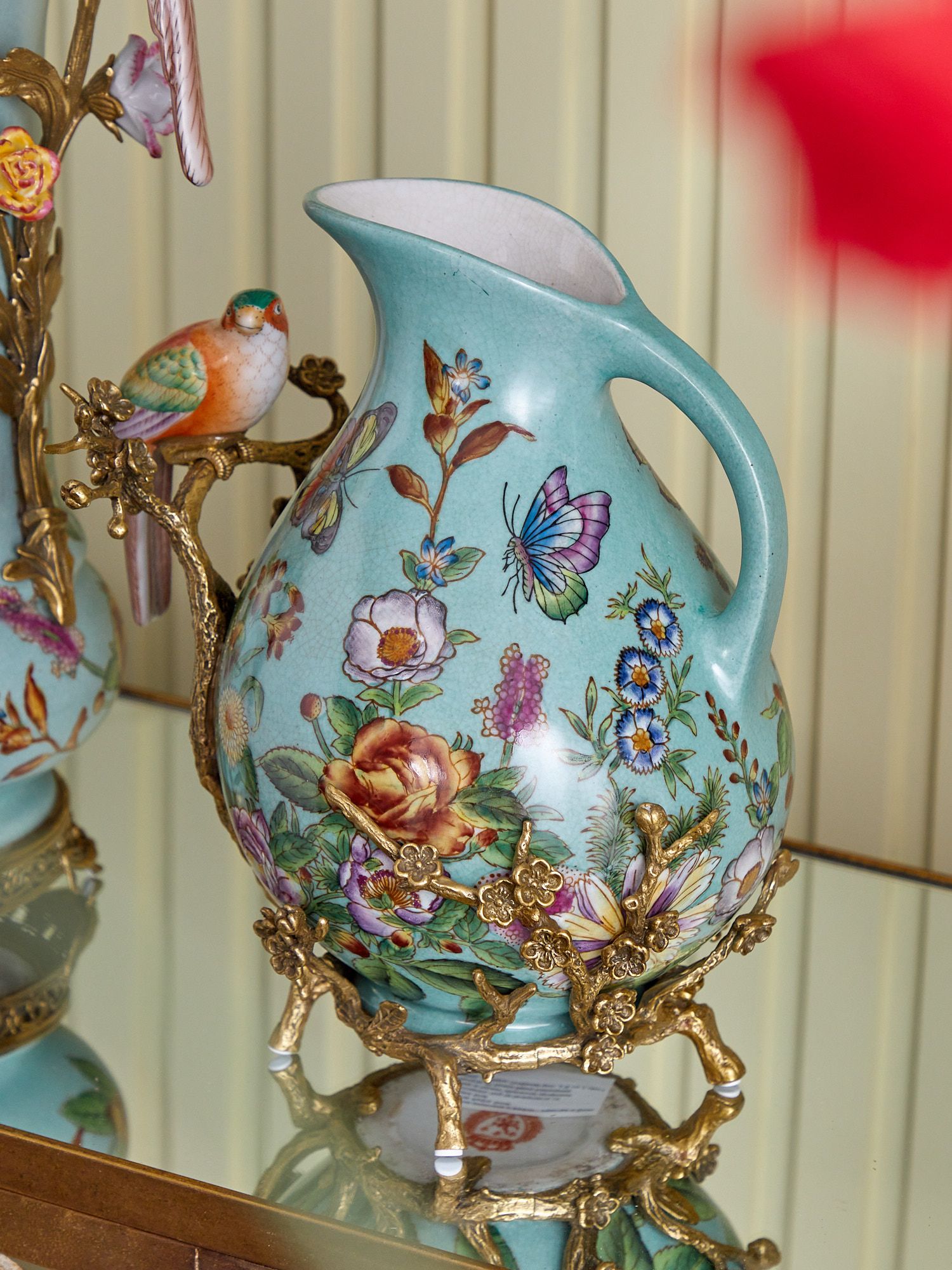 Кувшин с птичкой, выполненный из фарфора с бронзовыми элементами. Уникальное изделие ручной работы. При производстве этих художественных изделий из фарфора с бронзой используются вековые традиции китайских мастеров. Видимые трещинки (кракелюры) делаются по уникальной технологии, что придает более благородный вид старинного изделия.