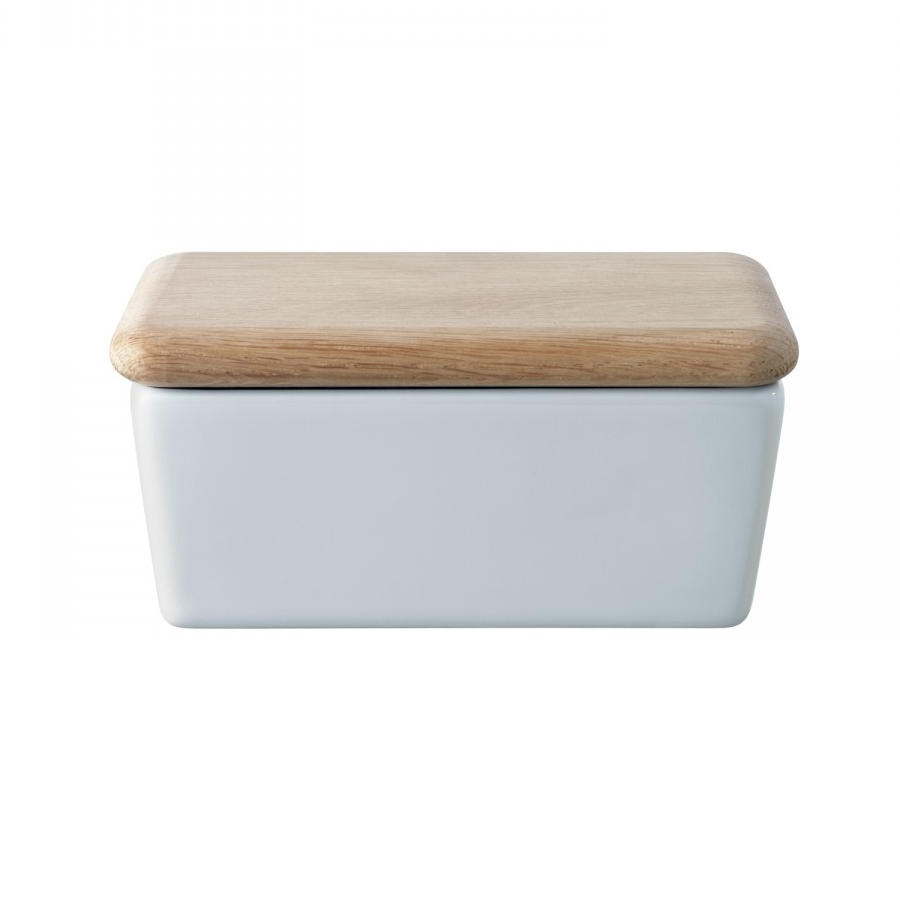 "Масленка из белого фарфора с дубовой крышкой прекрасно подойдет как для ежедневного использования, так и для торжественных мероприятий. Она упакована в красивую коробку и может стать приятным и памятным подарком.
