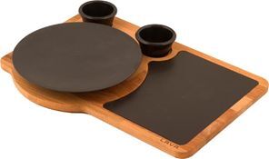 Мини блюдо на деревянном подносе с чугунной панелью(ø)21cm. (не включает соусники)