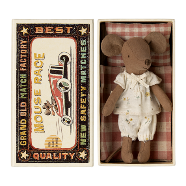Милая мышка - сестричка от датского производителя игрушек Maileg живет в спичечном коробке, где есть комплект постельных принадлежностей для сладкого сна. Мышка одета в уютную пижаму и готова к ночному сну в своей кроватке. Соберите всю мышиную семью: мама, папа, мышонок - братишка, мышки - близнецы и окунитесь в увлекательный мир игры. Мышки изготовлены из приятного хлопка, все детали мордочки аккуратно вышиты. Взрослые мышки и мышки – дети отличаются по размерам.