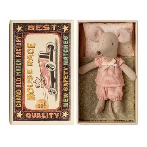 Мышка младшая сестра Maileg готова к многочасовым играм и спокойно спит в своей маленькой коробочке из-под спичек. Одежда и постельное белье изготовлены из мягких тканей с уникальными принтами красивых оттенков. В лапках мышки есть магниты.