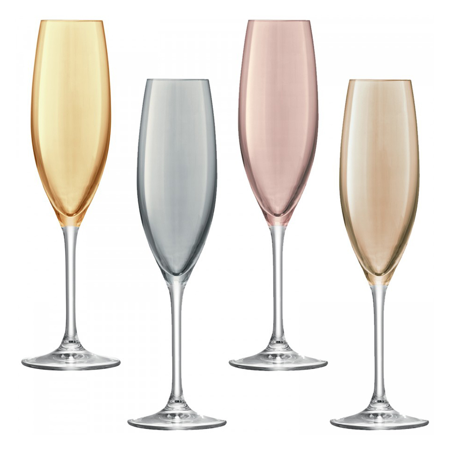 "Разноцветные бокалы для шампанского Polka с металлическим блеском — сочетание элегантности, гламурного винтажа и безупречного качества. Каждый бокал создан из выдувного стекла и раскрашен вручную. Набор привнесет в любую сервировку свежие краски. Сет упакован в красивую коробку.