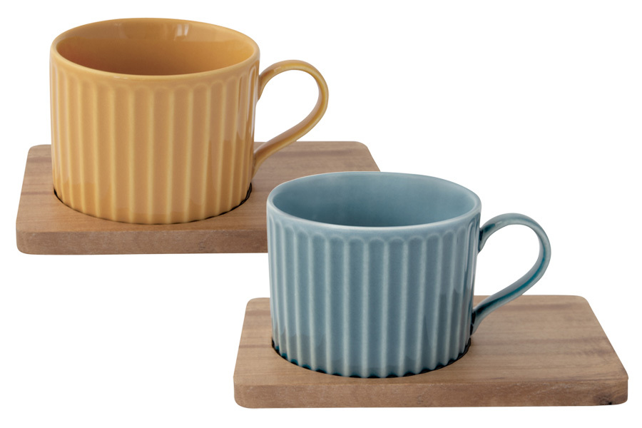 Чашка синяя 0,25 л - 1 шт, чашка желтая 0,25 л - 1 шт, подставка из акации 15,5х9,5 см - 1 шт