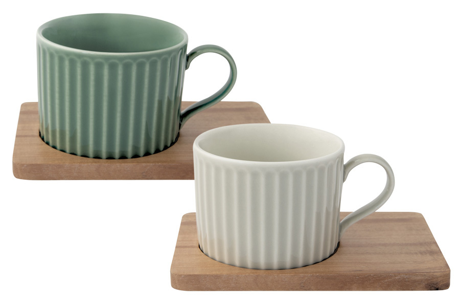Чашка зелёная 0,25 л - 1 шт, чашка светло-серая 0,25 л - 1 шт, подставка из акации 15,5х9,5 см - 1 шт